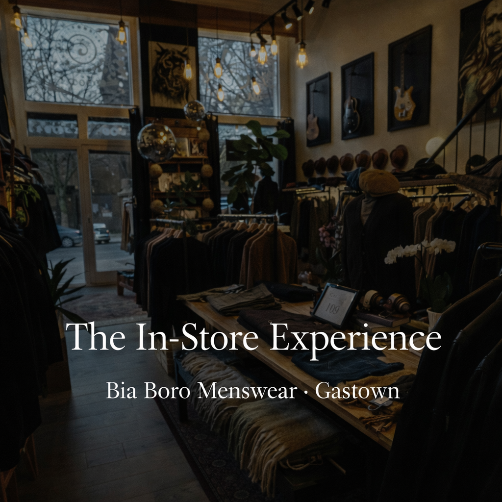 Bia Boro Menswear is more than a shop — it’s a space to slow down, explore, and be styled with intention. Visit us in the heart of Gastown for a hands-on experience where fit, fabric, and personal style come together. Whether you’re refining your everyday wardrobe or searching for something distinctive, our in-store experience is designed to feel relaxed, personal, and inspiring.