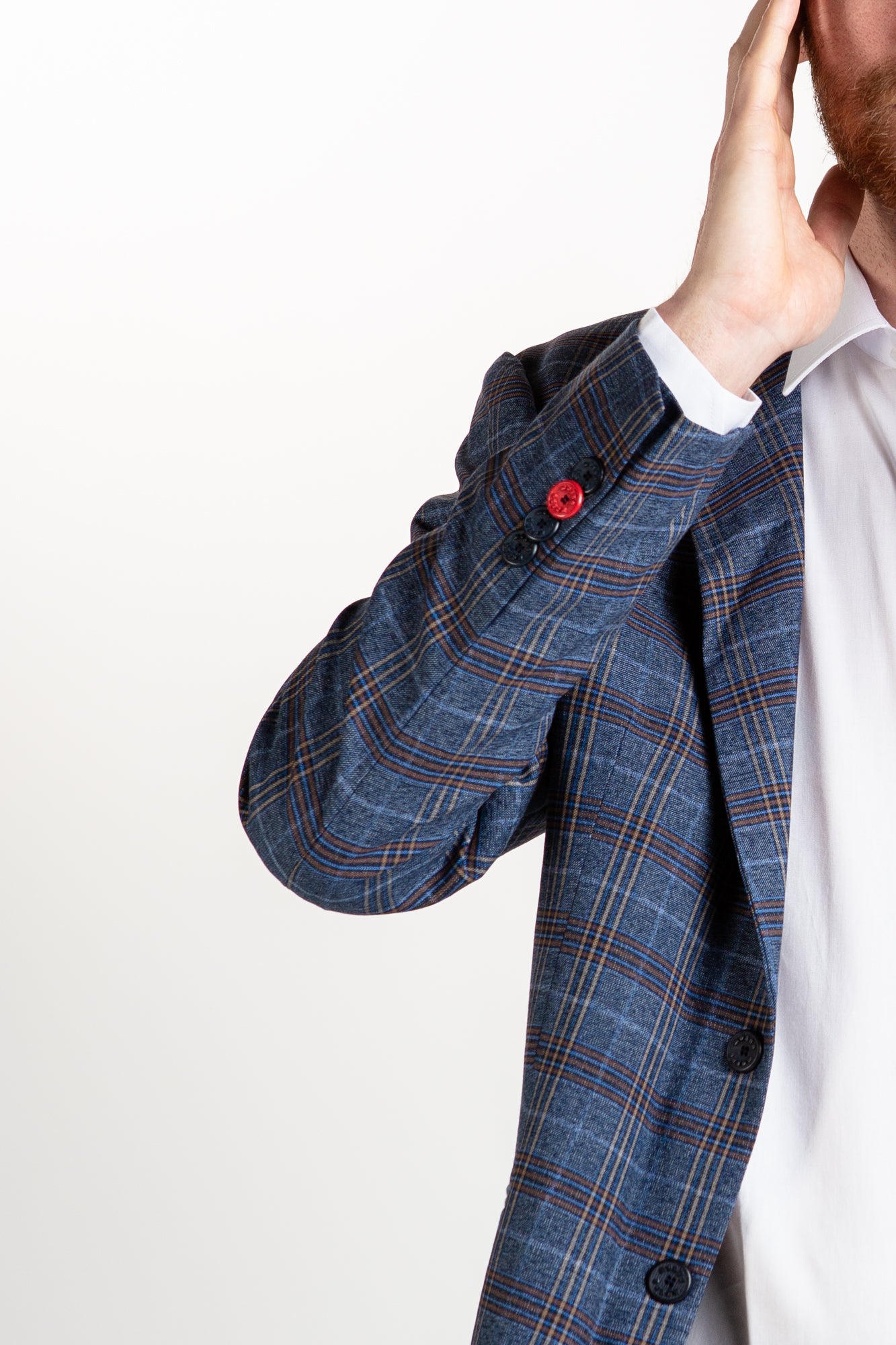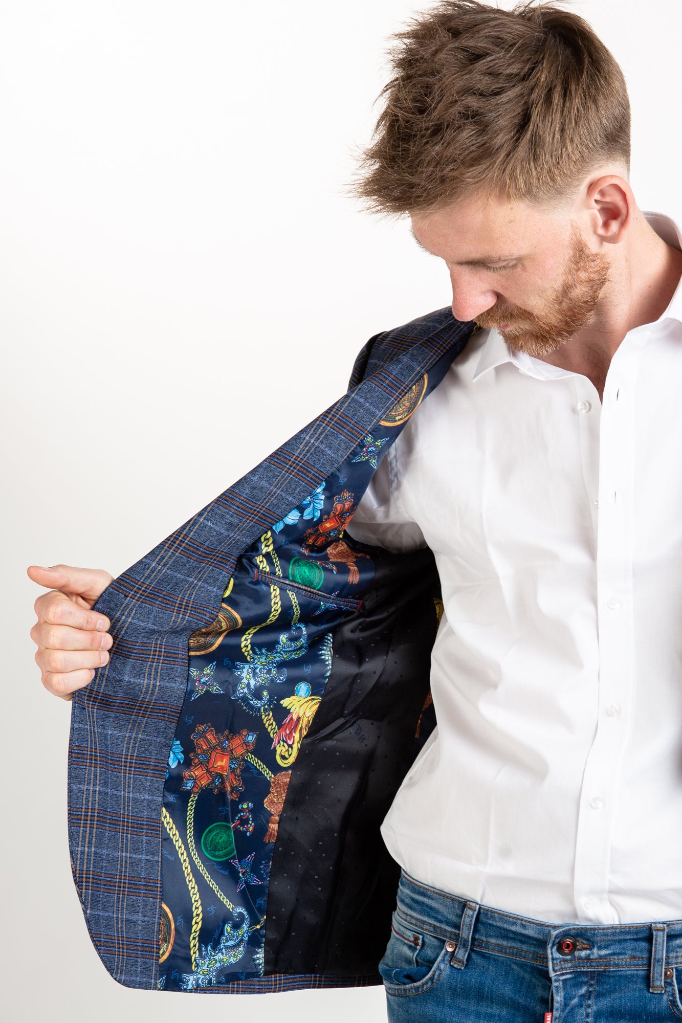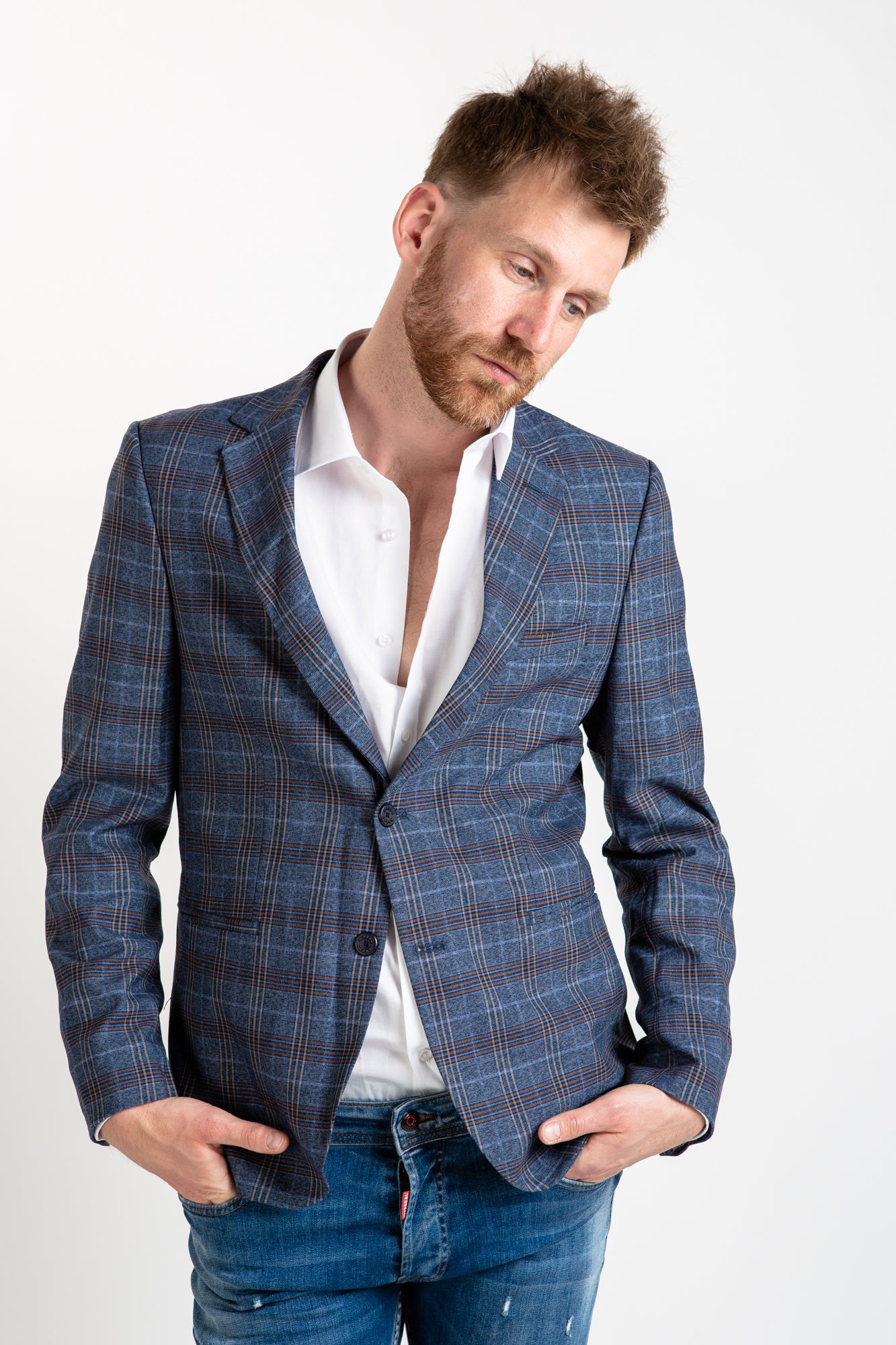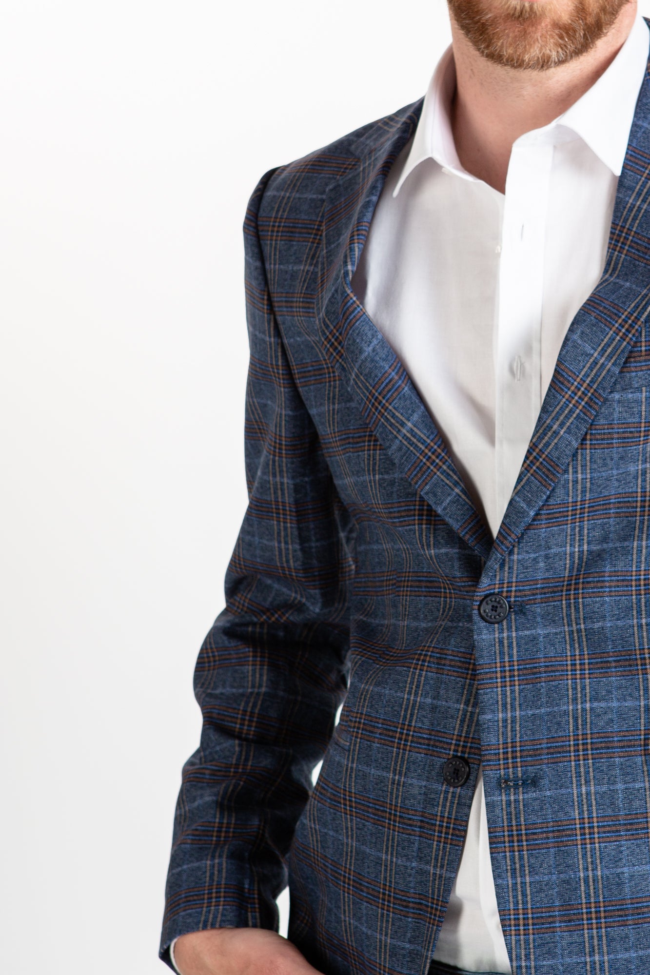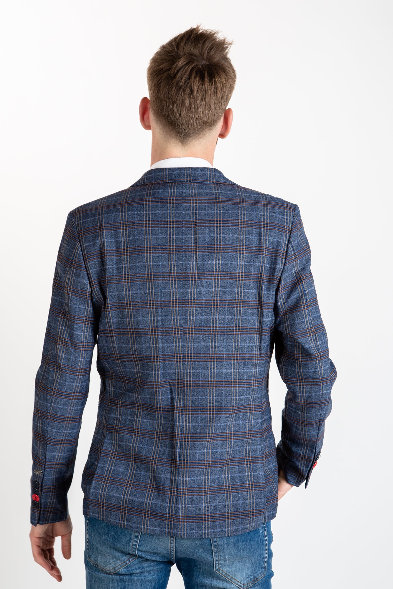 Modernize your wardrobe with this classic Italian-style light navy blazer. It features a checkered pattern, intricate lining, and a tailored fit, ideal for both casual and formal occasions. Upgrade your style with this timeless piece.