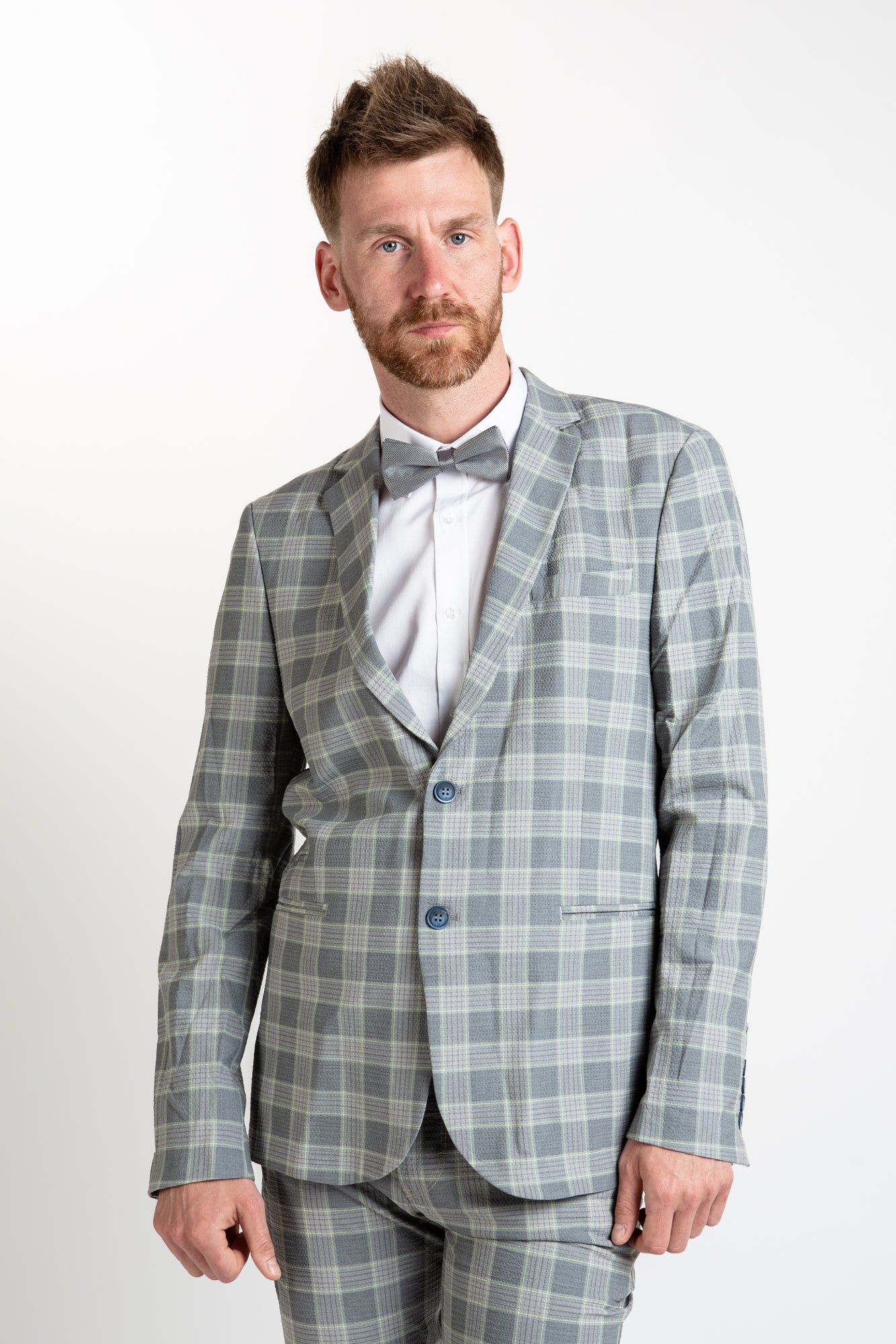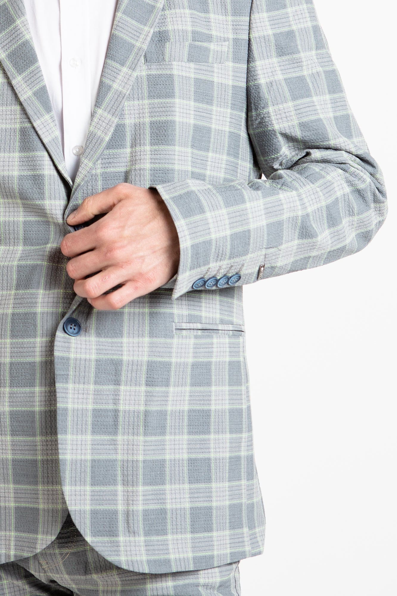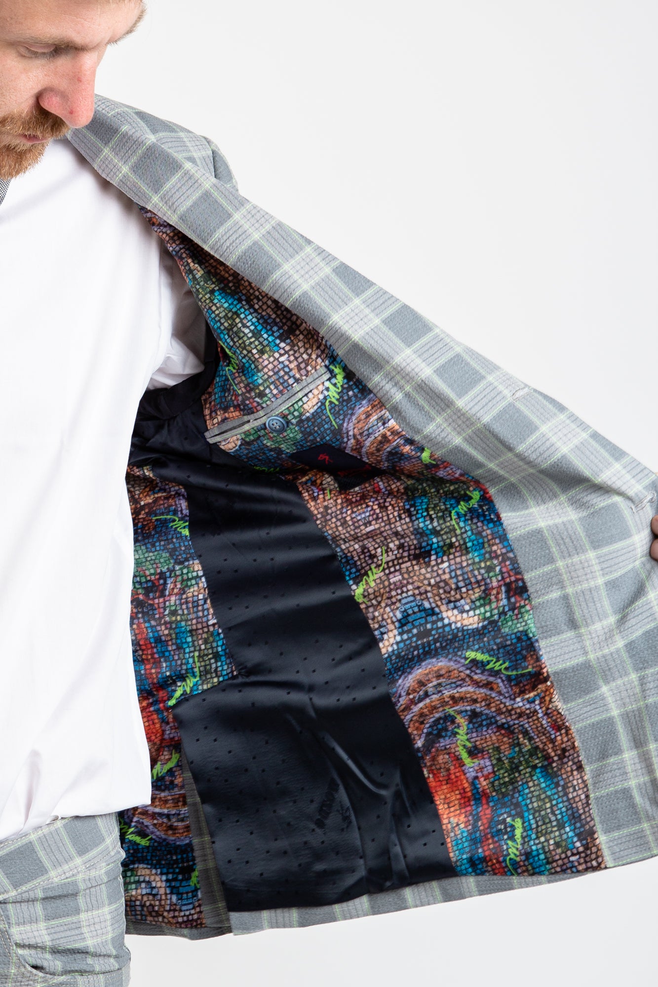 This blazer adds a stylish twist to traditional formalwear. Crafted from checkered grey Italian fabric, this fitted blazer offers a funky, yet sophisticated look with two button closure and intricate lining print. Perfect for both work and leisure.