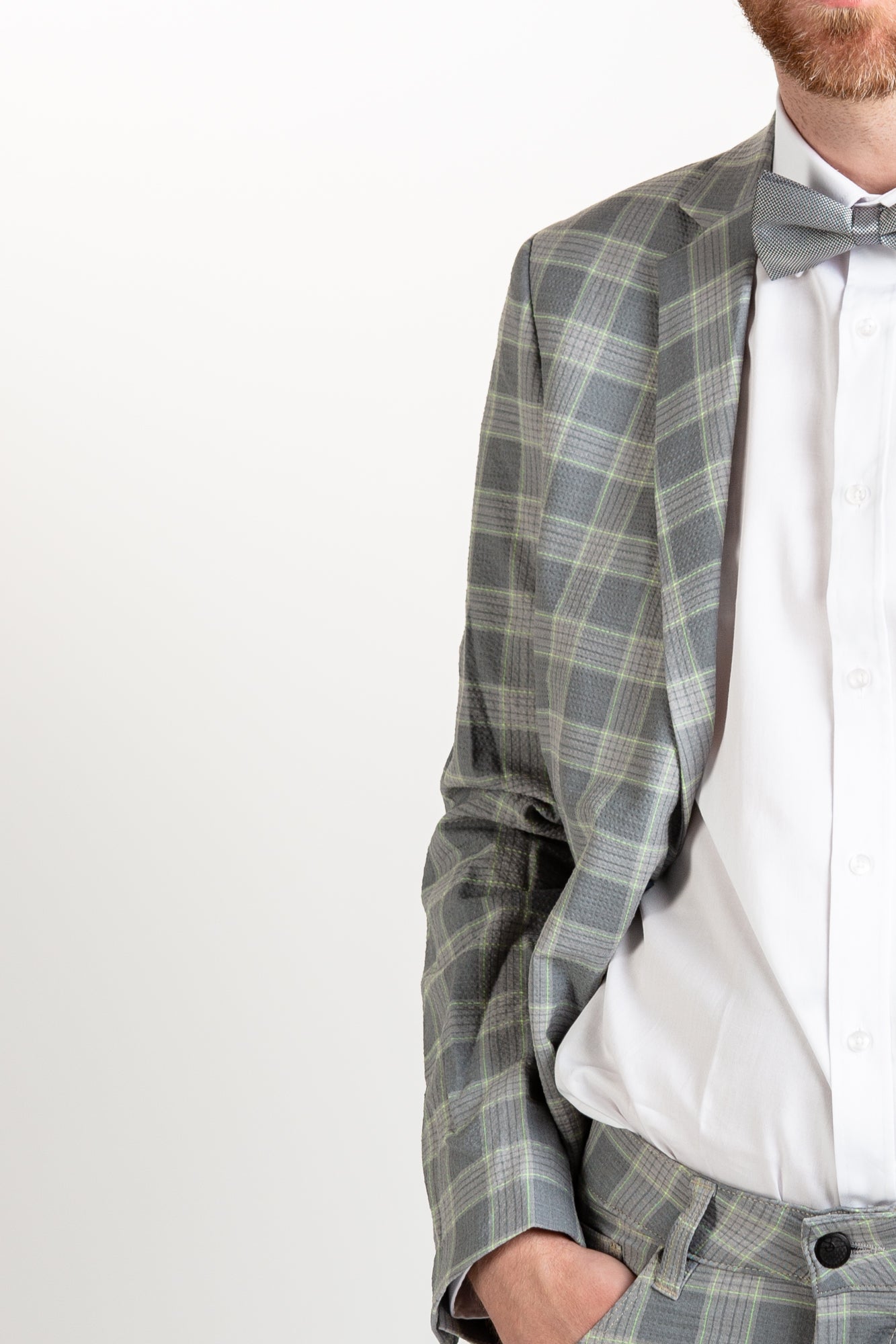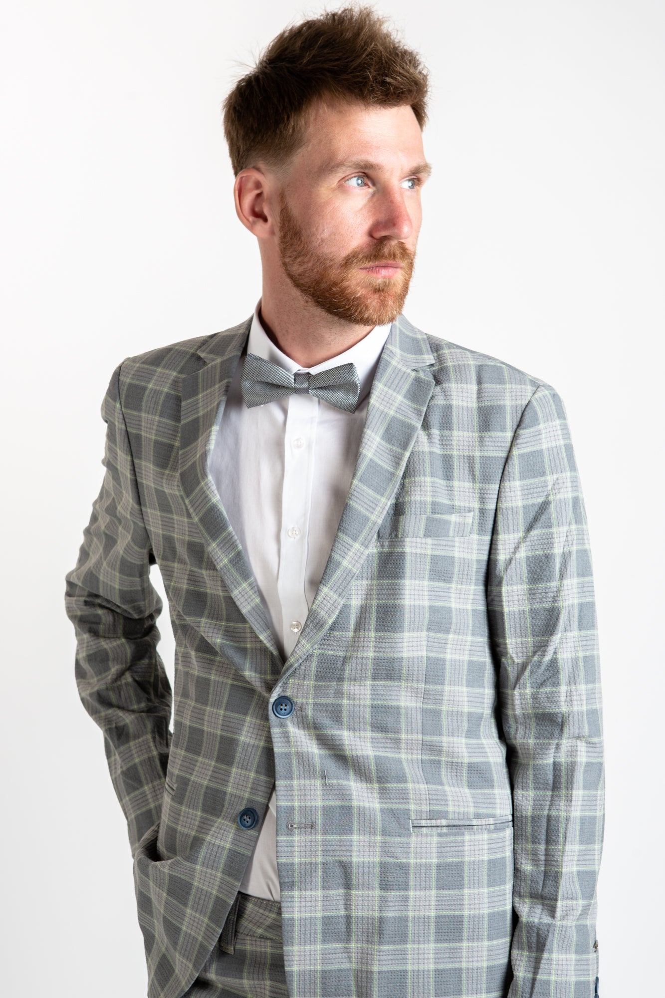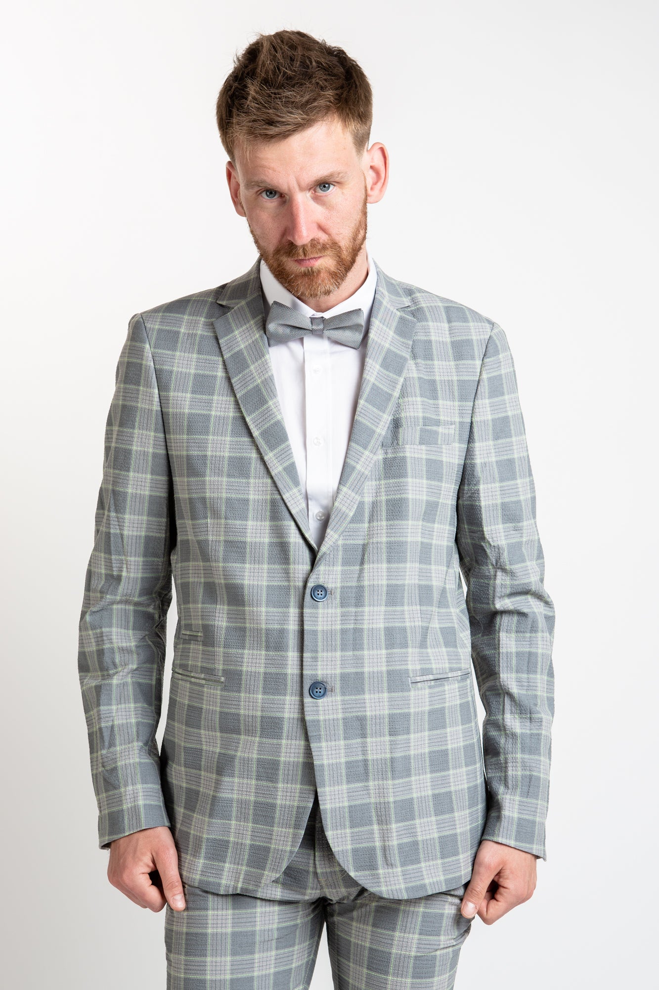 This blazer adds a stylish twist to traditional formalwear. Crafted from checkered grey Italian fabric, this fitted blazer offers a funky, yet sophisticated look with two button closure and intricate lining print. Perfect for both work and leisure.