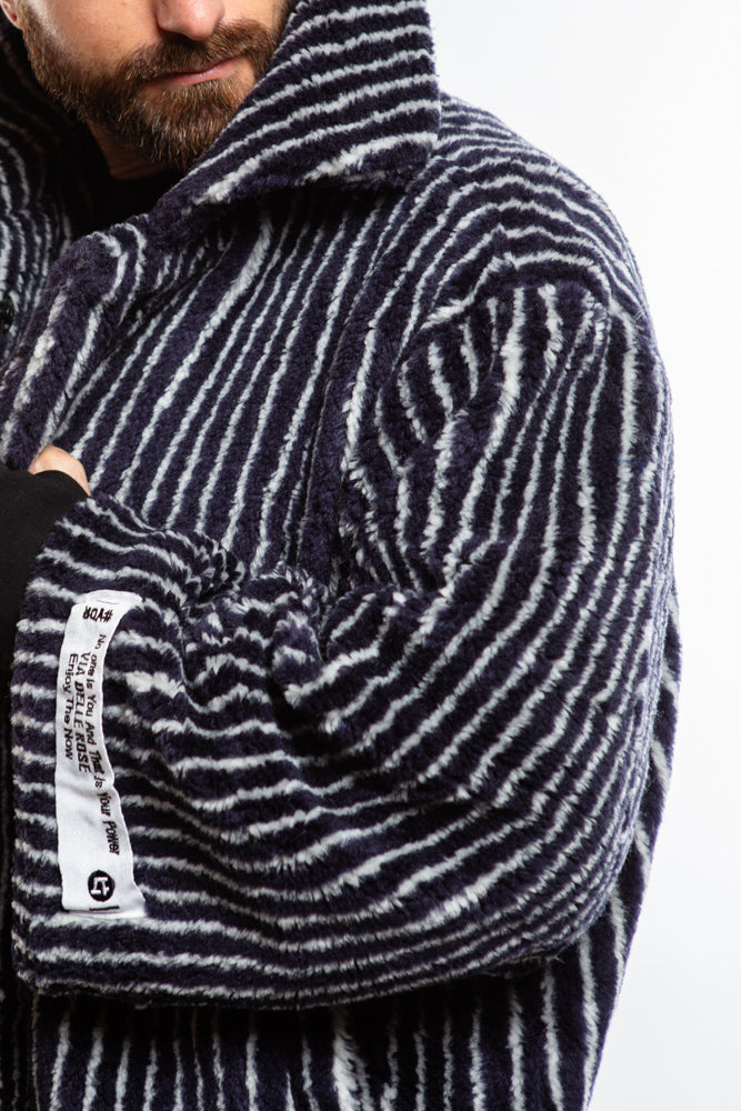 Capture the artistry of Japanese fashion with the Bitoru Coat in navy. The full length pinstripe design is complemented by a big collar and luxurious faux fur trim. Its impeccable craftsmanship and printed inner lining make it a timeless addition to your wardrobe. Elevate any look with this exclusive piece.