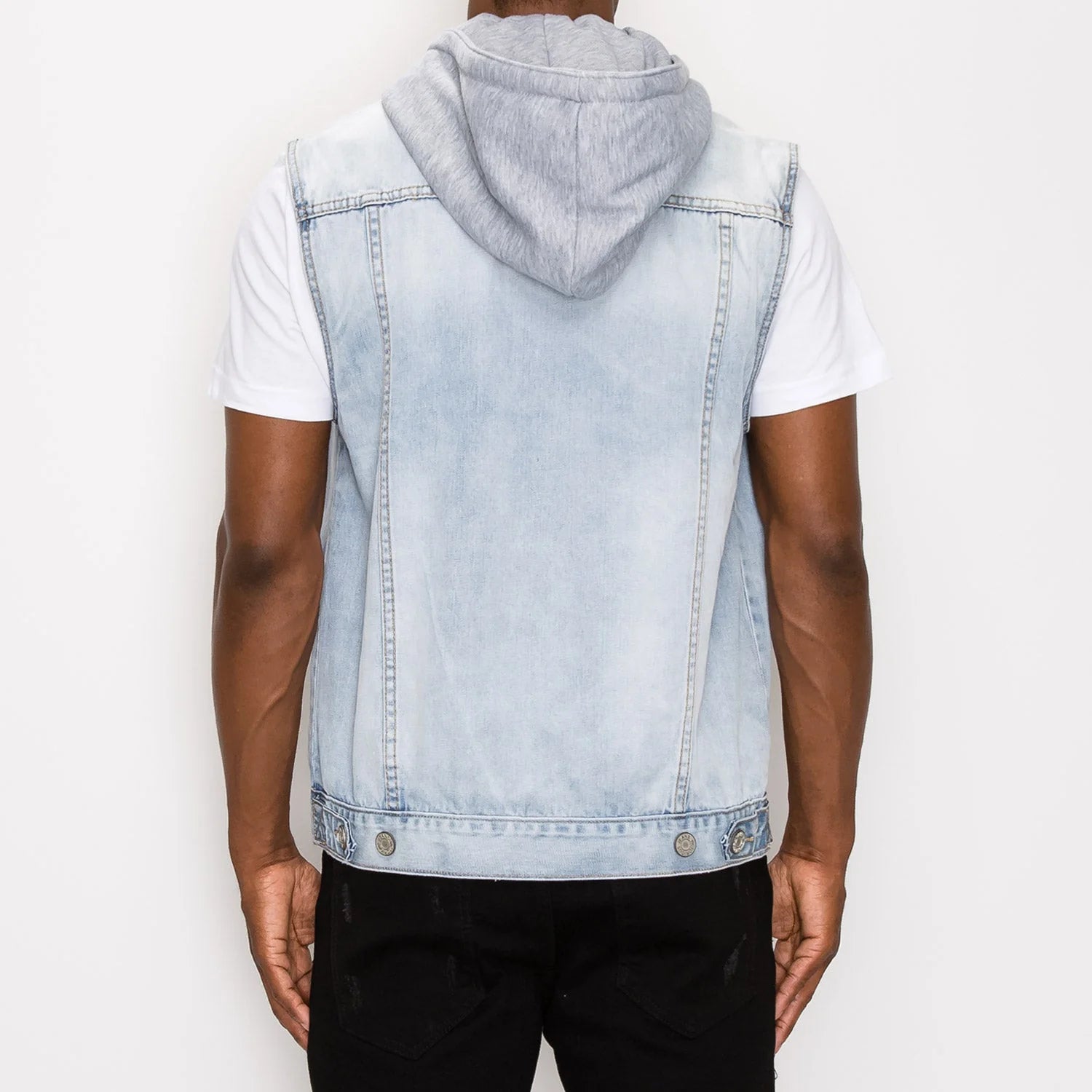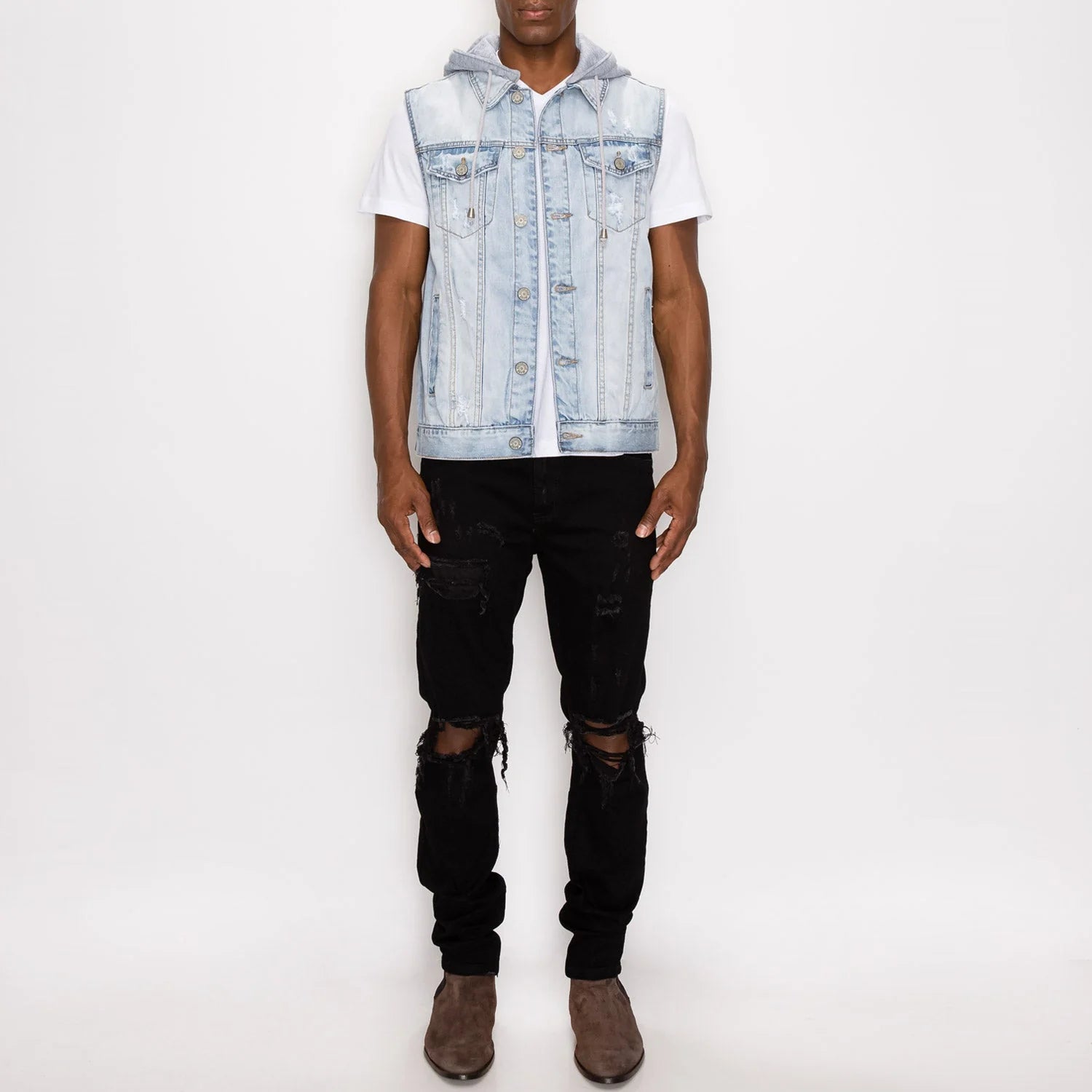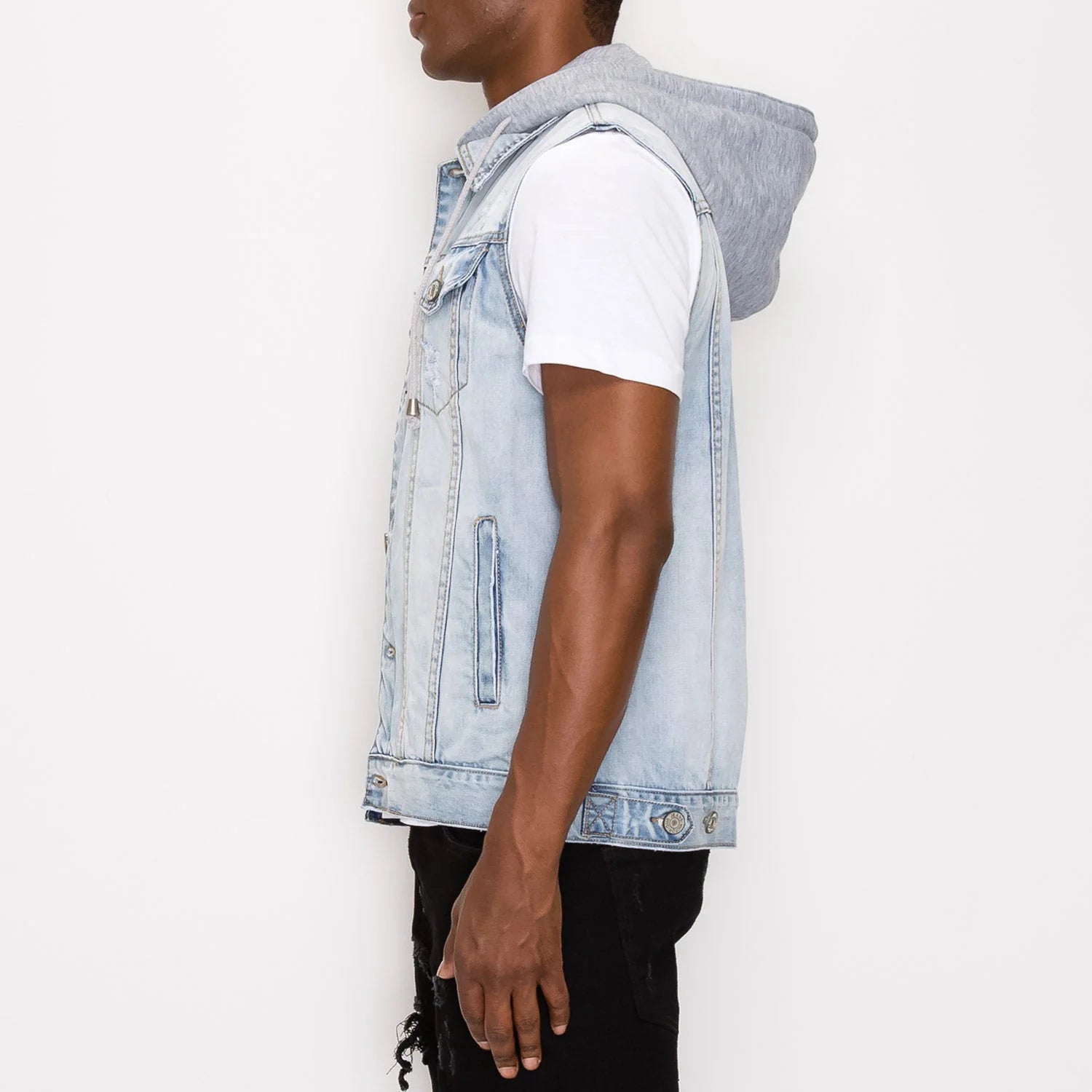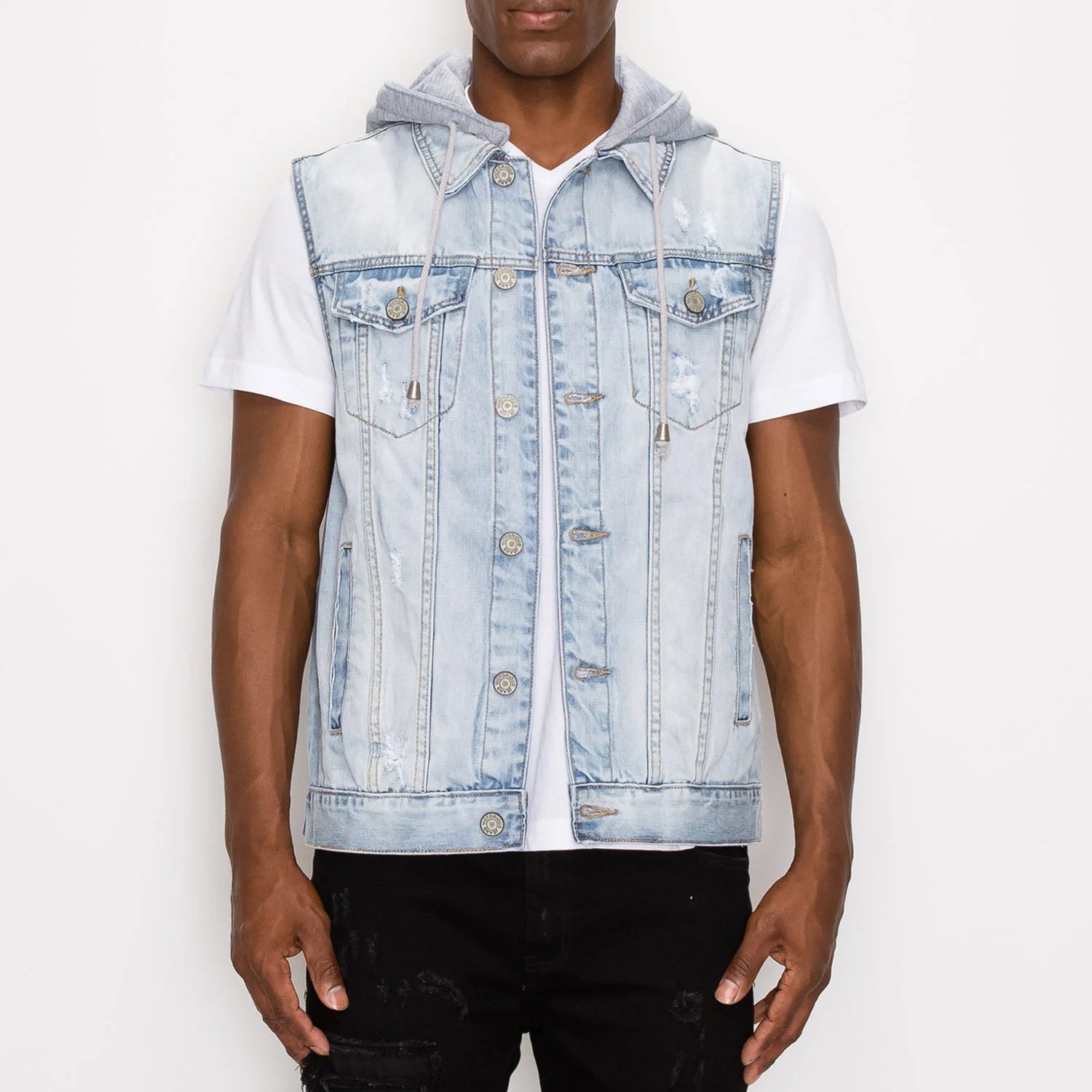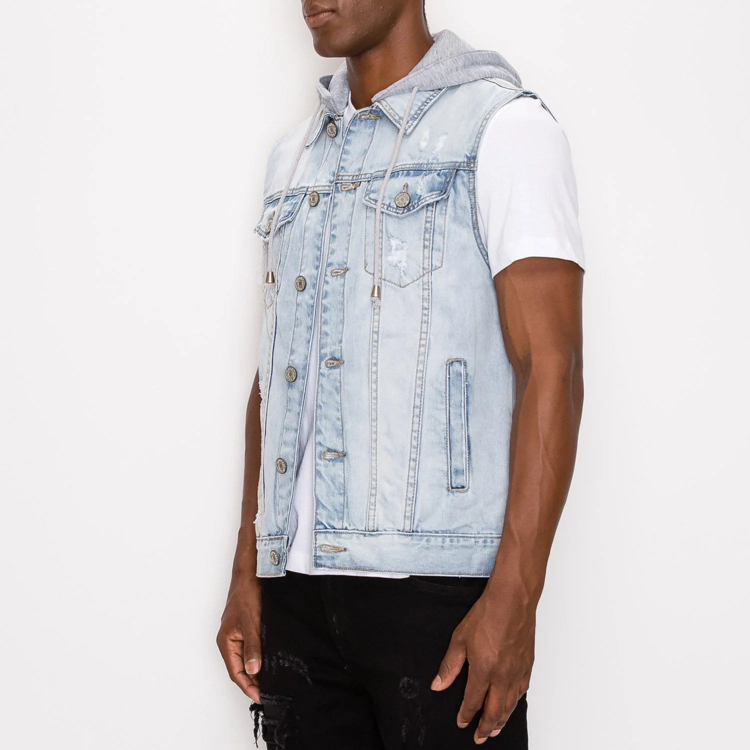 Unleash your adventurous spirit with our Detachable Hooded Denim Vest in Ice! This bold vest boasts a standard fit and distressed details, perfect for those who love taking risks. It also features button closures, multiple pockets, and a detachable fleece hood for added versatility. Made with 100% cotton denim, it's available at BIA BORO Menswear in Gastown Vancouver.