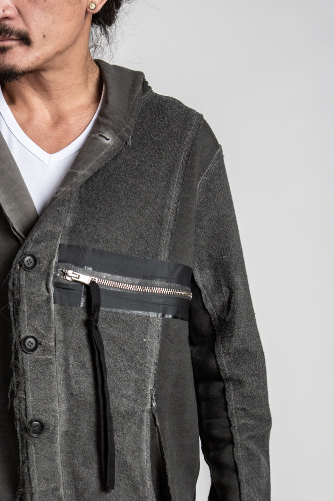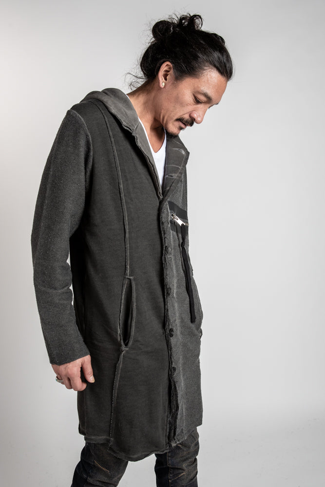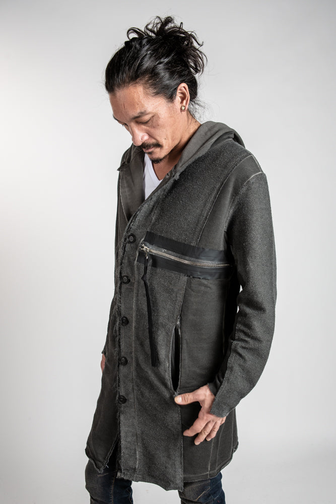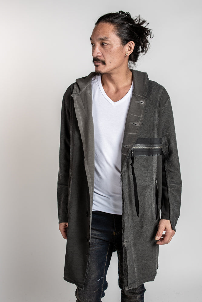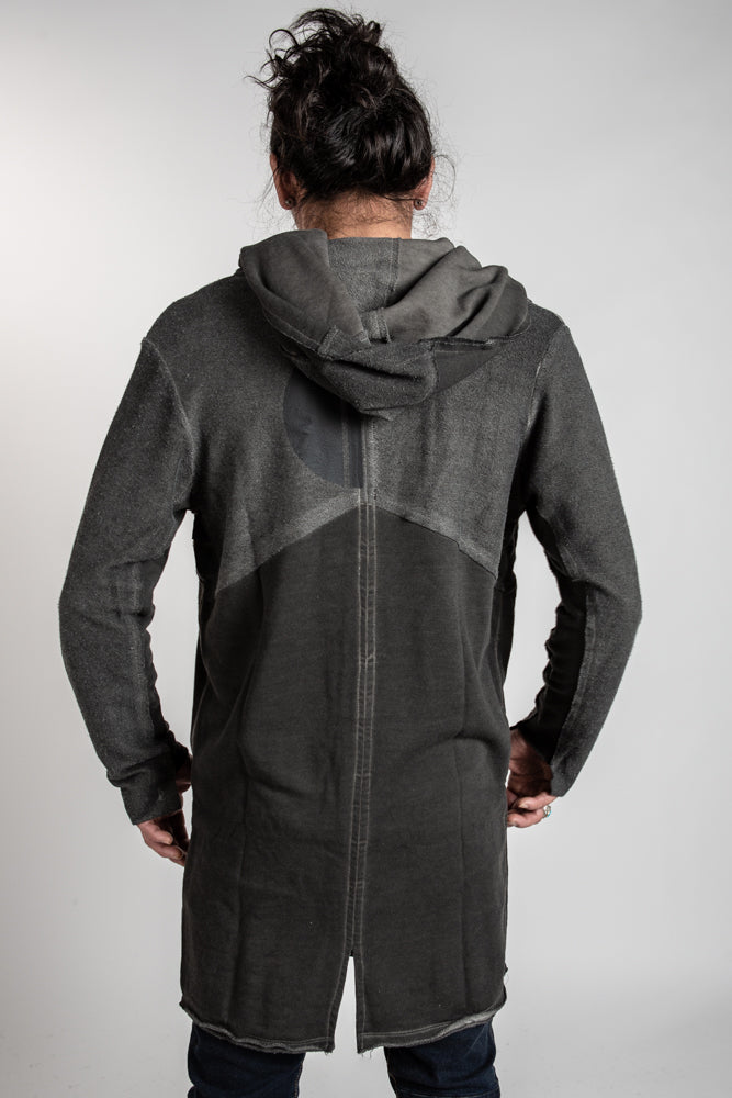 This edgy mens hooded sweater boasts a zipper front accent pocket and longer style with pockets and detailed accent stitching for an avant garde look that exudes cool.