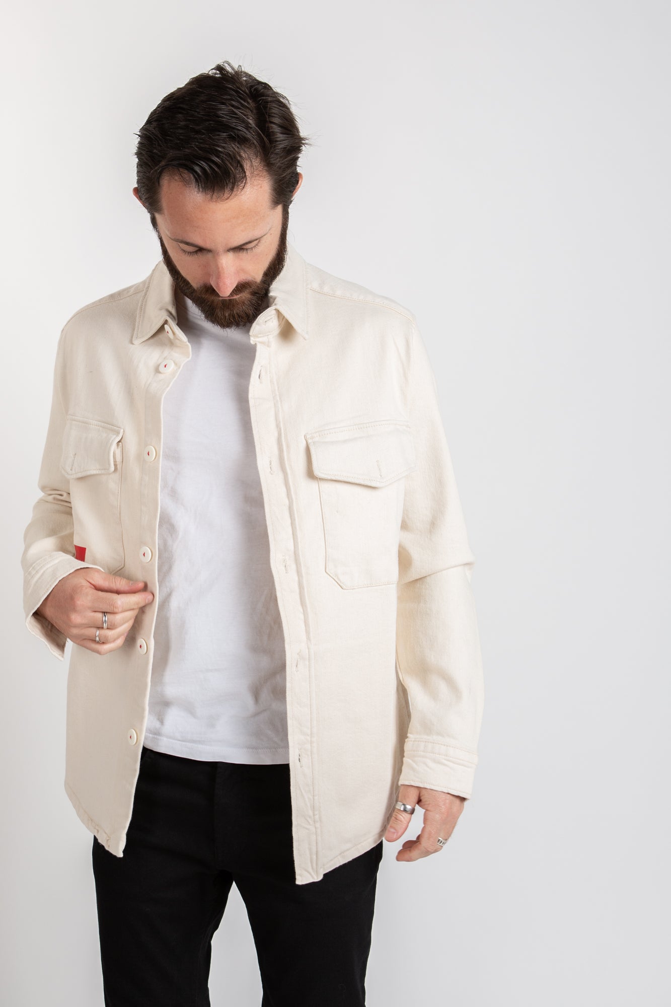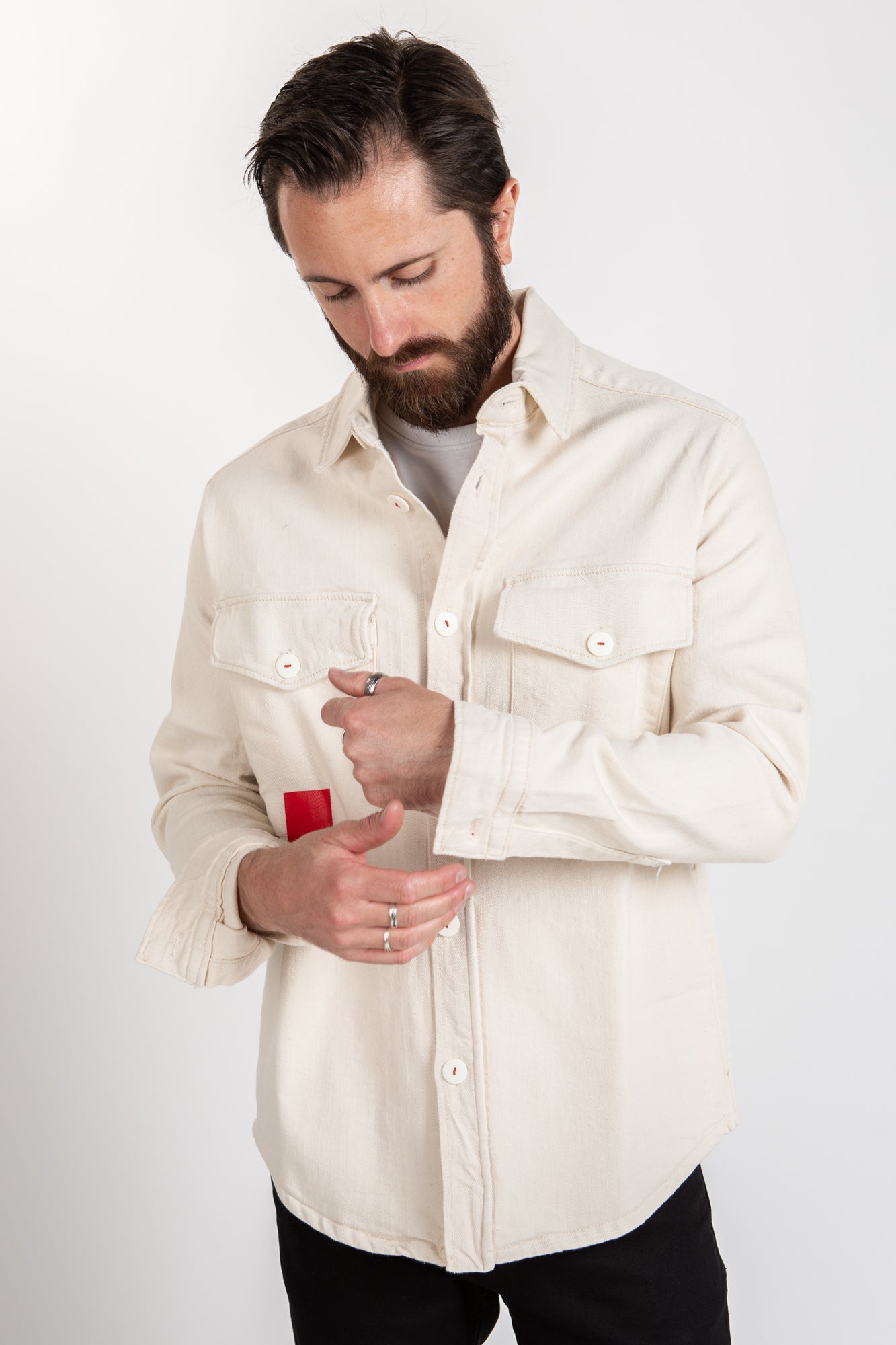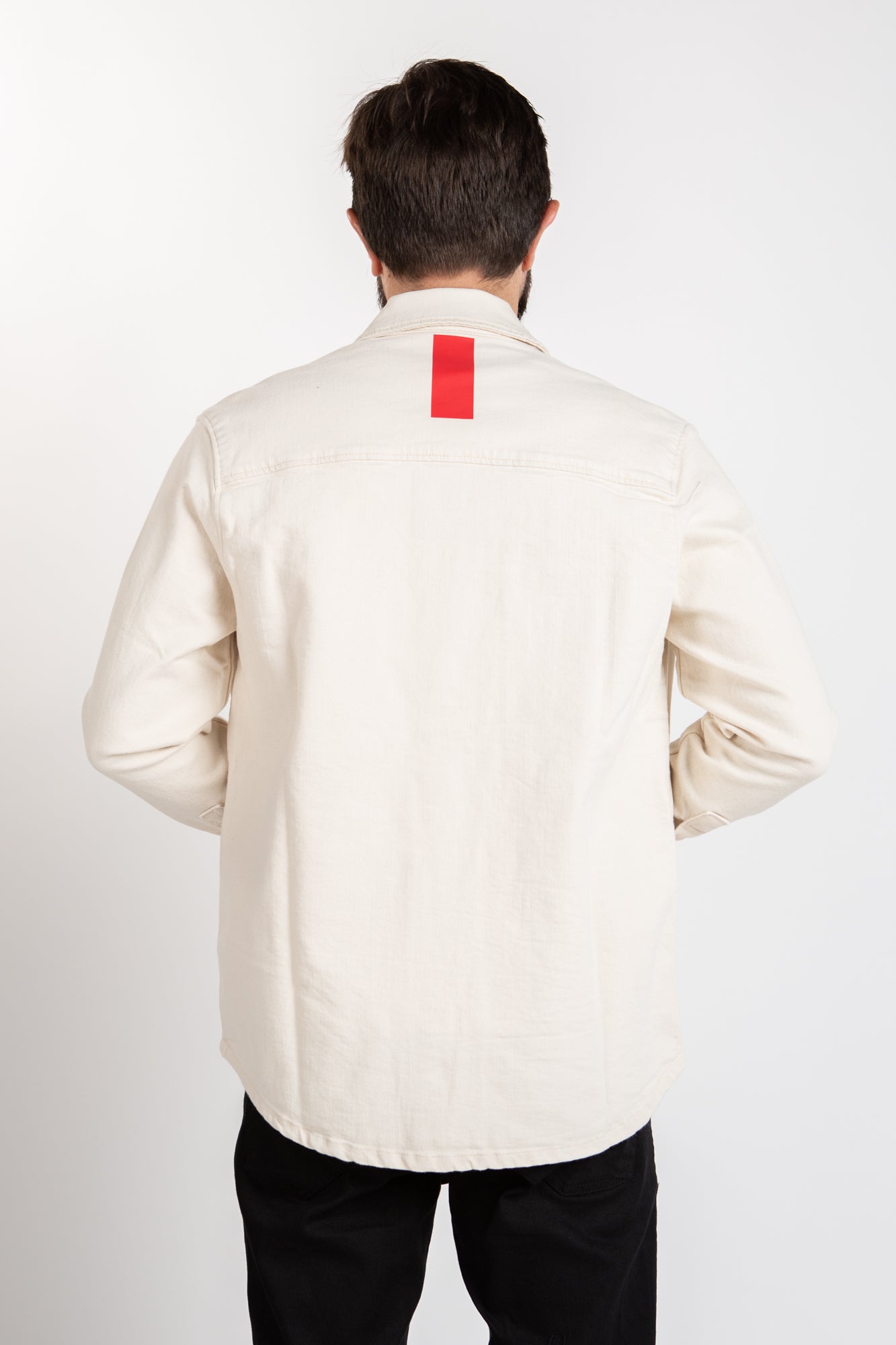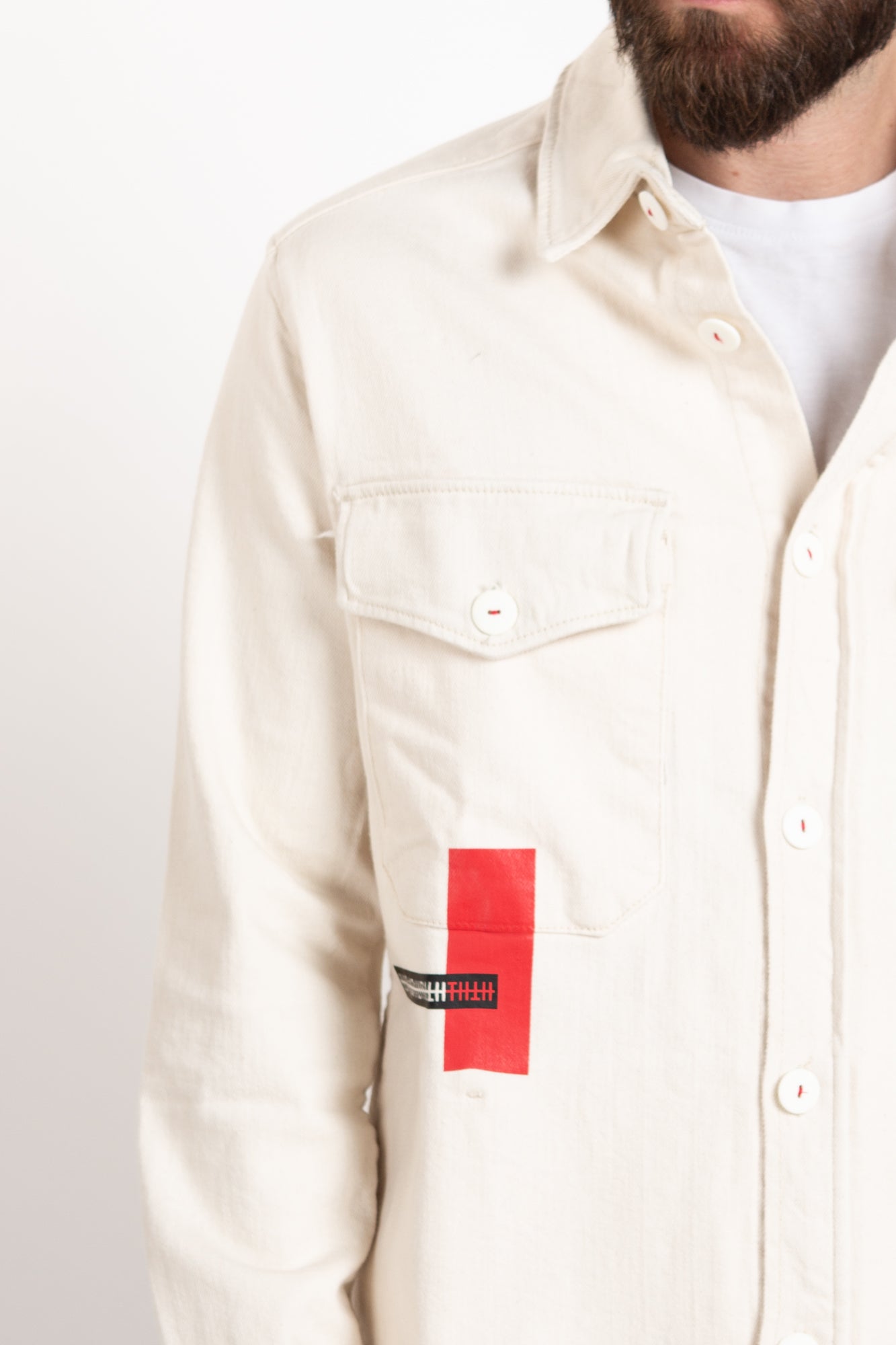Gents, make a daring sartorial statement with this dashing white overshirt, emboldened with vibrant red accents.