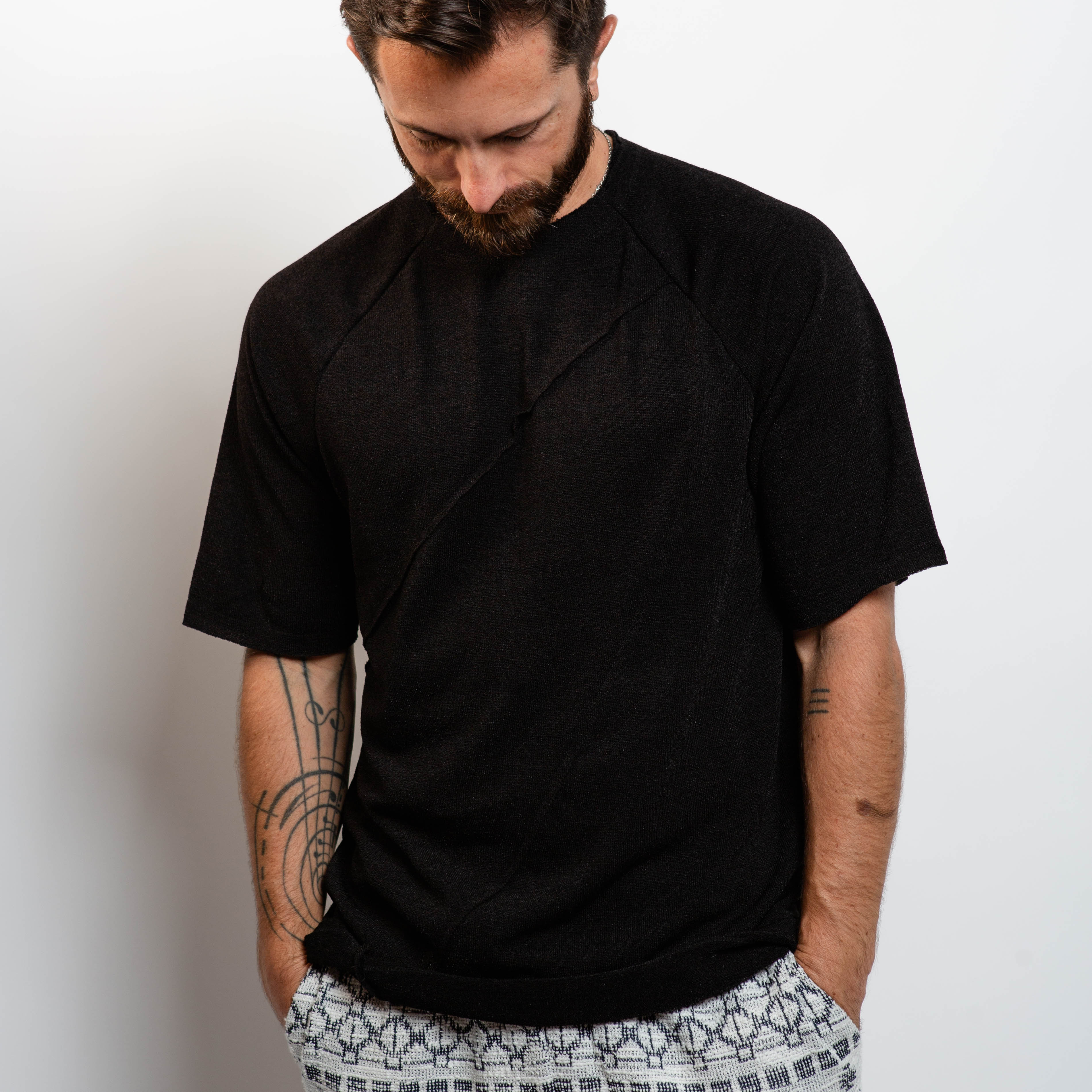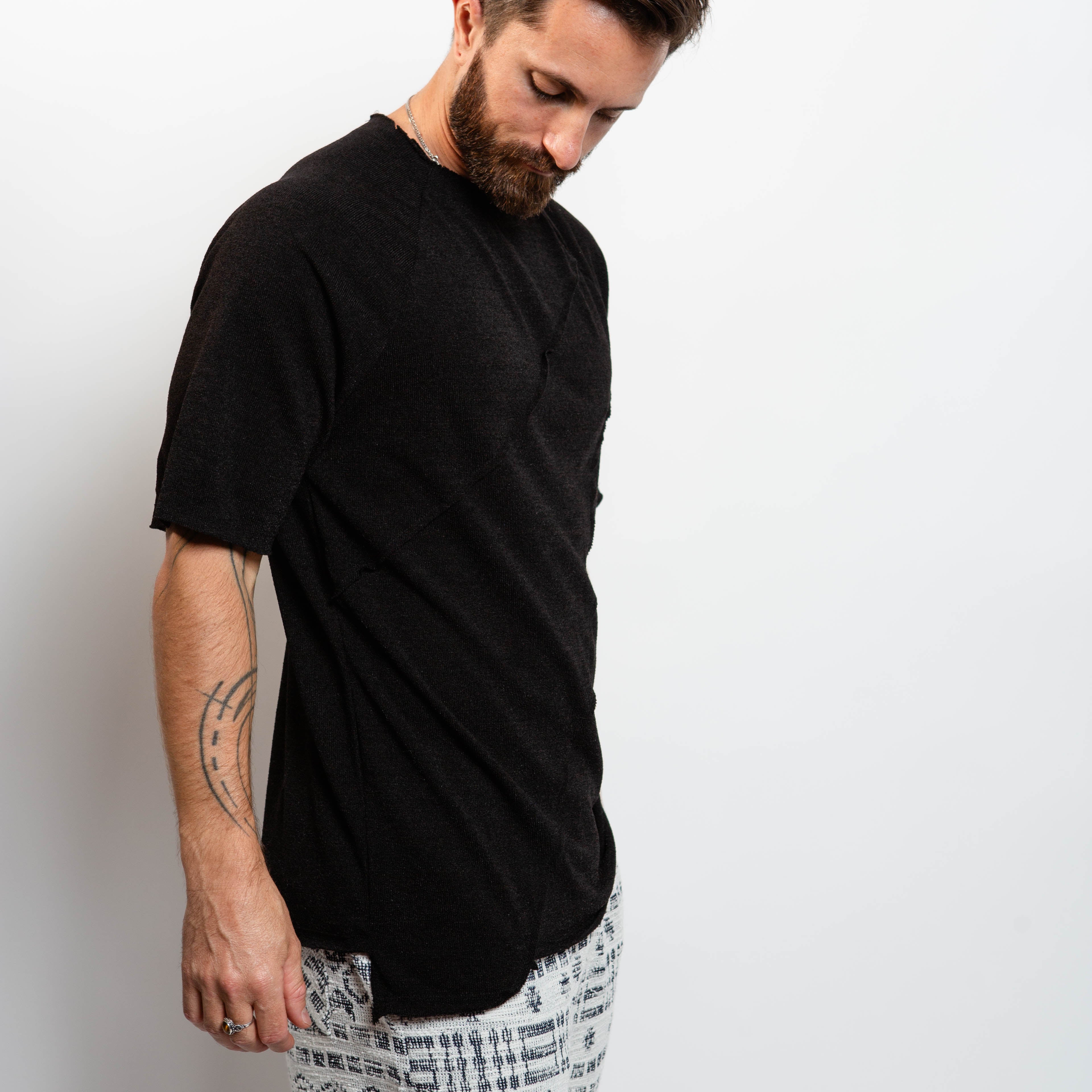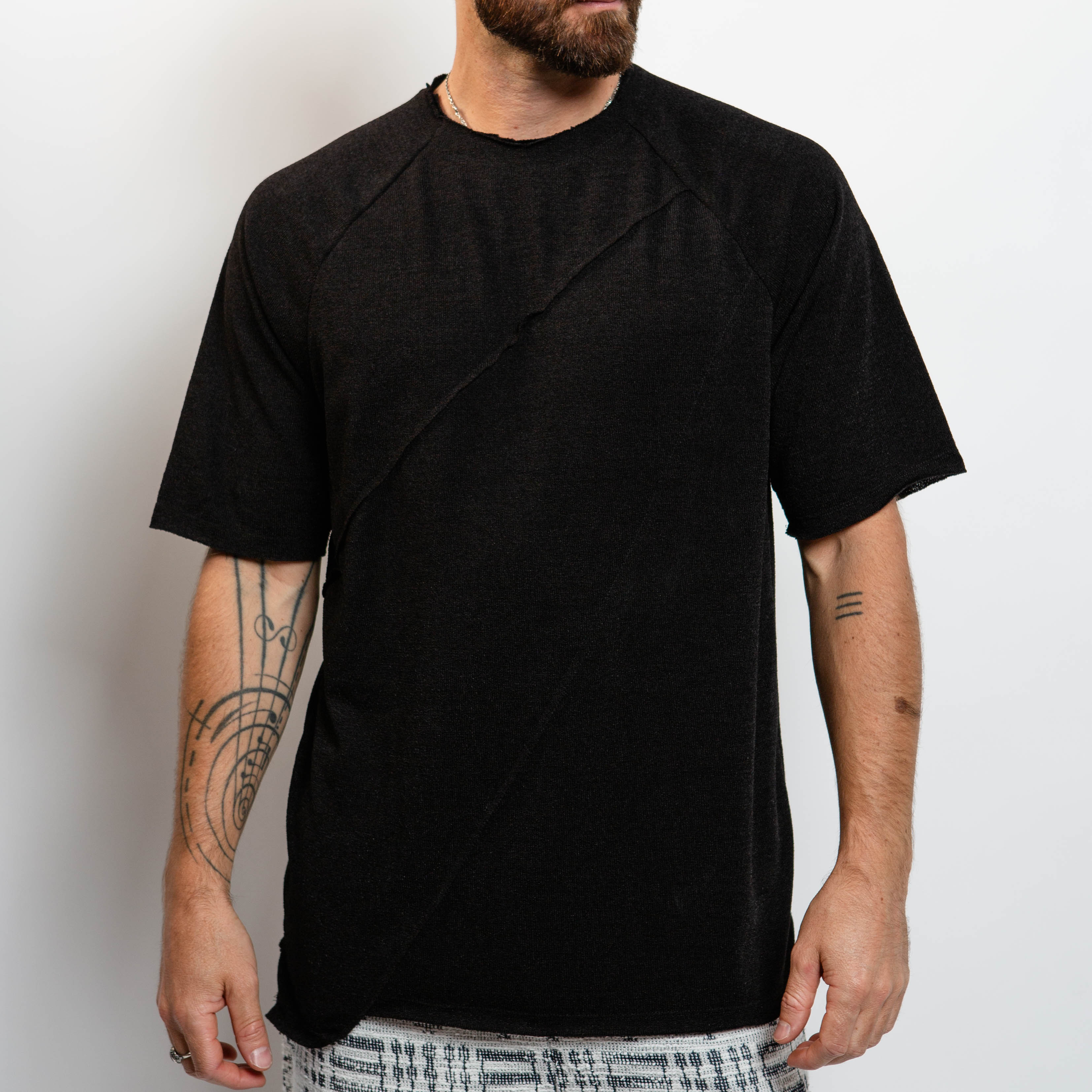 A bold reinterpretation of the classic black tee, the Asymmetric Panel Tee channels modernist minimalism with architectural precision. Featuring raw-cut diagonal paneling and an irregular hemline, this piece is designed for those who appreciate structure, silence, and a touch of rebellion in their wardrobe.