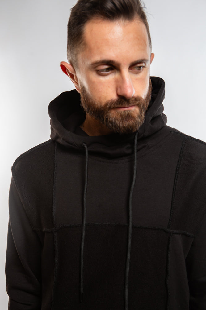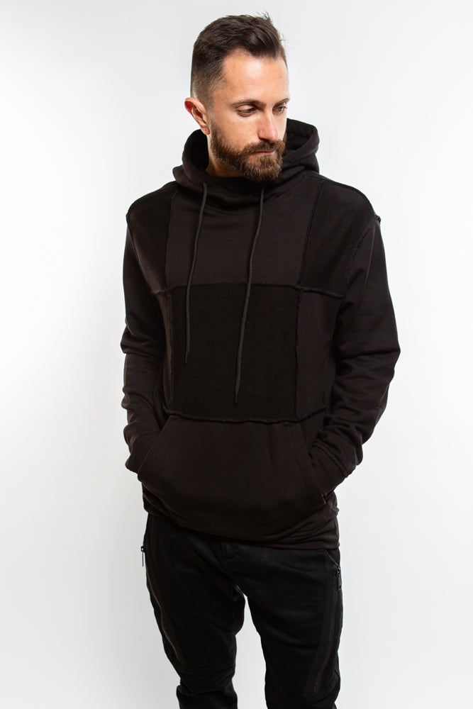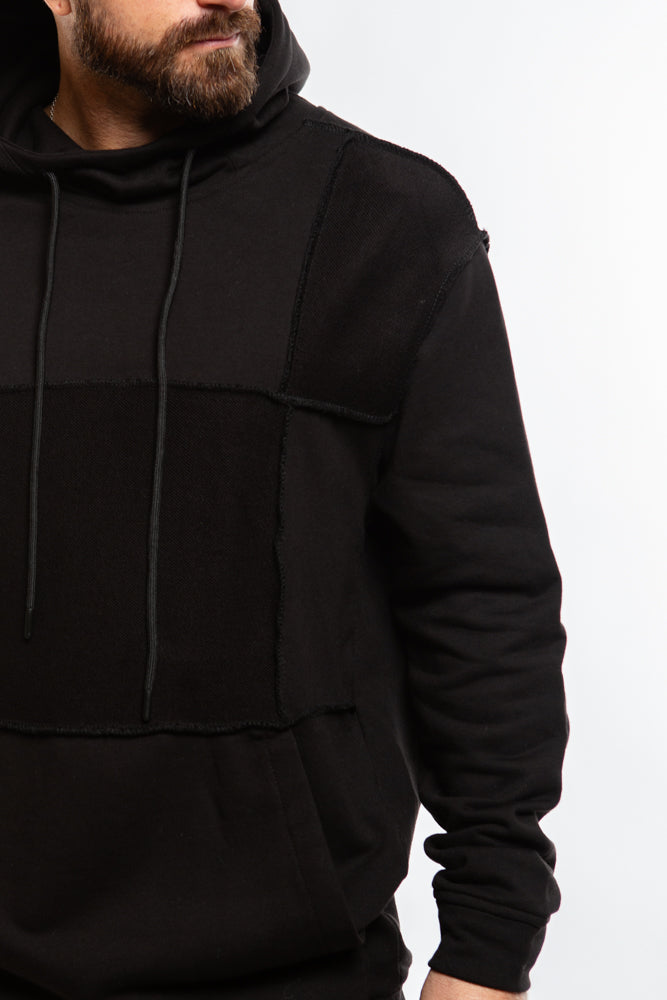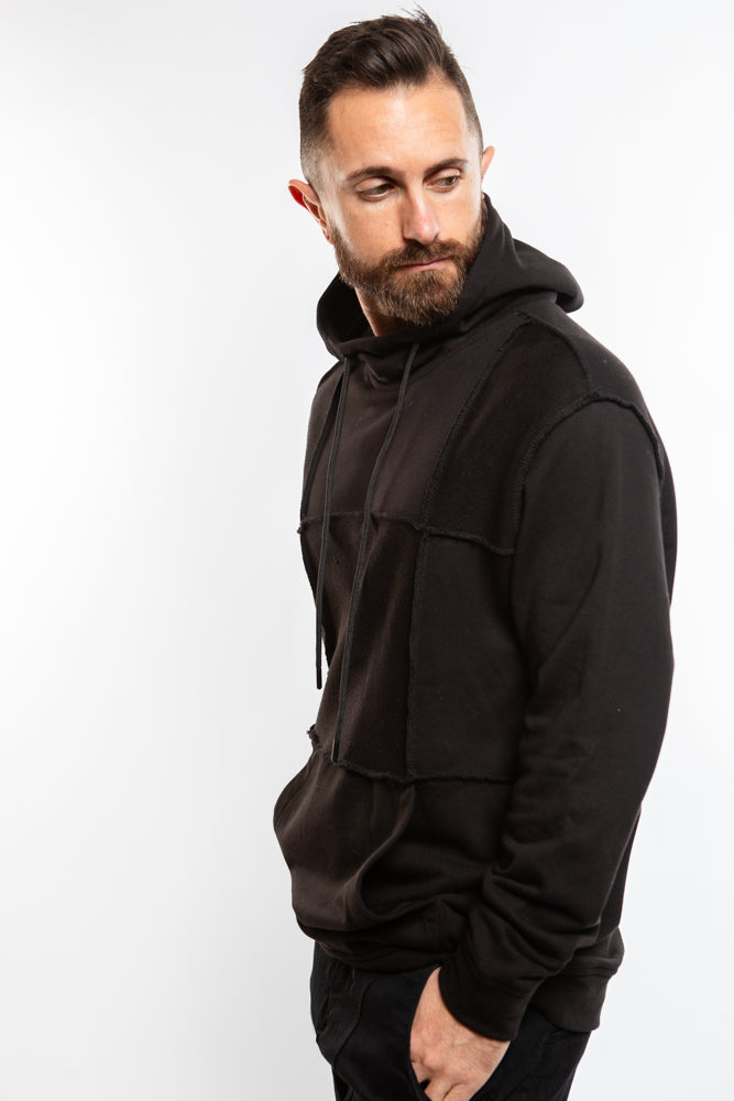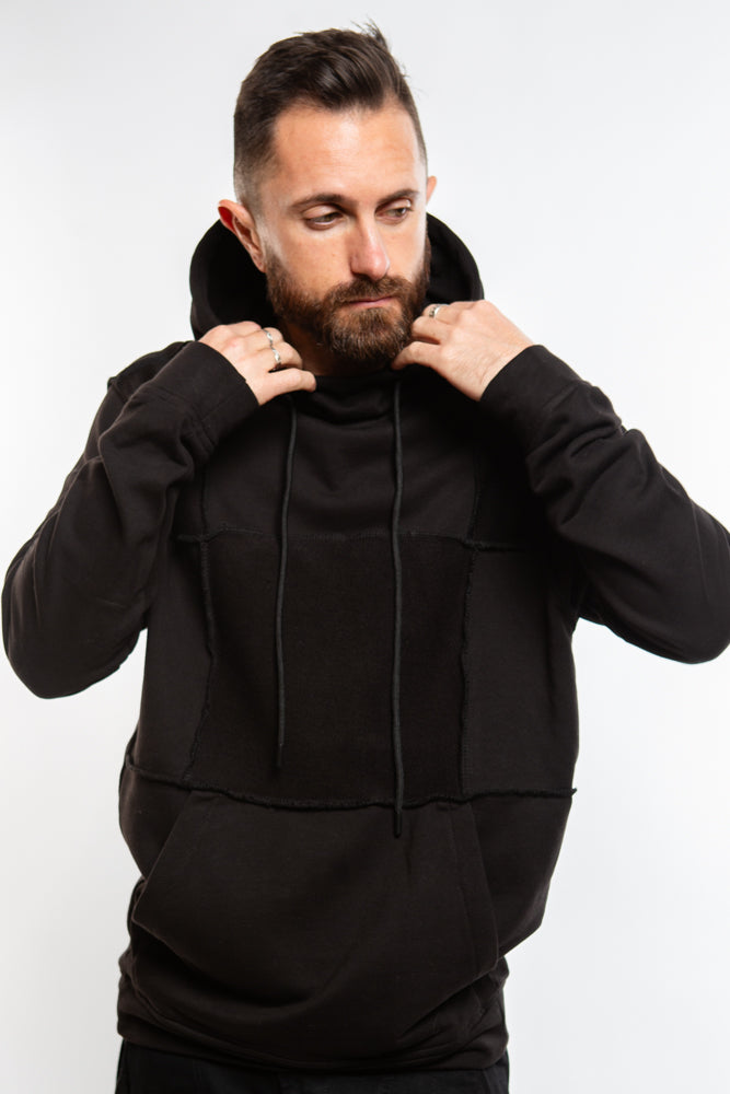 Experience ultimate comfort and style with our Axen Hoodie in black. Its sleek exposed stitching, contrasting fabric texture, panelled design, and hood create a futuristic & fashion-forward look. With convenient kangaroo pockets, this hoodie is perfect for any urban adventure.