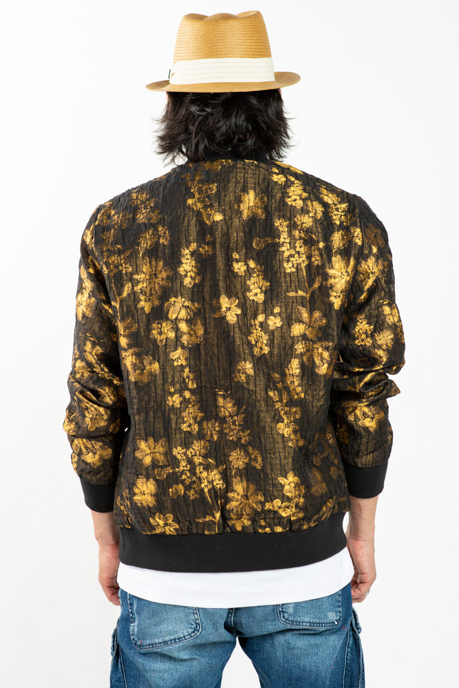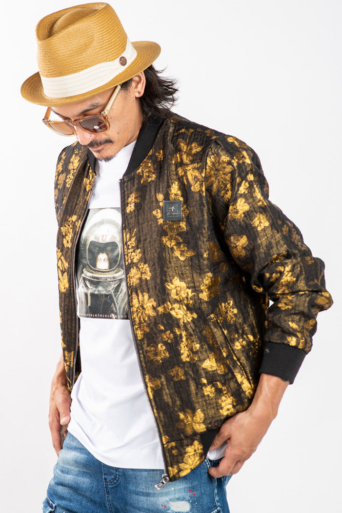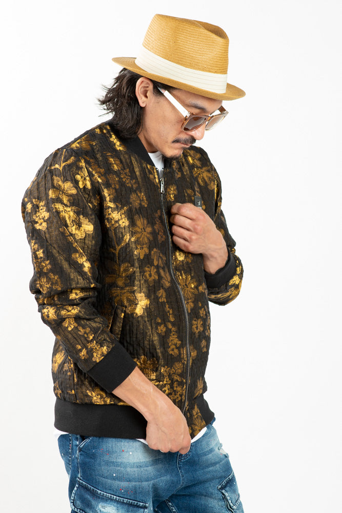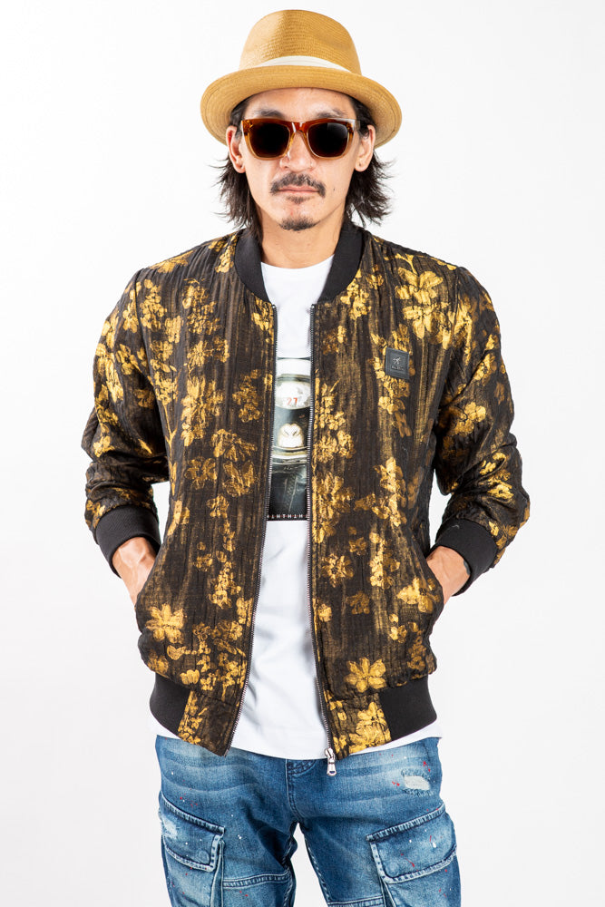 Elevate your look with our luxurious Bomber in Gold Print. Styled in a light, all-over leaf pattern and paired with a sleek black zip-up design, this jacket combines fashion and function. With convenient pockets, it's the perfect choice for both style and practicality.