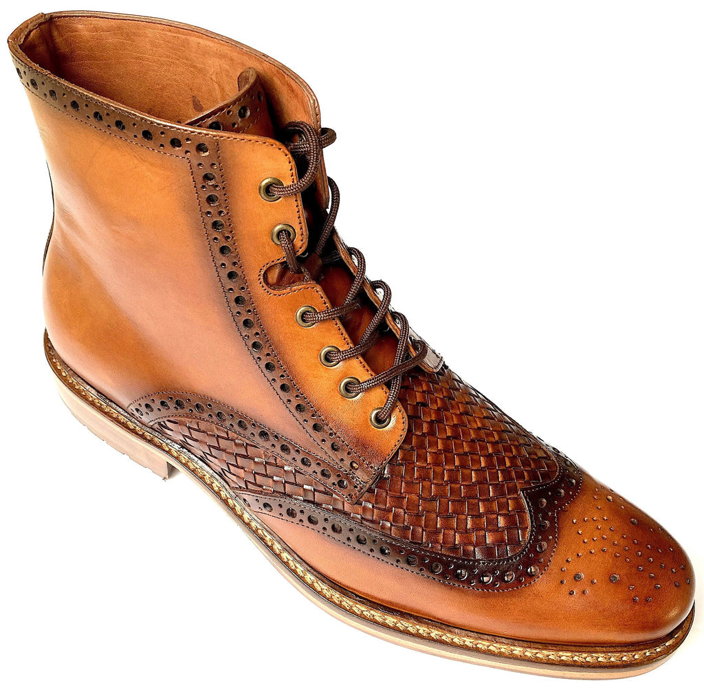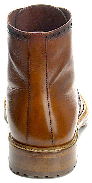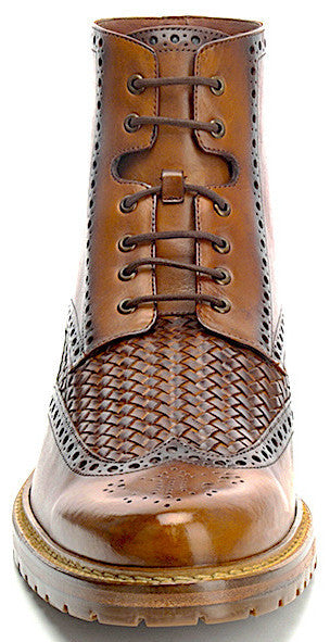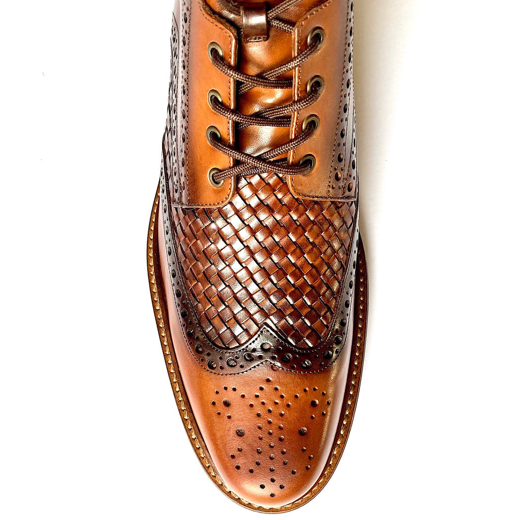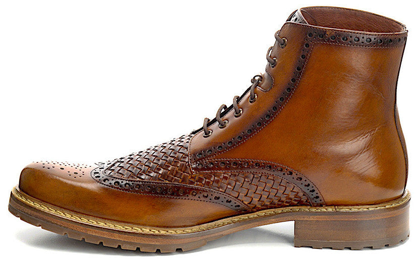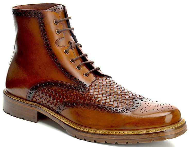 Unique and sophisticated, these ankle boots for men handmade of soft leather hand-dyed in brandy colour feature a wingtip, medallion toe, braided vamp, intricate details and a special multi-tone finish.