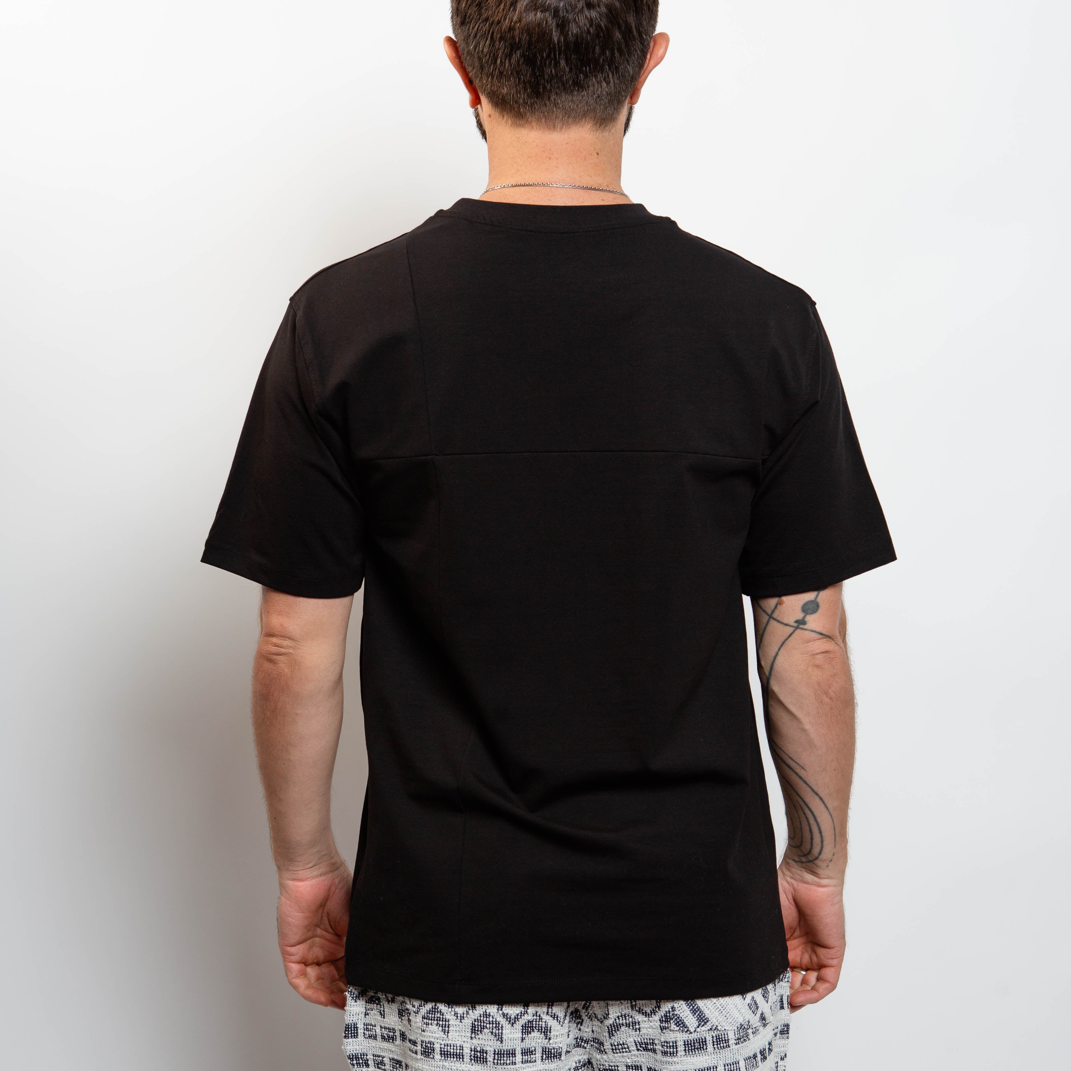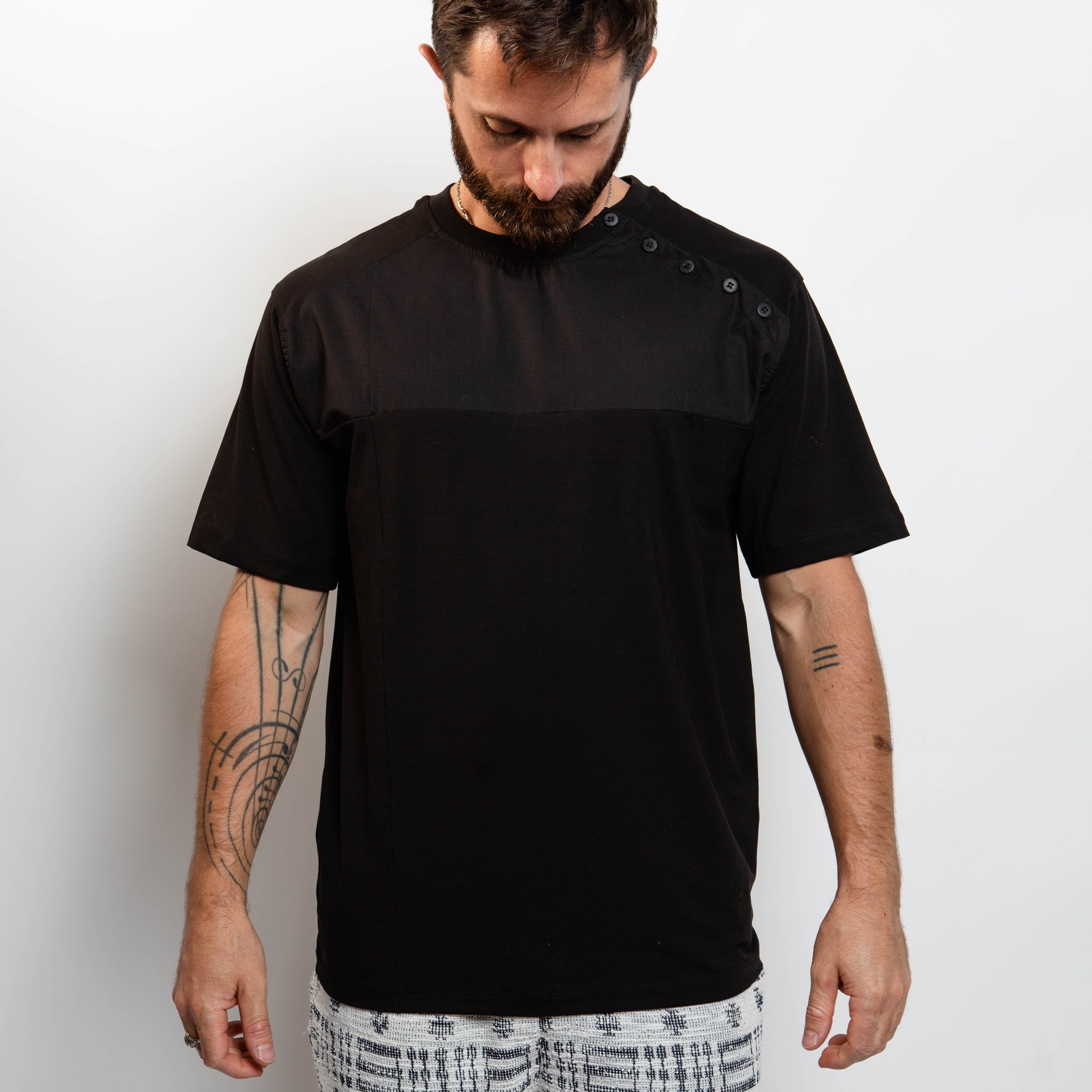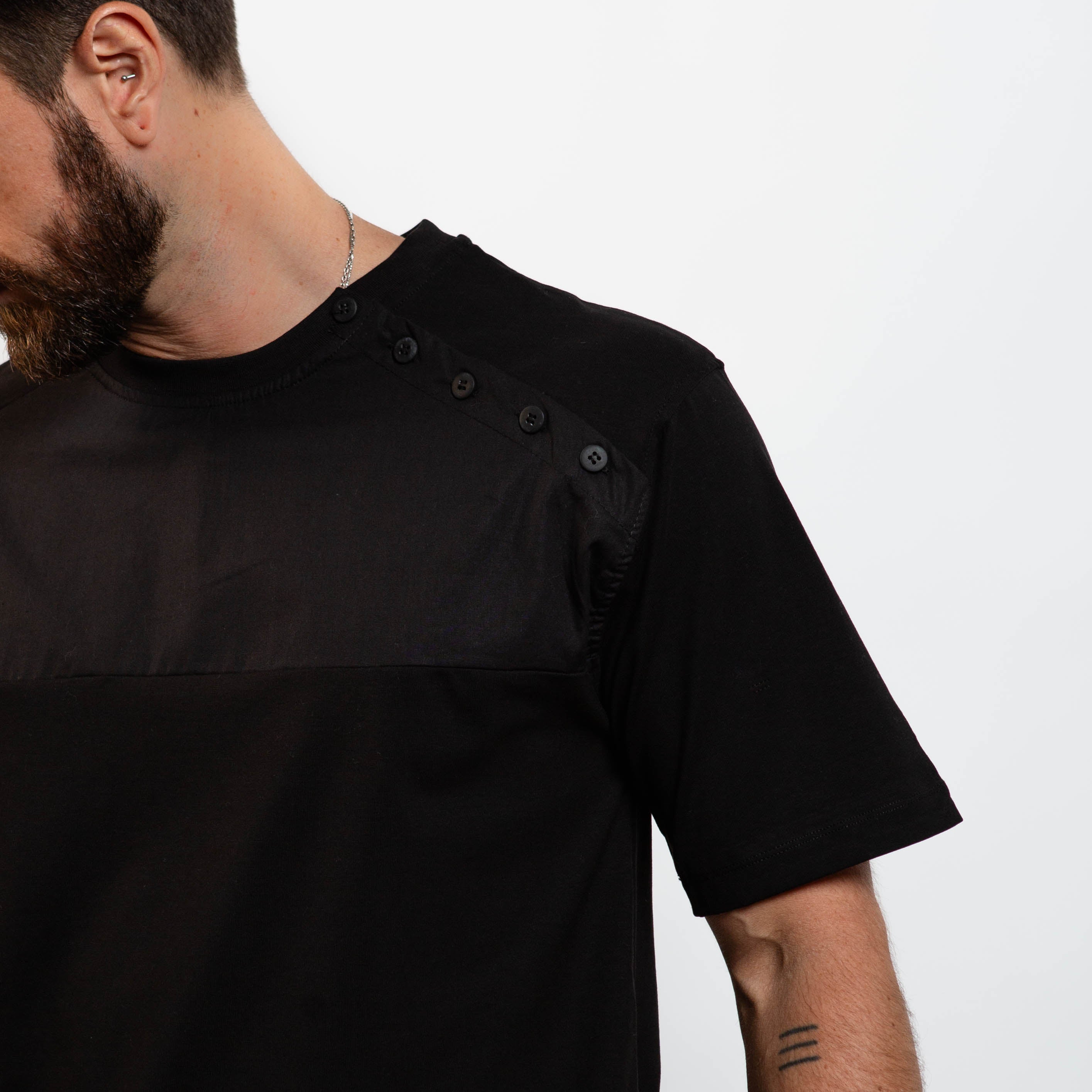 A cyber-street essential. The Button-Shoulder Tee channels utilitarian design with underground energy. Crafted from soft black jersey and a tonal tech-fabric yoke, it features a vibrant red printed insignia inspired by Tokyo street signs and coded resistance symbols.