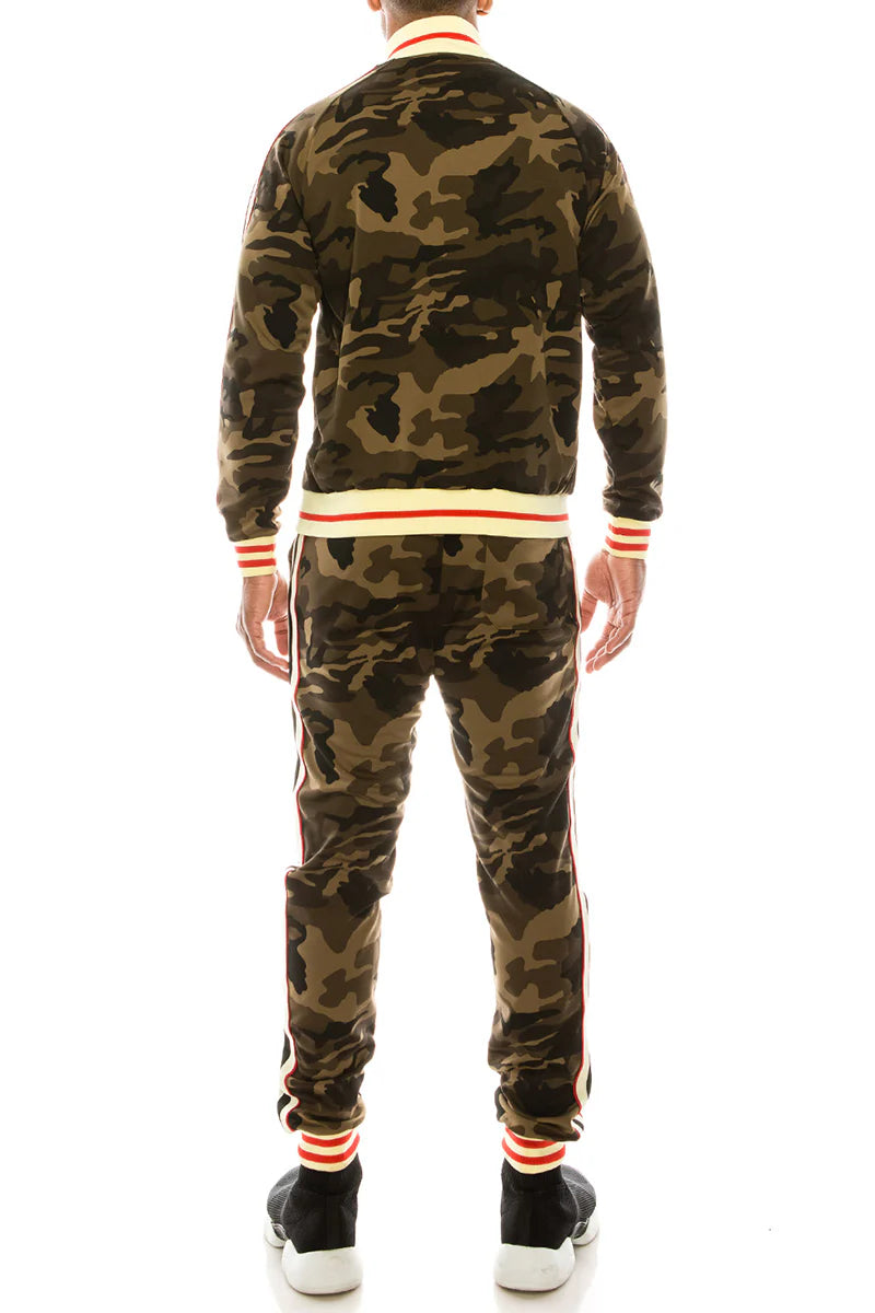 Conquer the urban jungle in our Camo Tracksuit! With a playful side split stripe and convenient waist and rear pockets, this tracksuit also features elastic waist and wrist cuffs for a comfortable fit. Bonus: the cuffs and collar have a cool color variation due to the dyeing process.