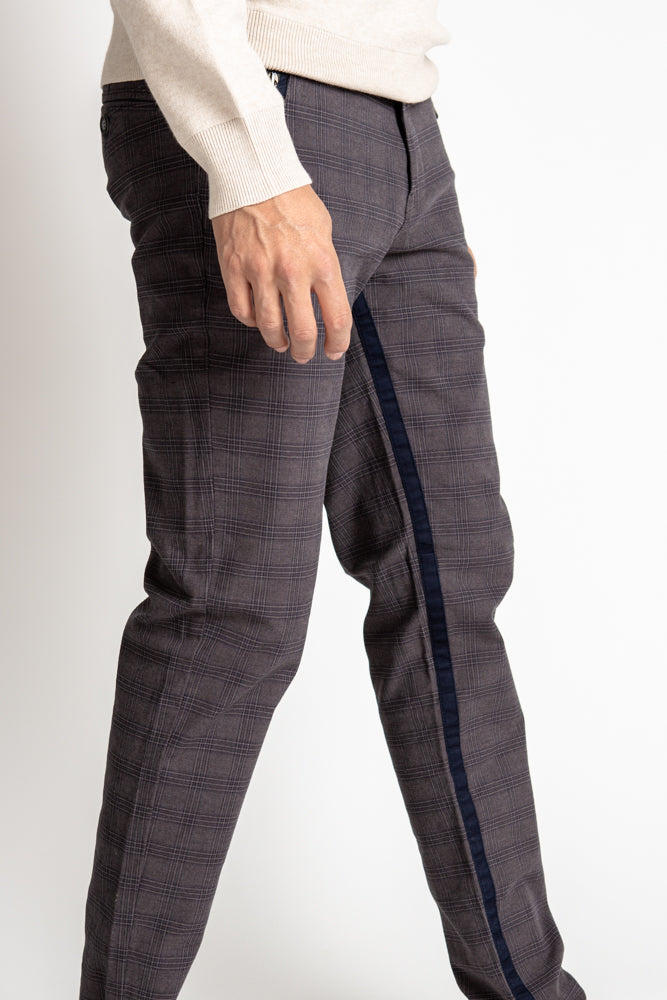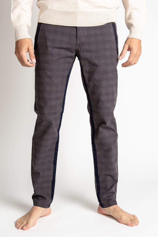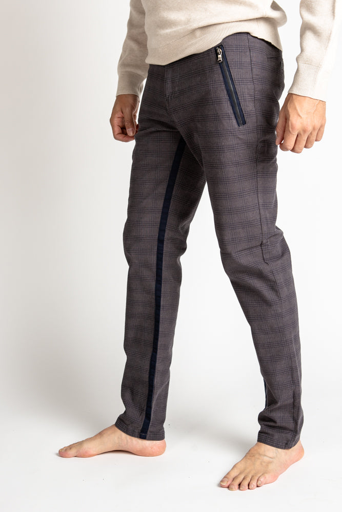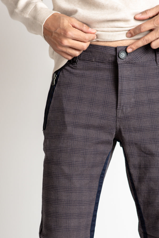 Men's funky checkered dress pants in grey with zipper accents on the pockets and navy tuxedo panel on the inside seam.