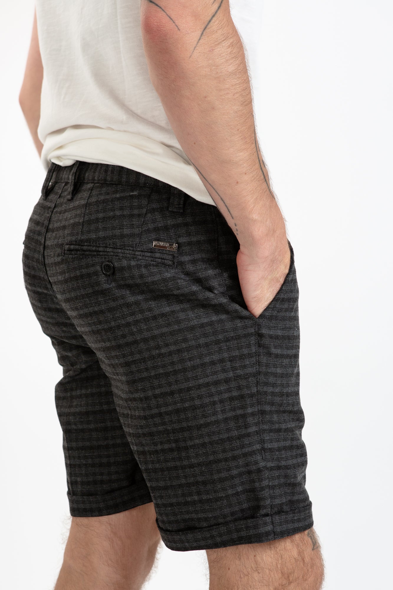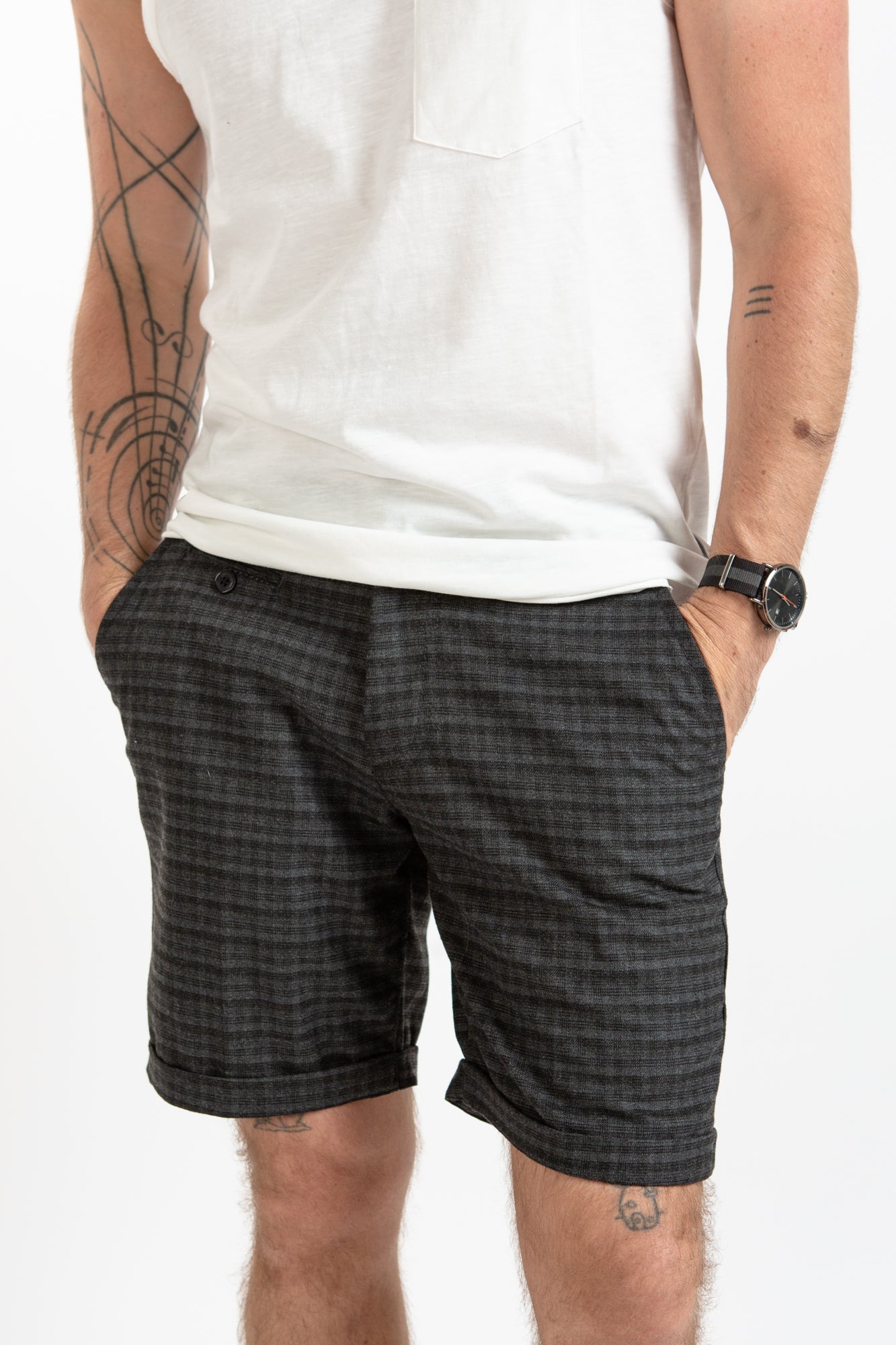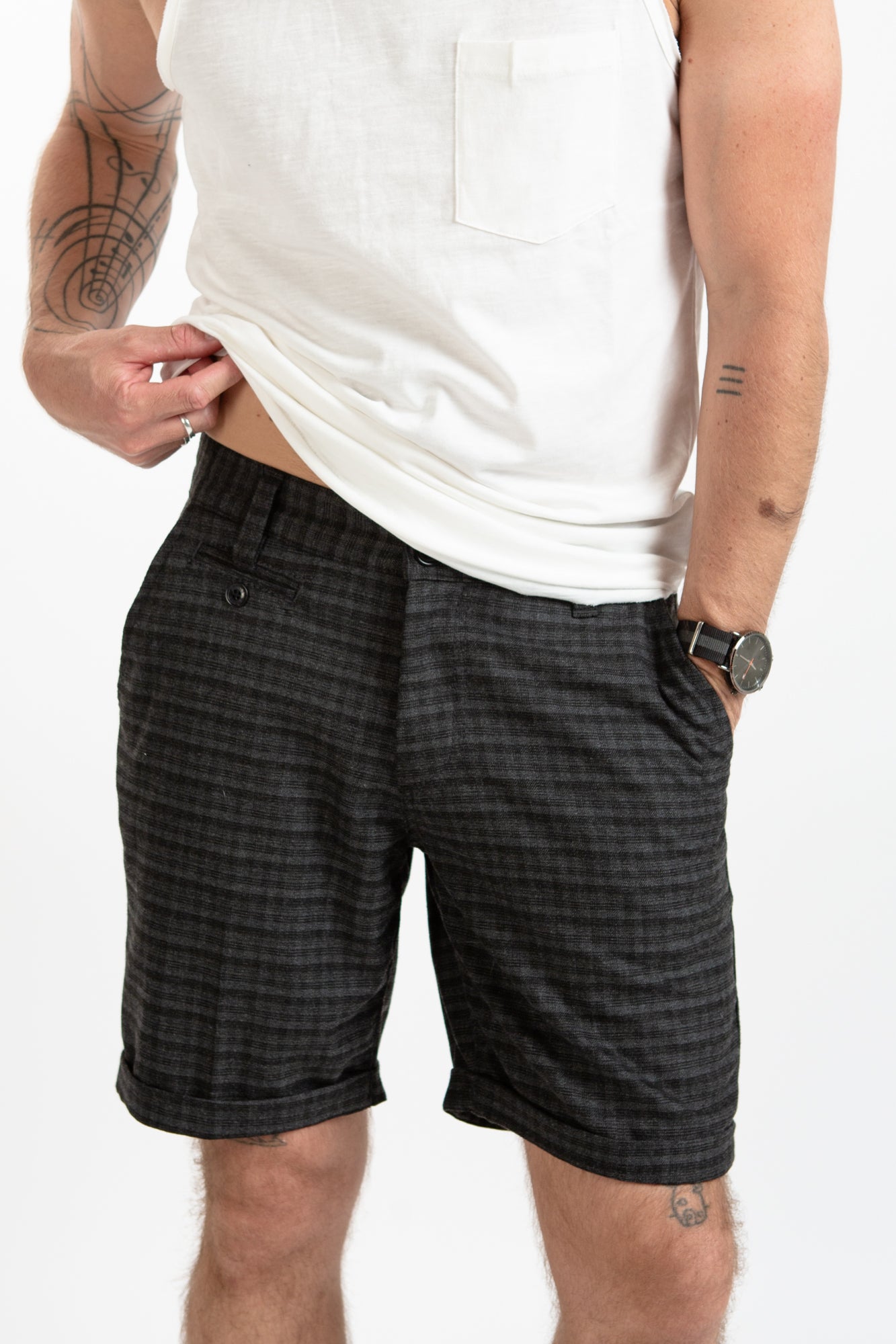 Men's charcoal chinos with zipper fly. Looser Fit. Designed to be hemmed shorter or rolled up.