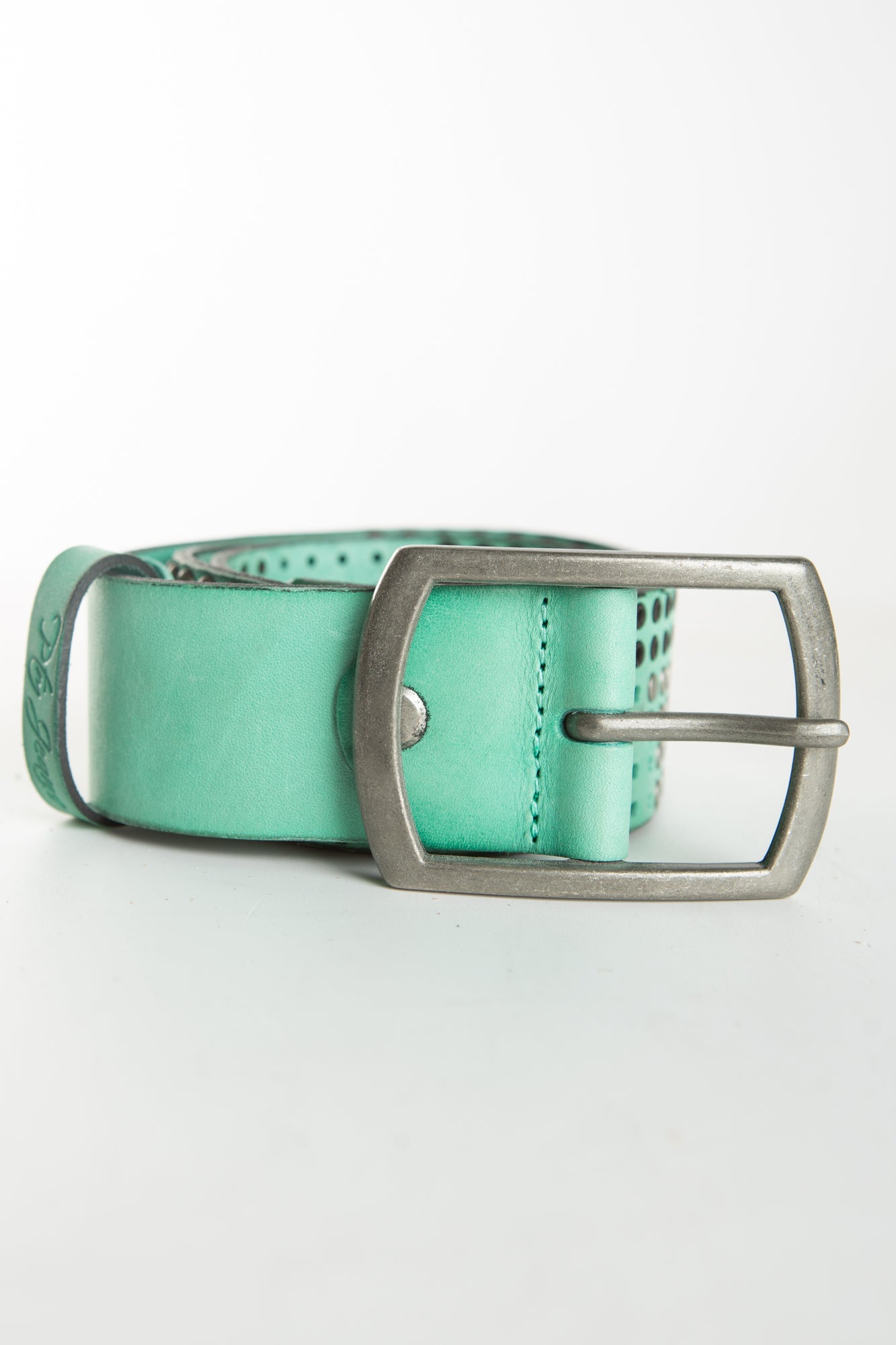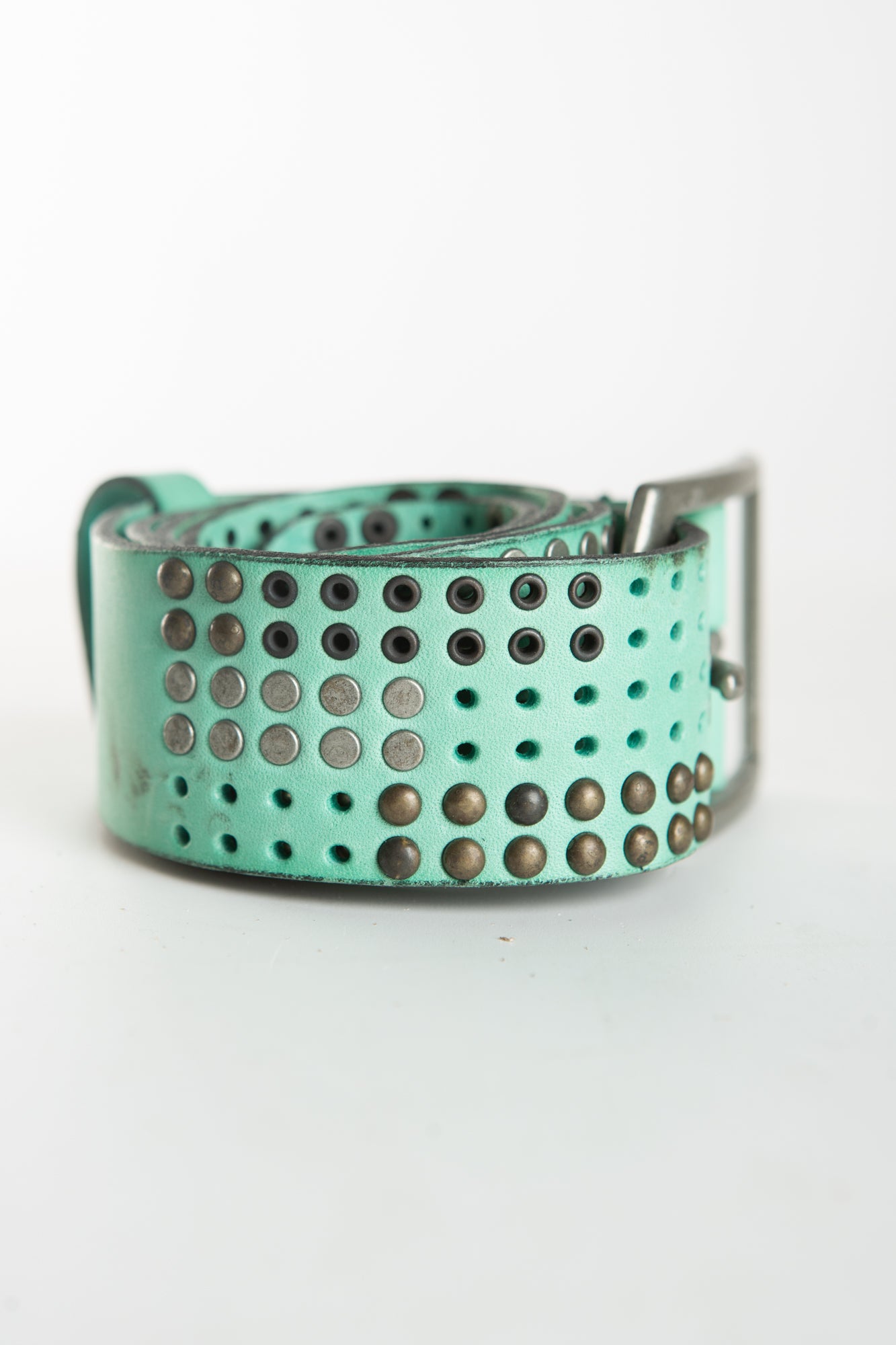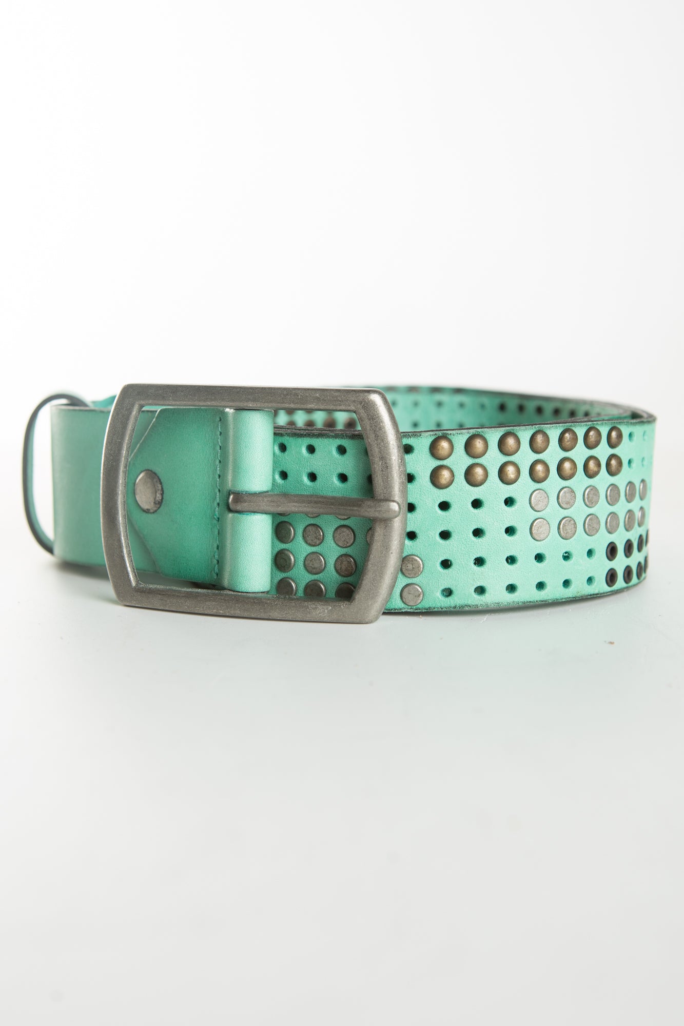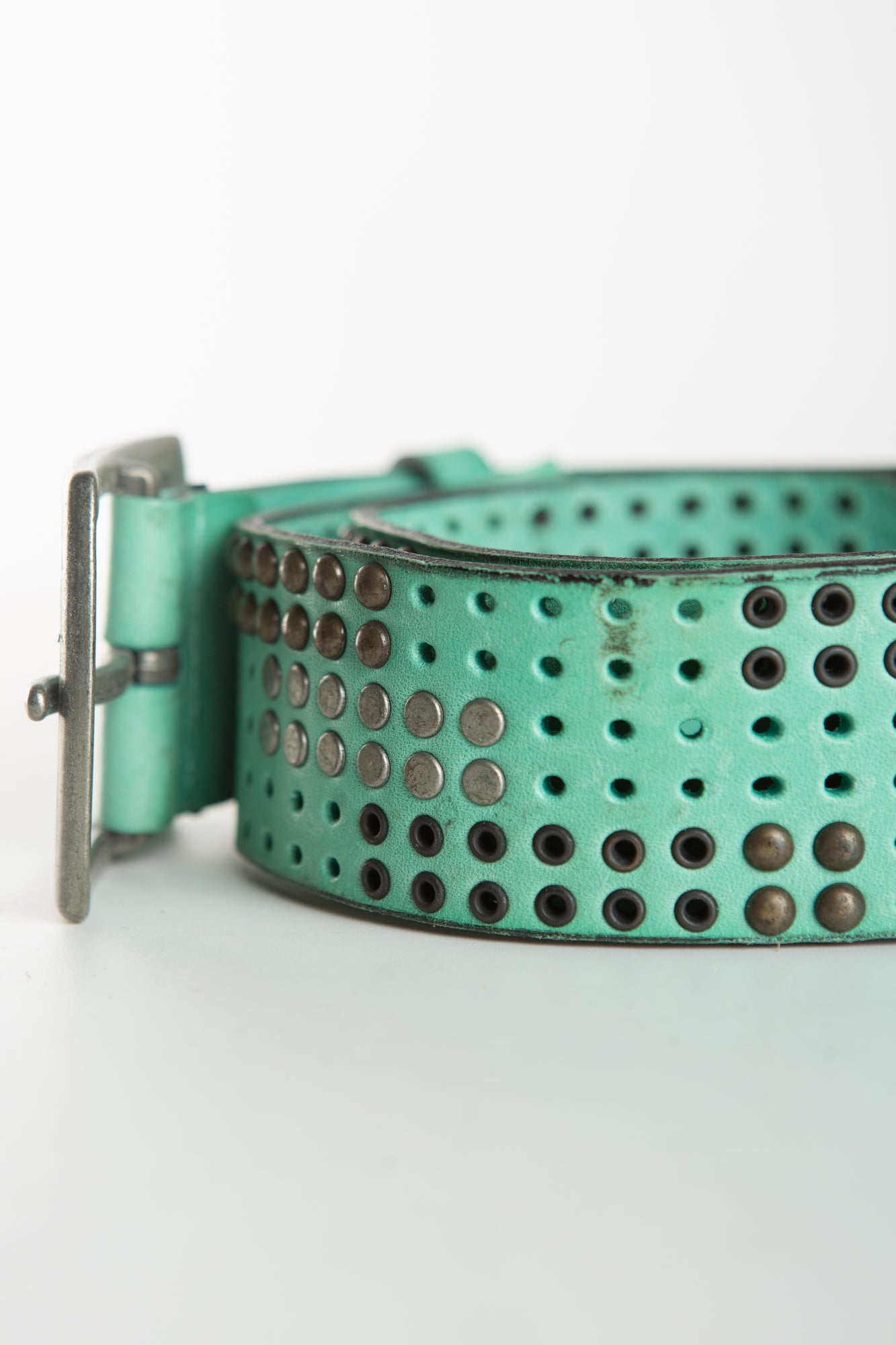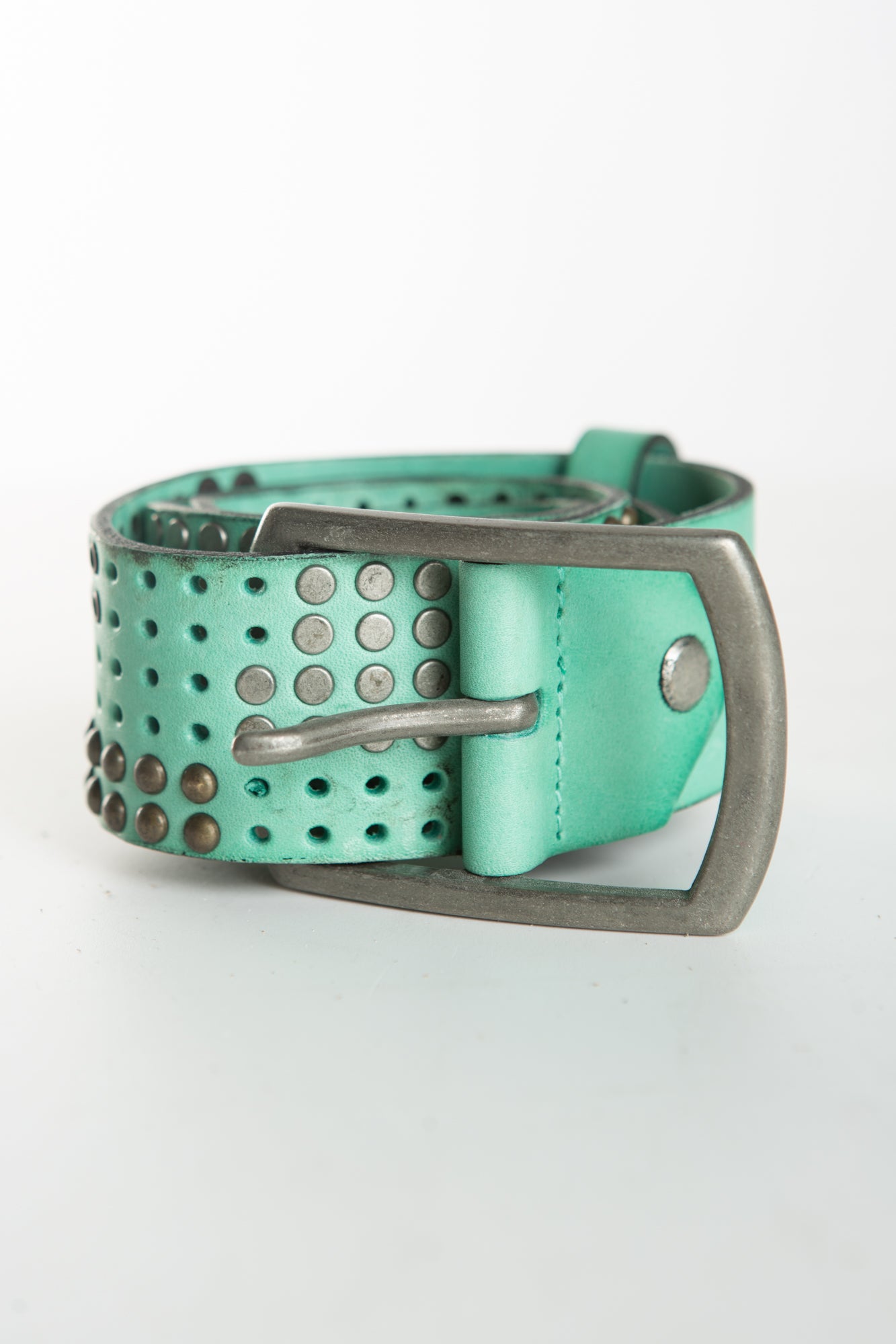 A Burnt Orange leather belt enriched with a square buckle in brass and stud hardware.