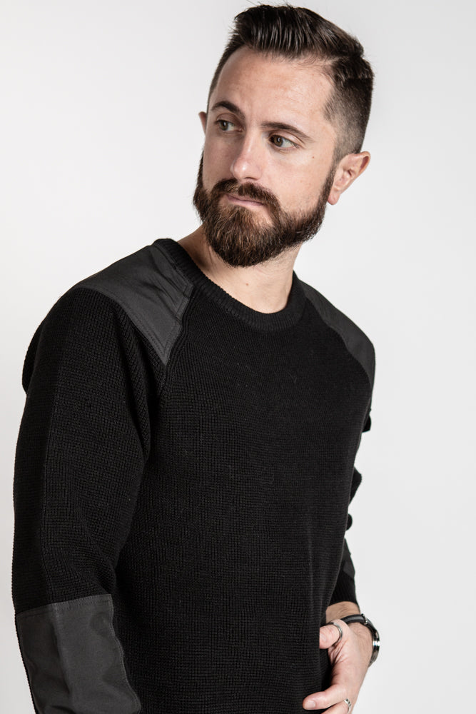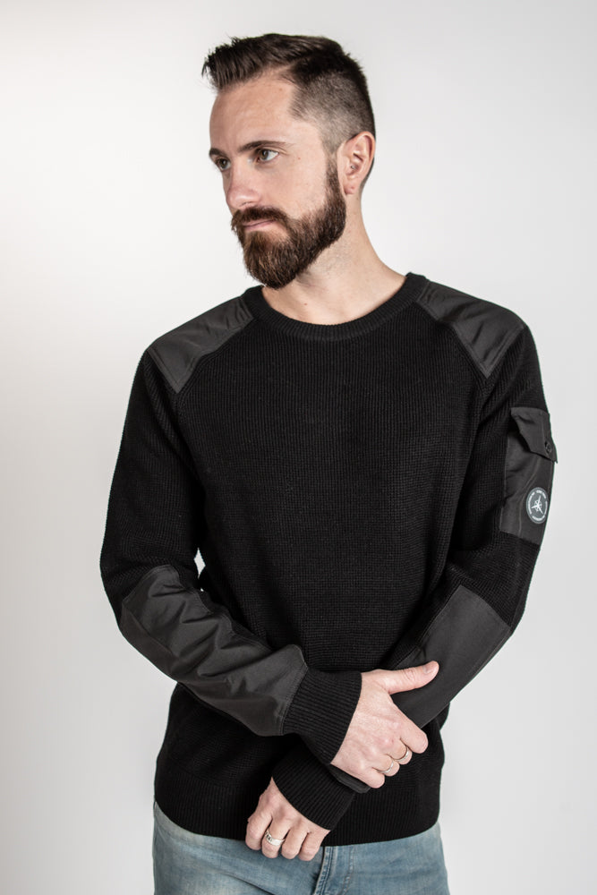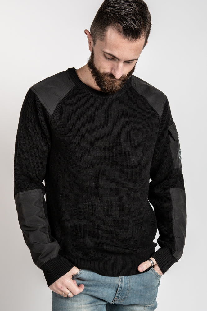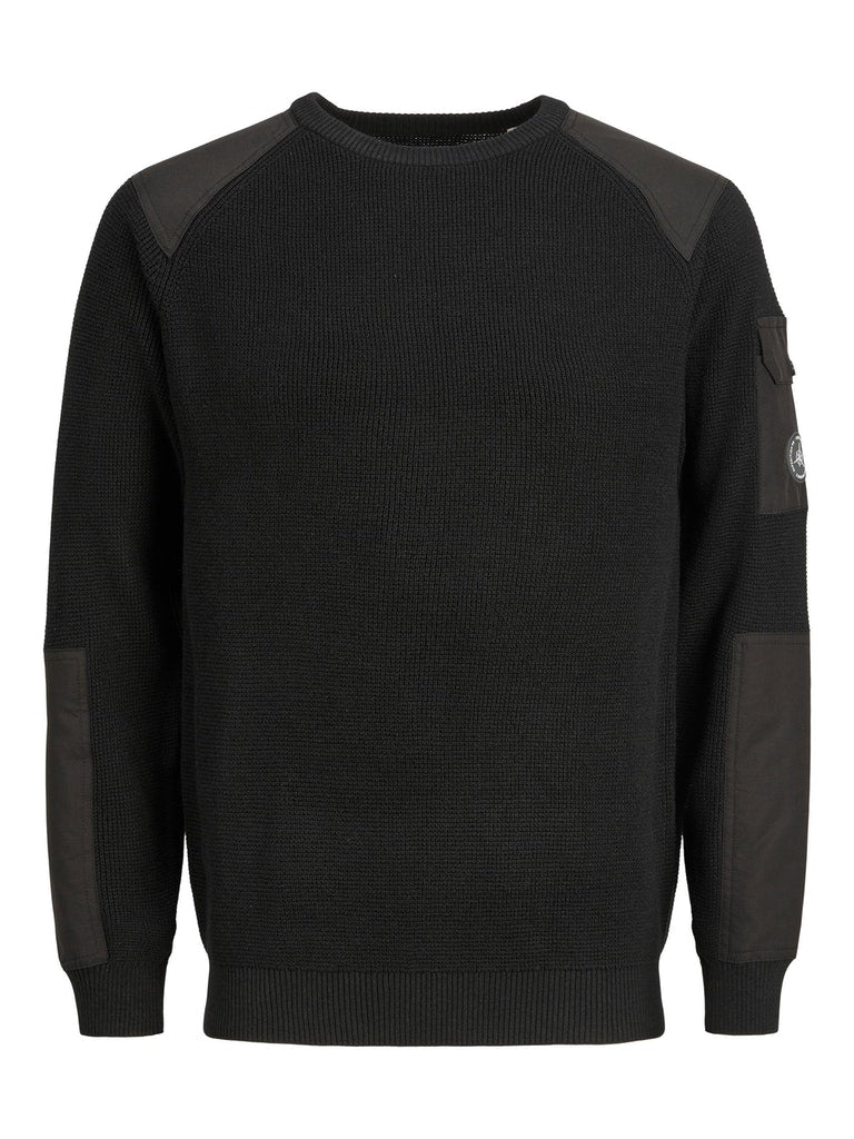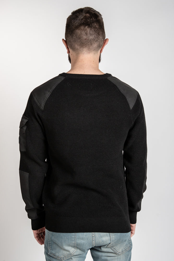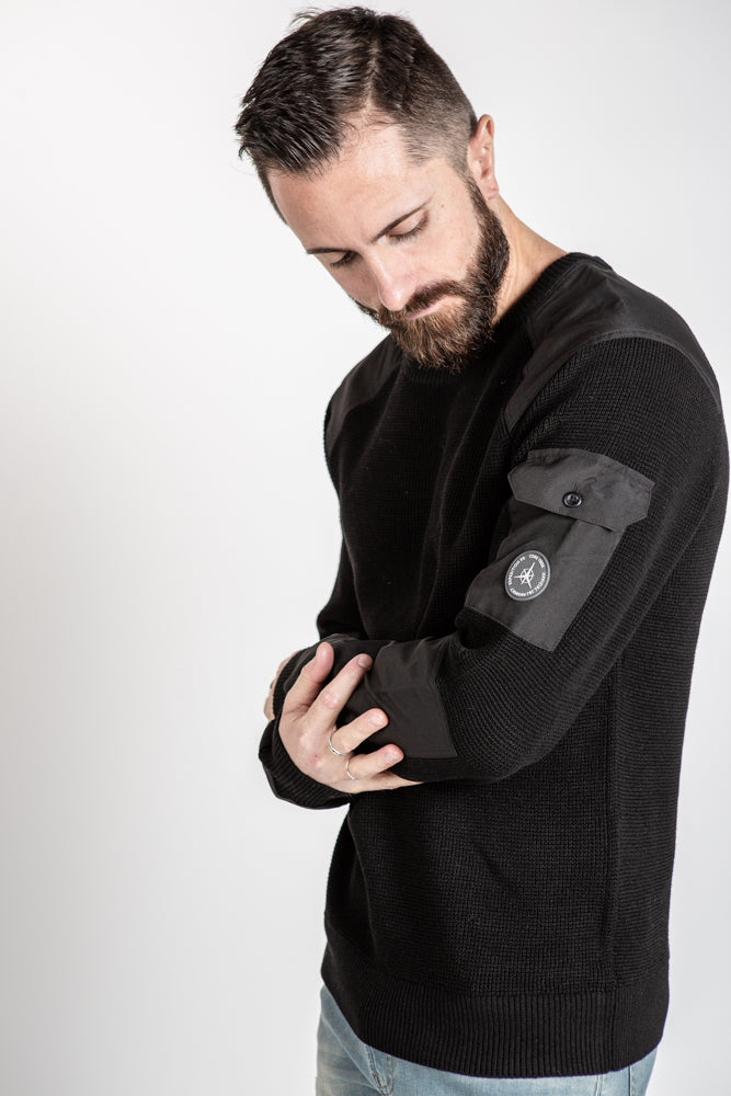 Men's knit cotton long sleeve pullover in black. Accent cable knit.