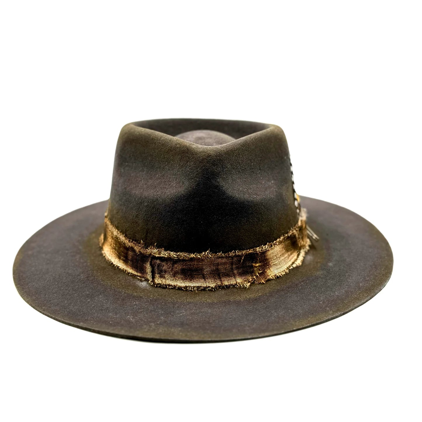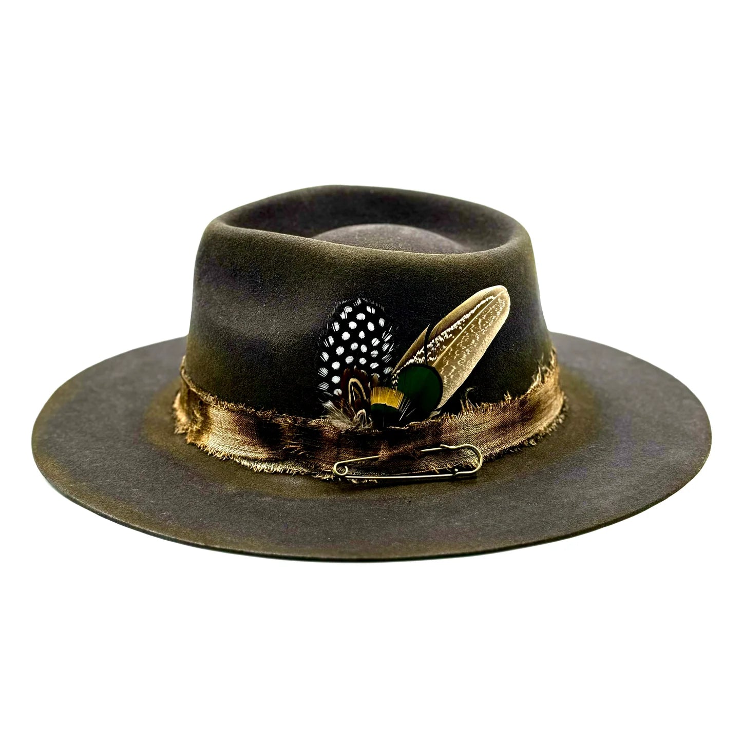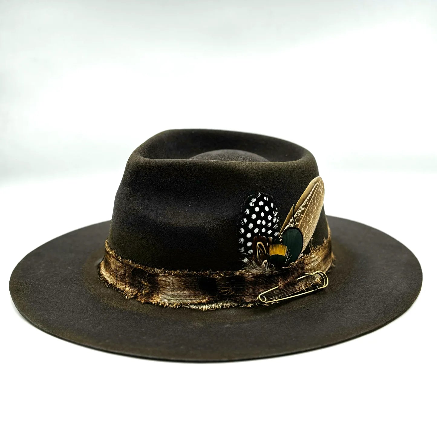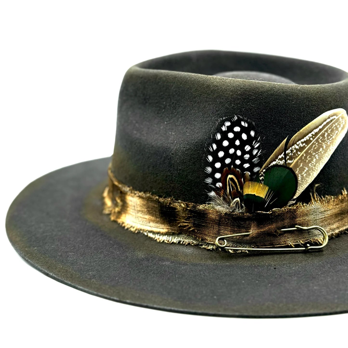 The Custom Fedora - Dash is a locally made hat crafted from 100% Australian Wool Felt, ensuring both quality and durability. Its special feather and vintage pin add a touch of style to its classic charcoal colour. Featuring a 3" brim size, this burnt hat is perfect for any occasion.