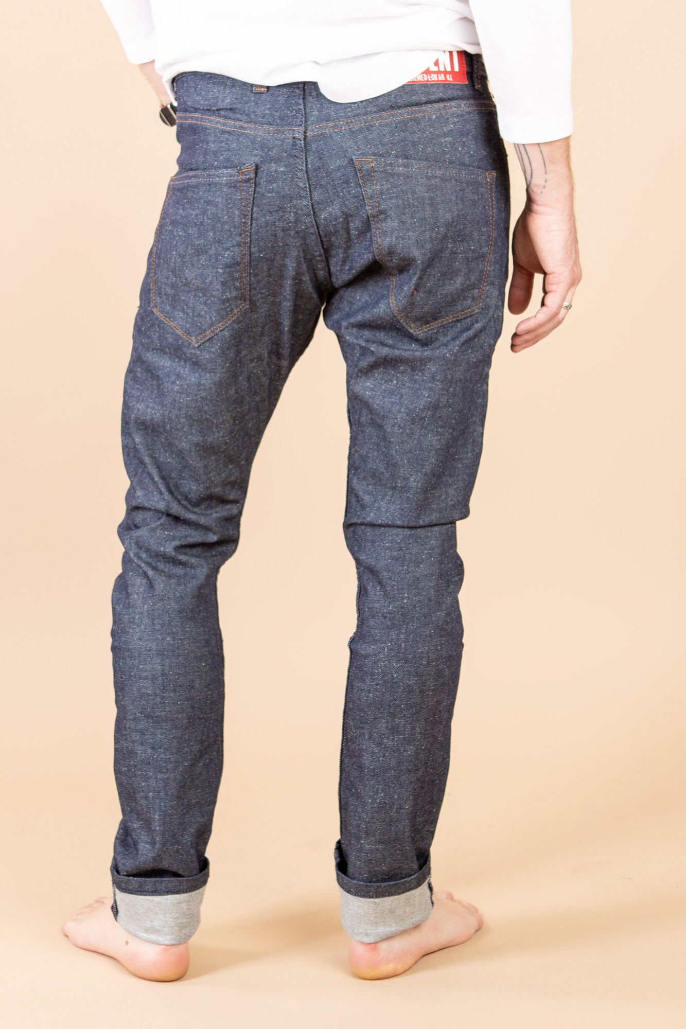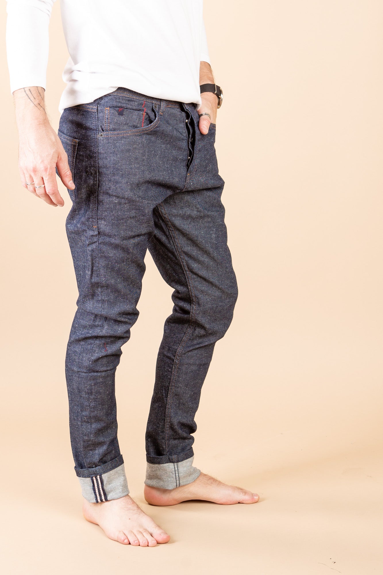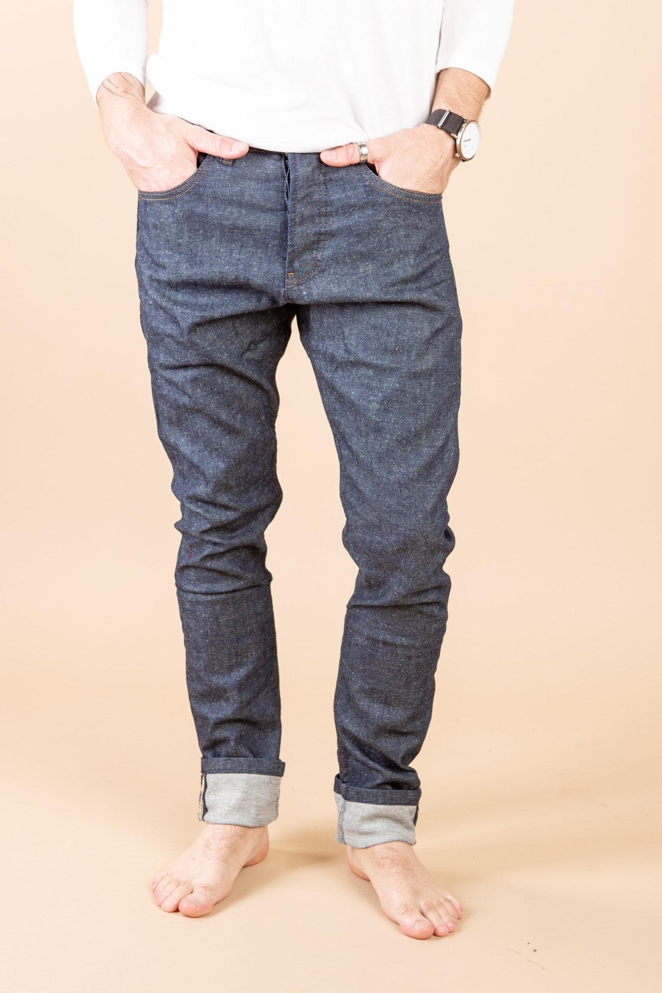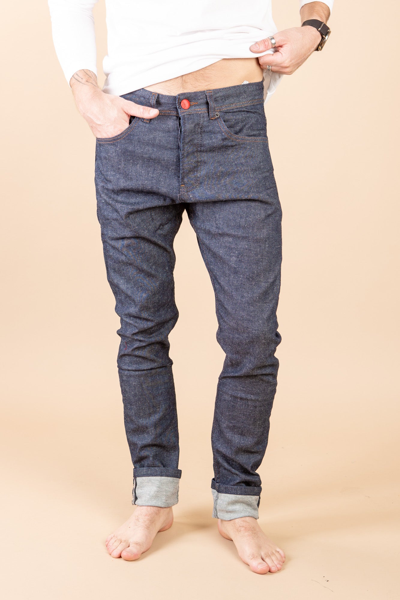 These stretch 5 pocket jeans feature a tapered fit, button fly and closure with side slit pockets and welt back pockets.