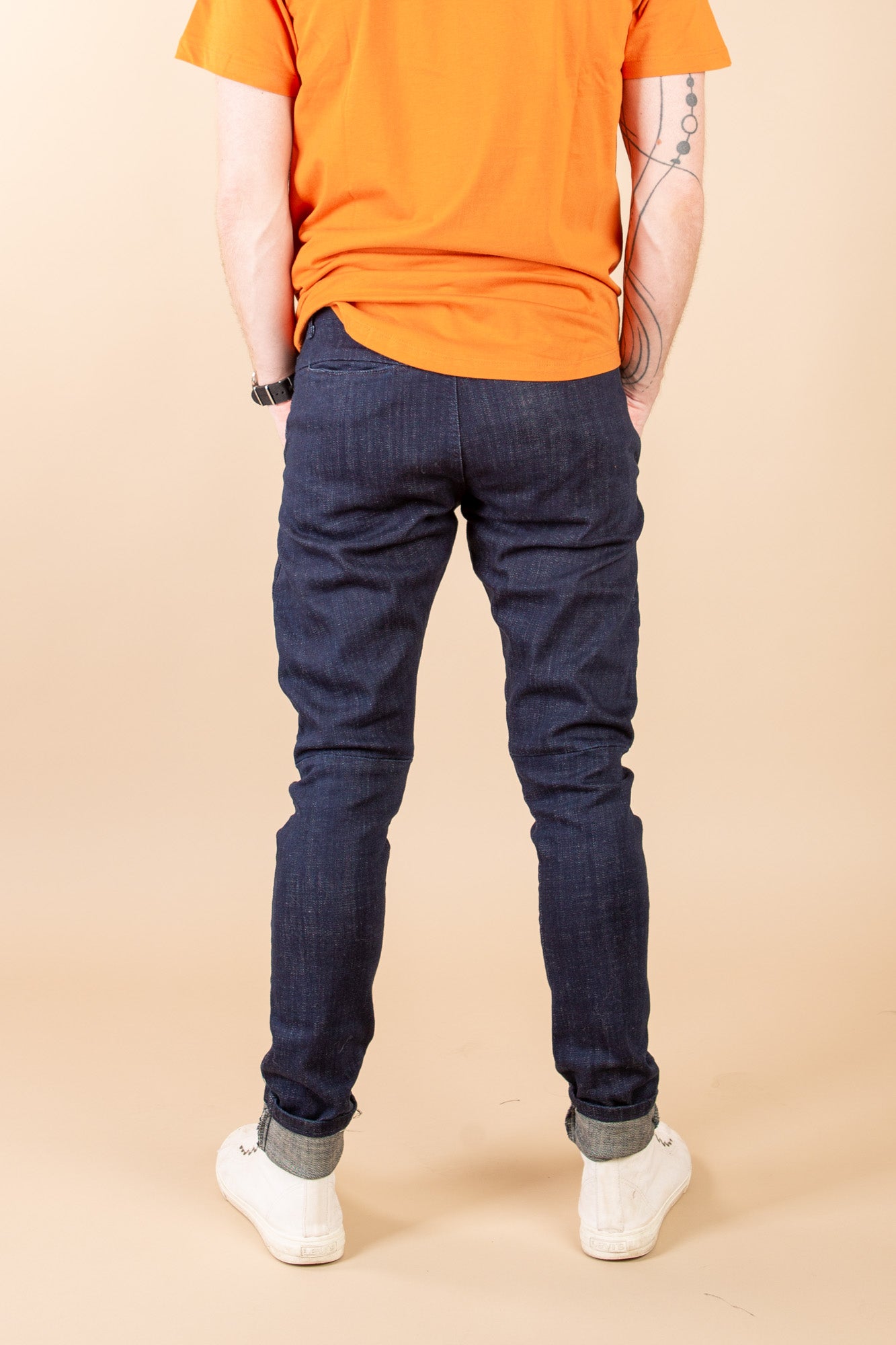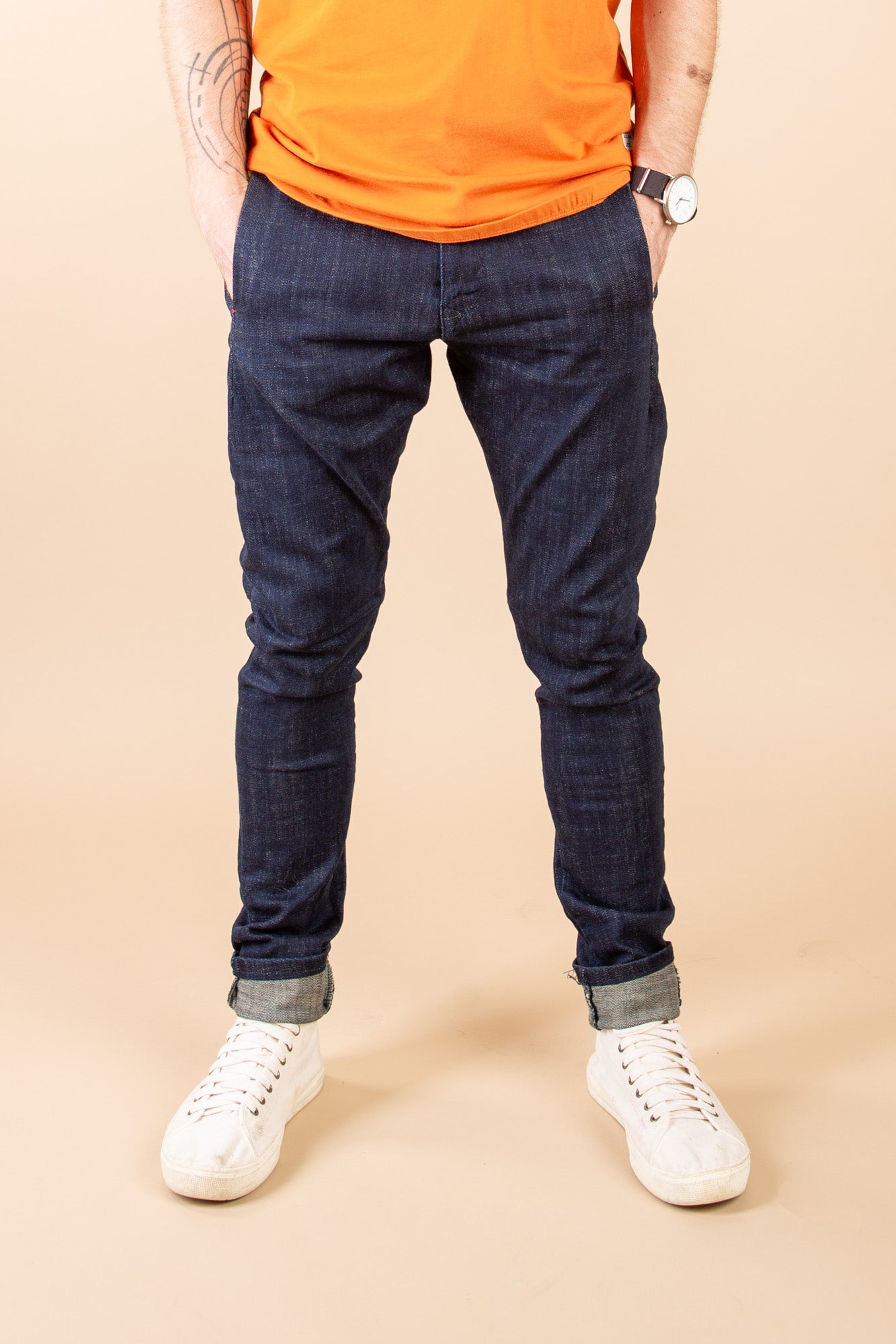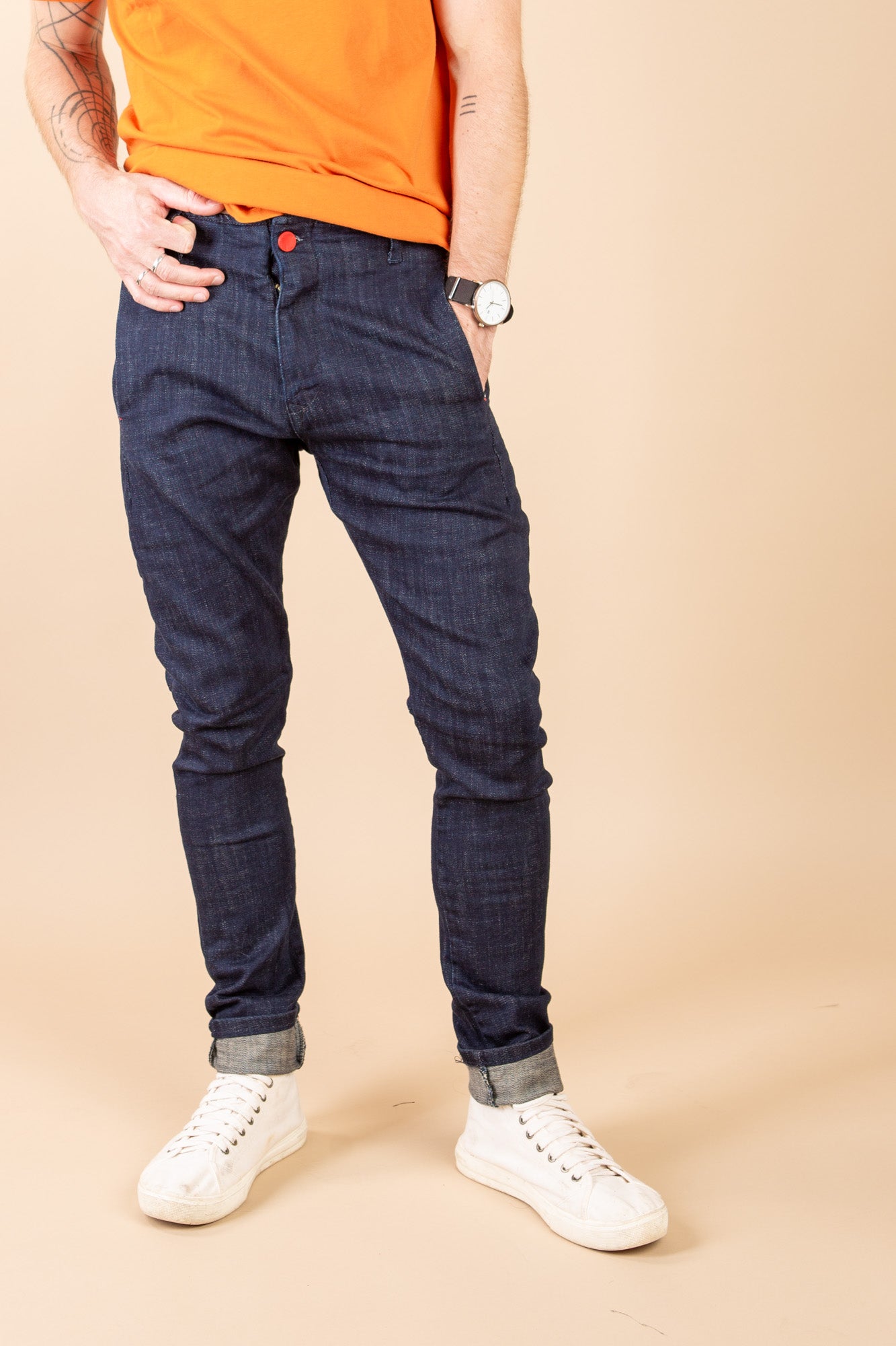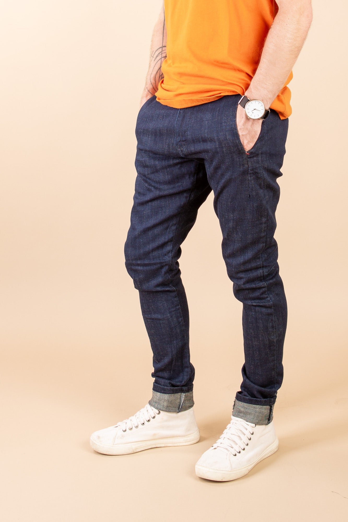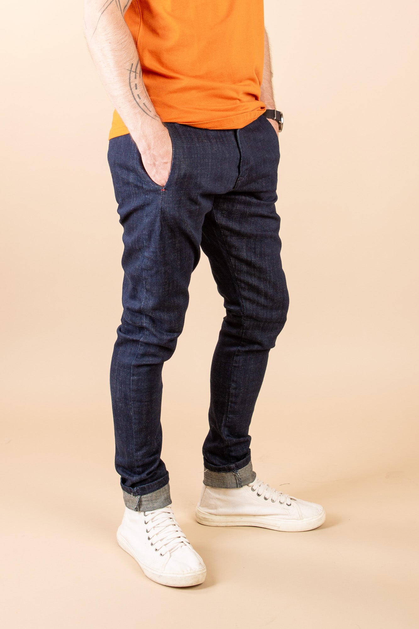 These stretch denim chino's feature a tapered fit, button closure with side slit pockets and welt back pockets.