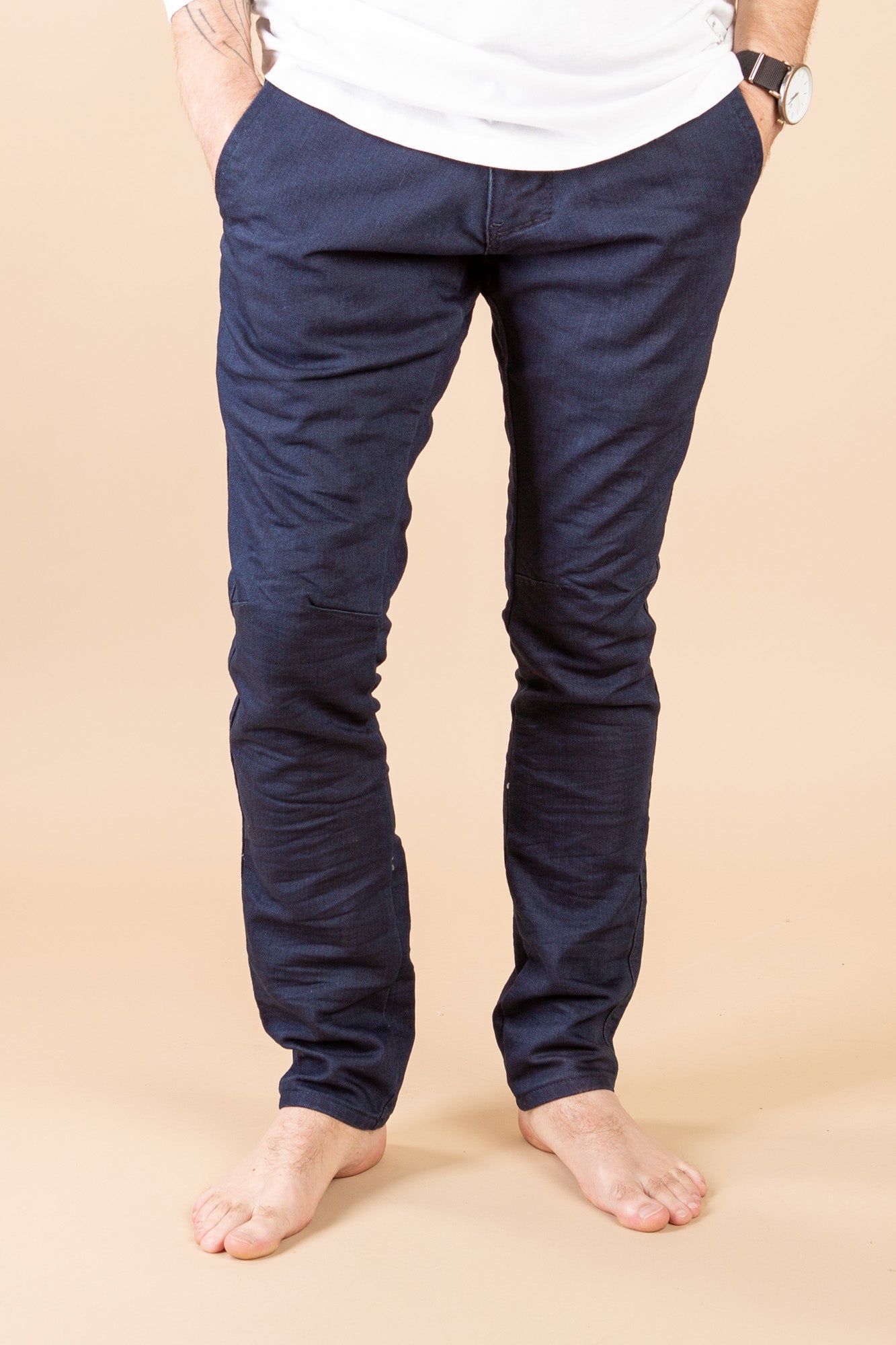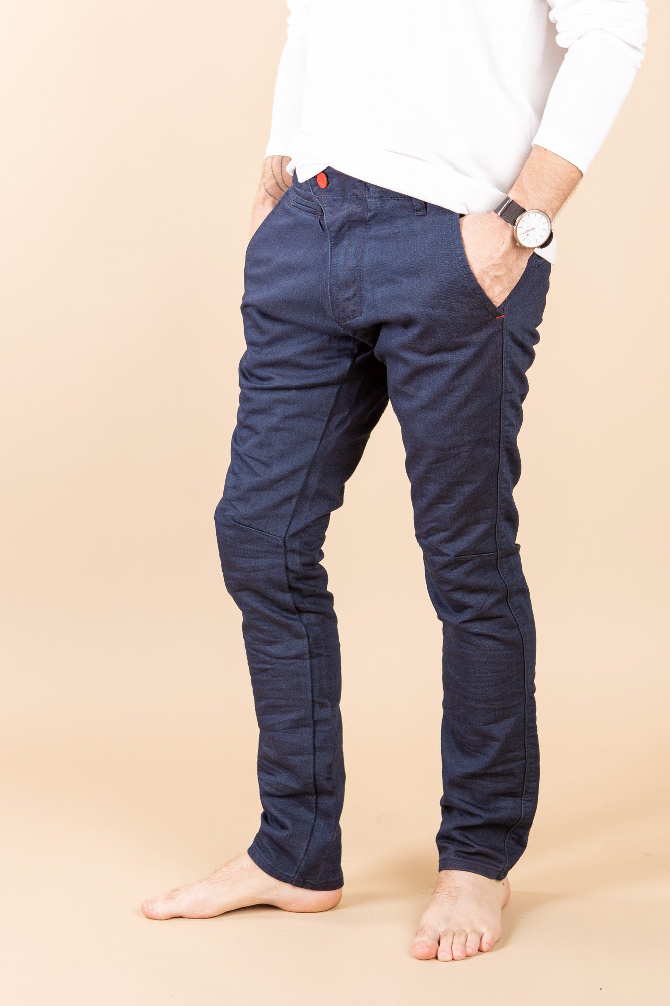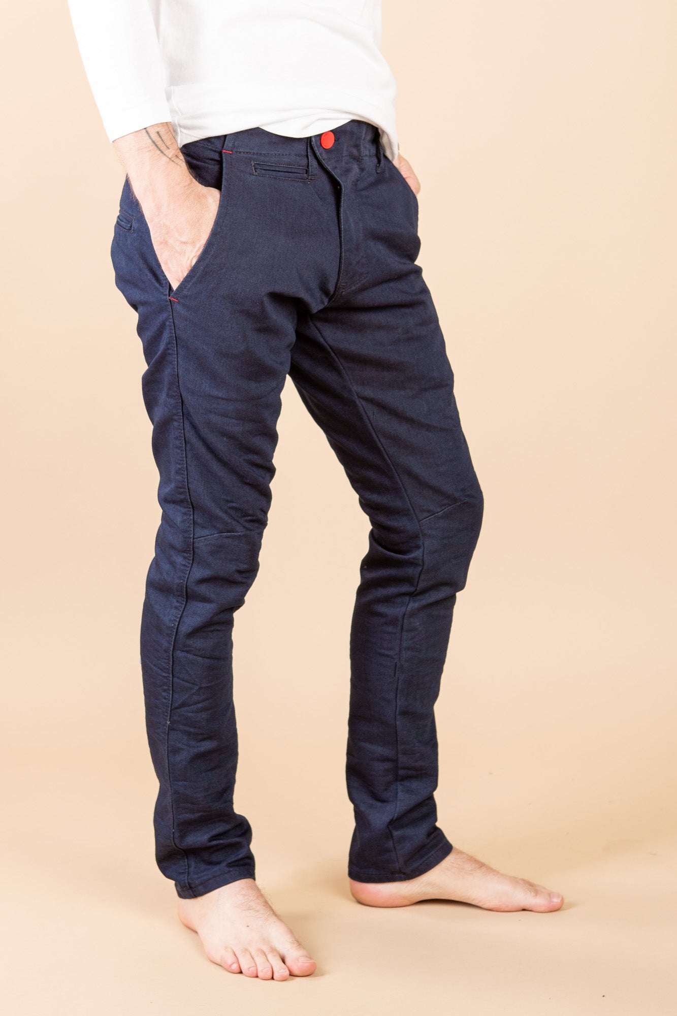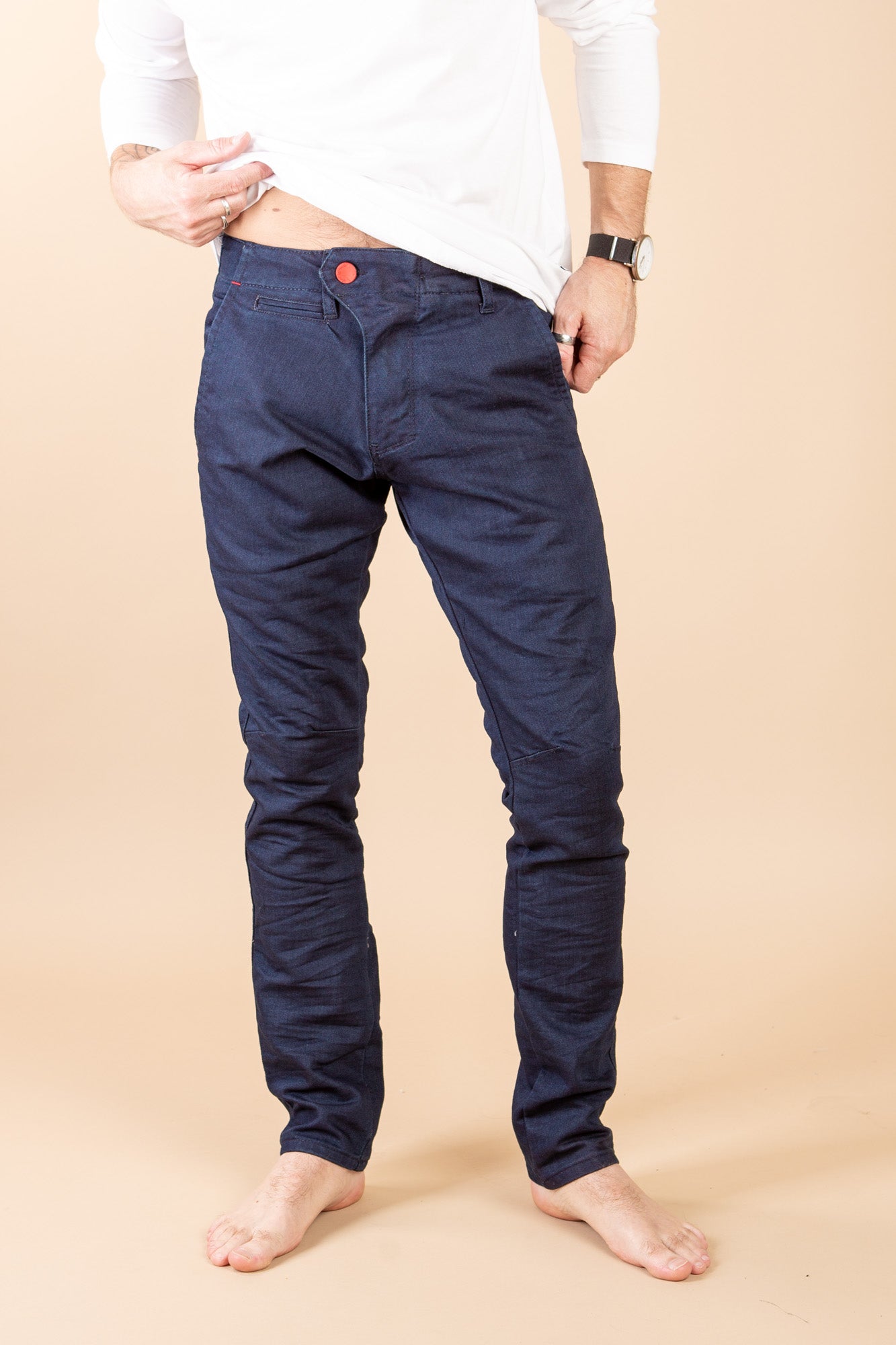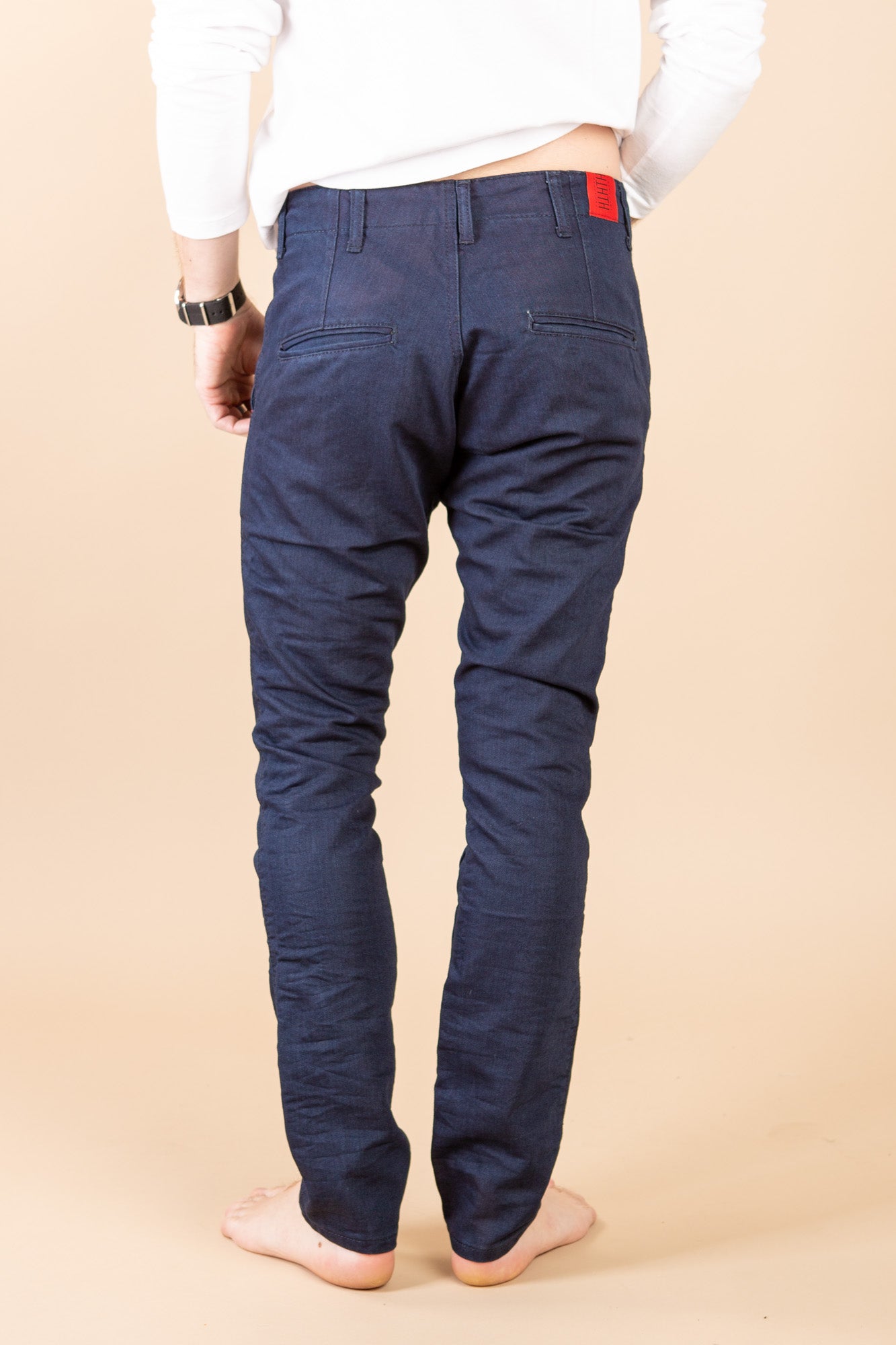 These stretch denim chino's feature a tapered fit, asymmetrical button closure with side slit pockets and welt back pockets.