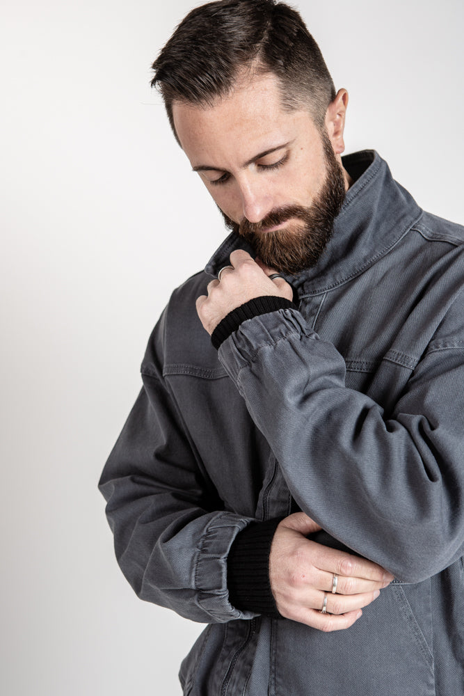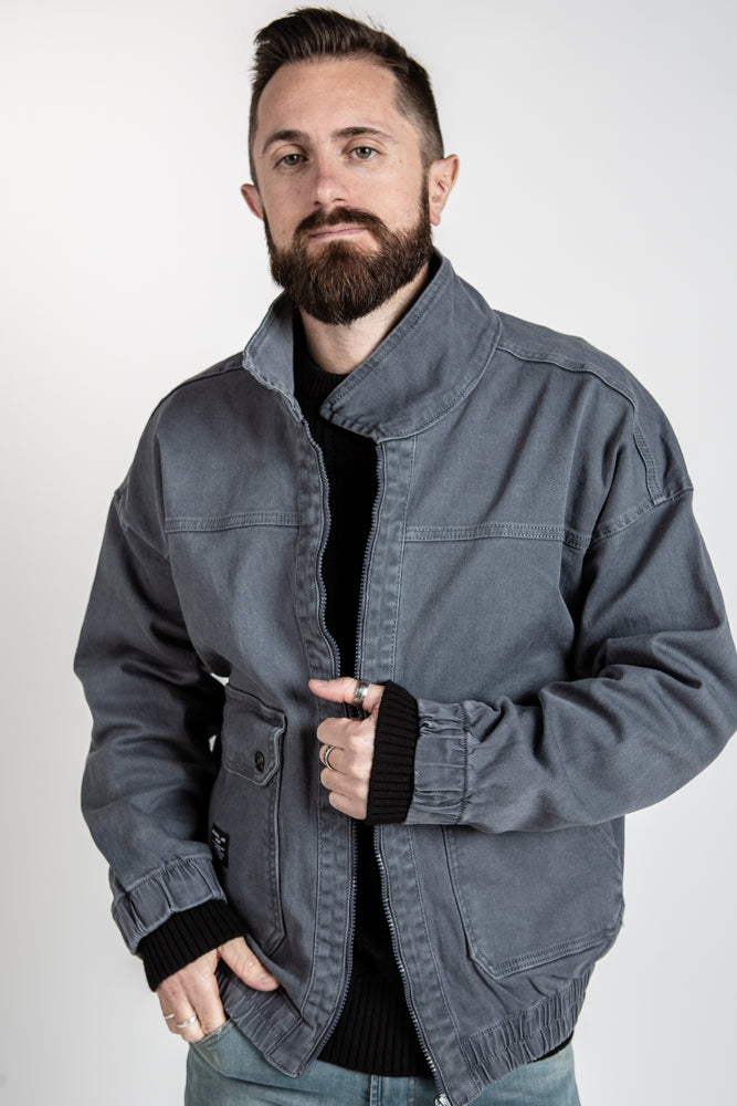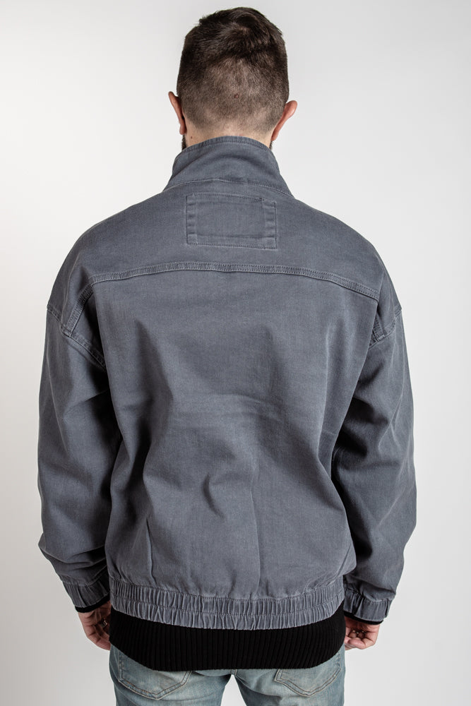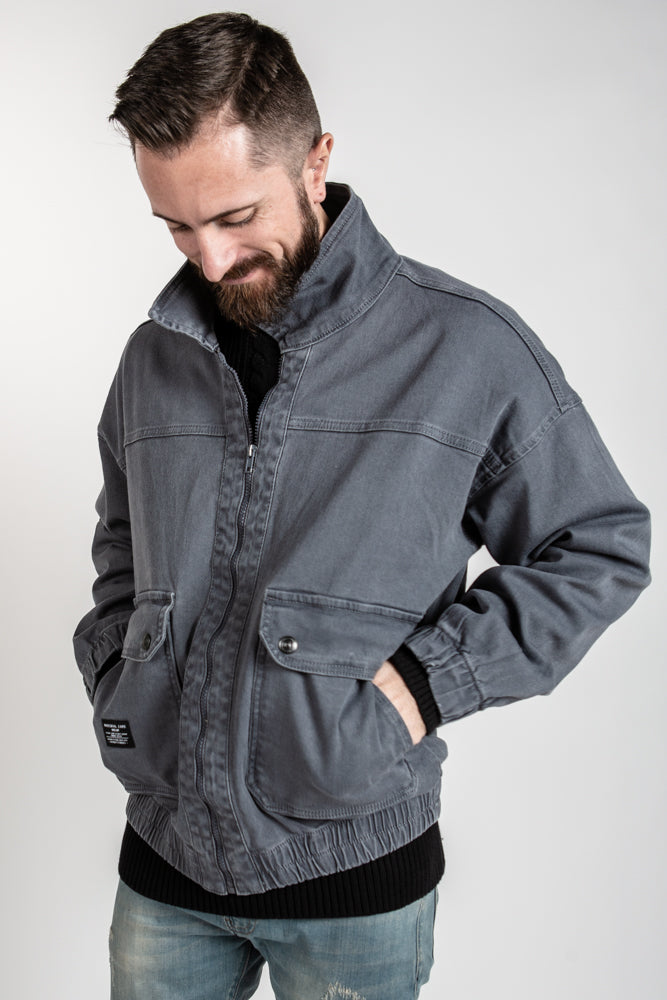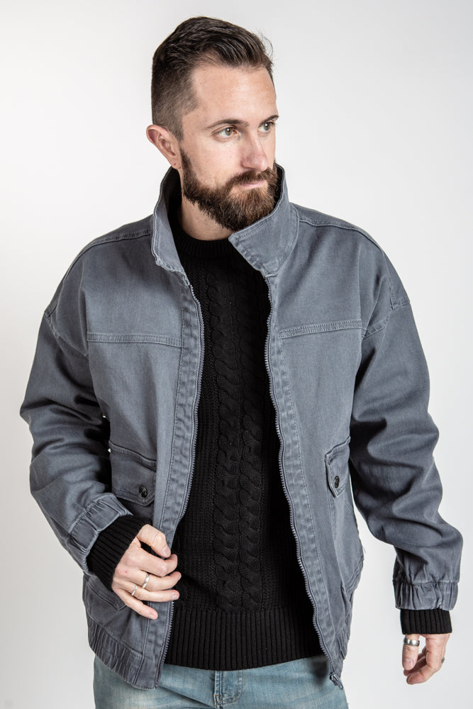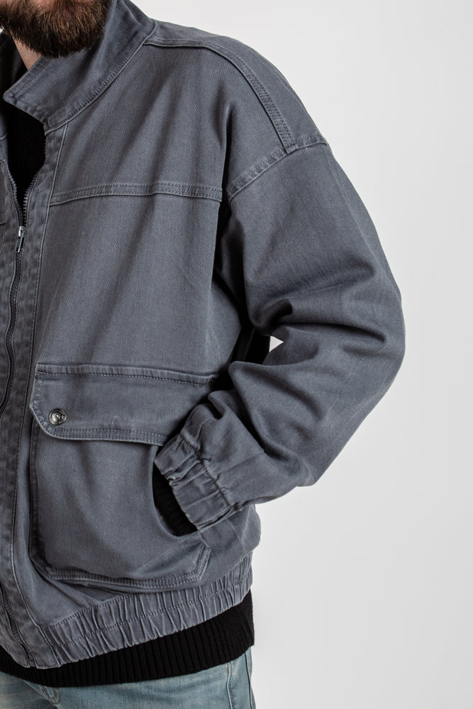 This grey DENIM BOMBER features a zip closure and gathered cuffs and bottom hem for an enhanced silhouette. Relaxed fit for a rugged look. best paired with jeans.