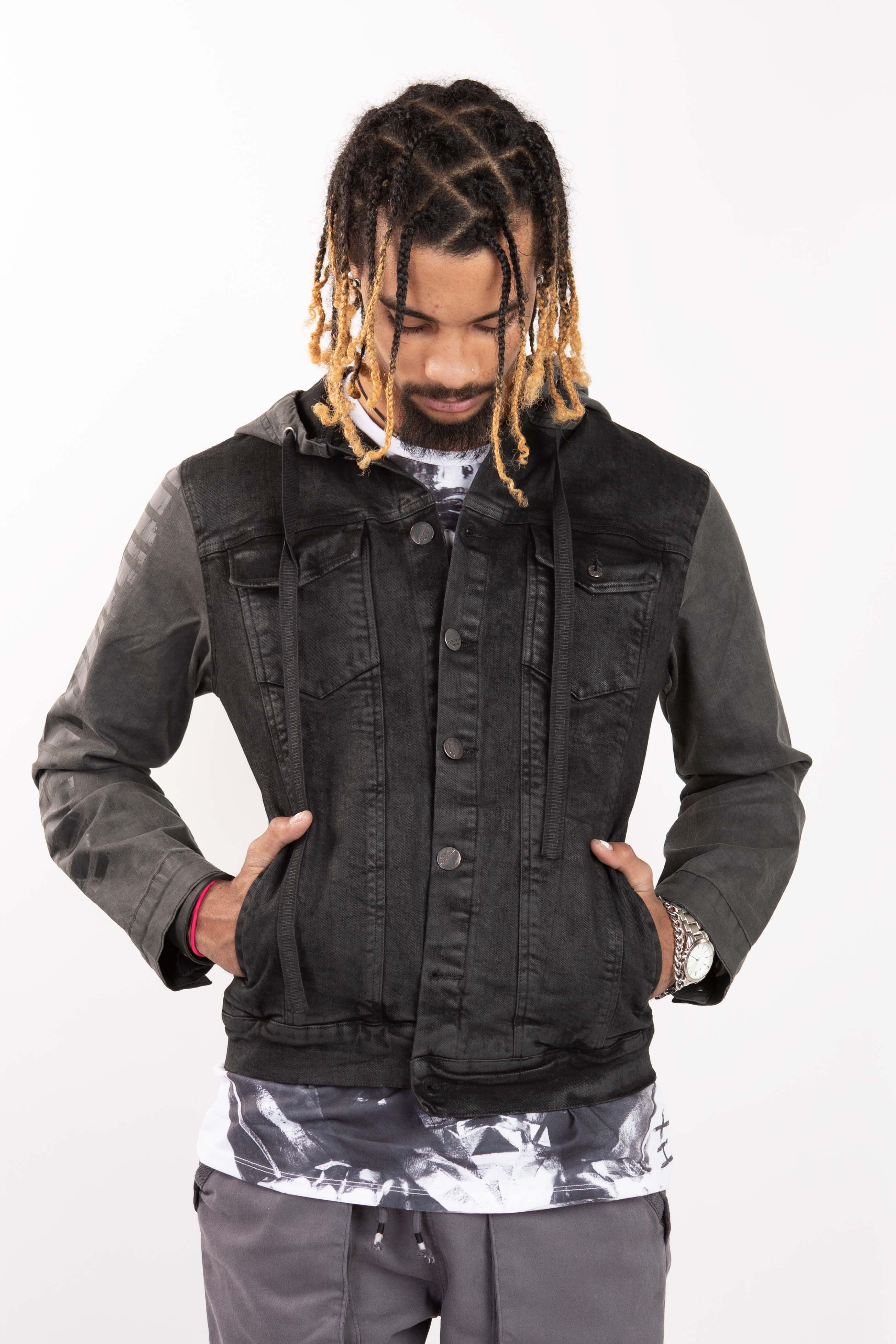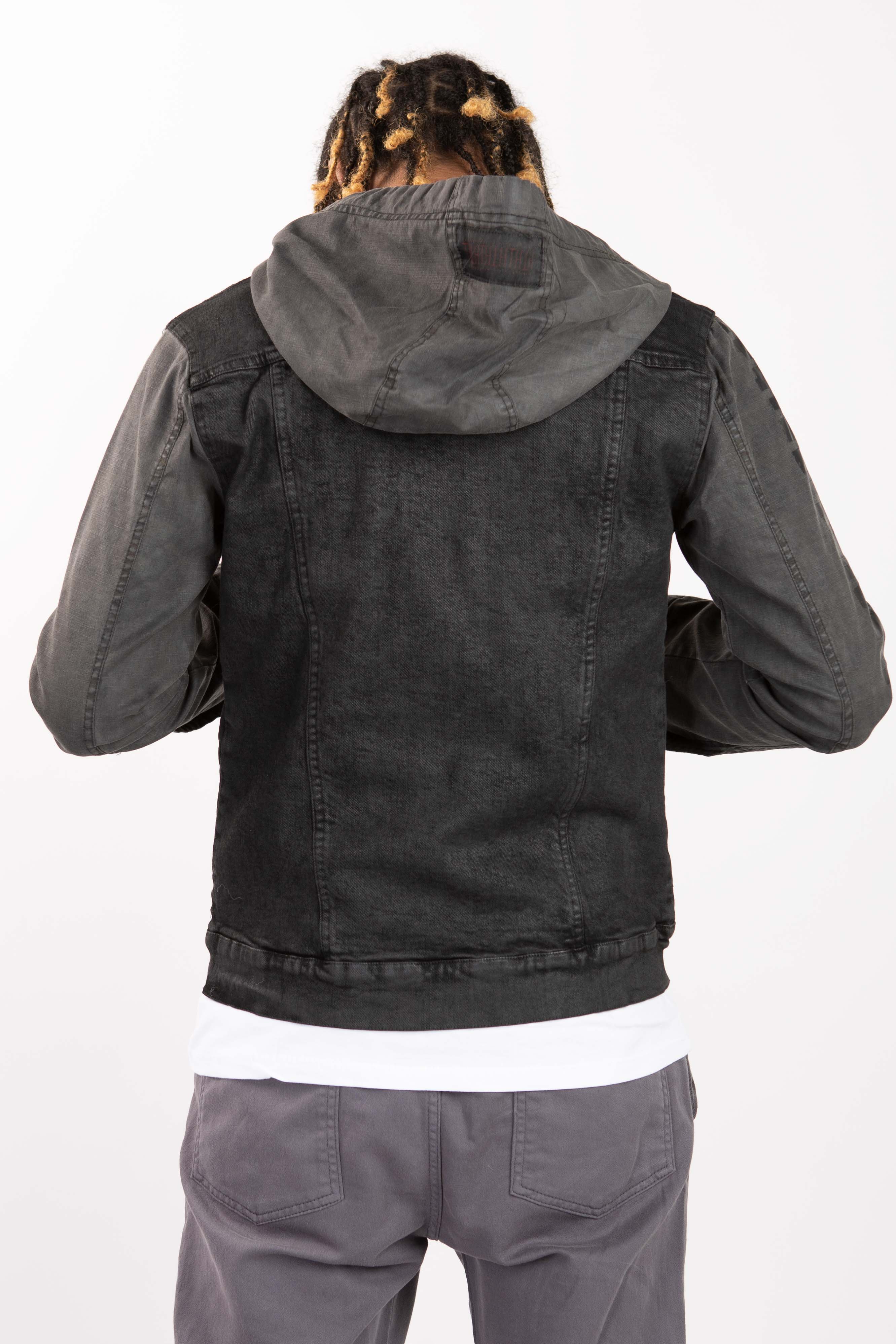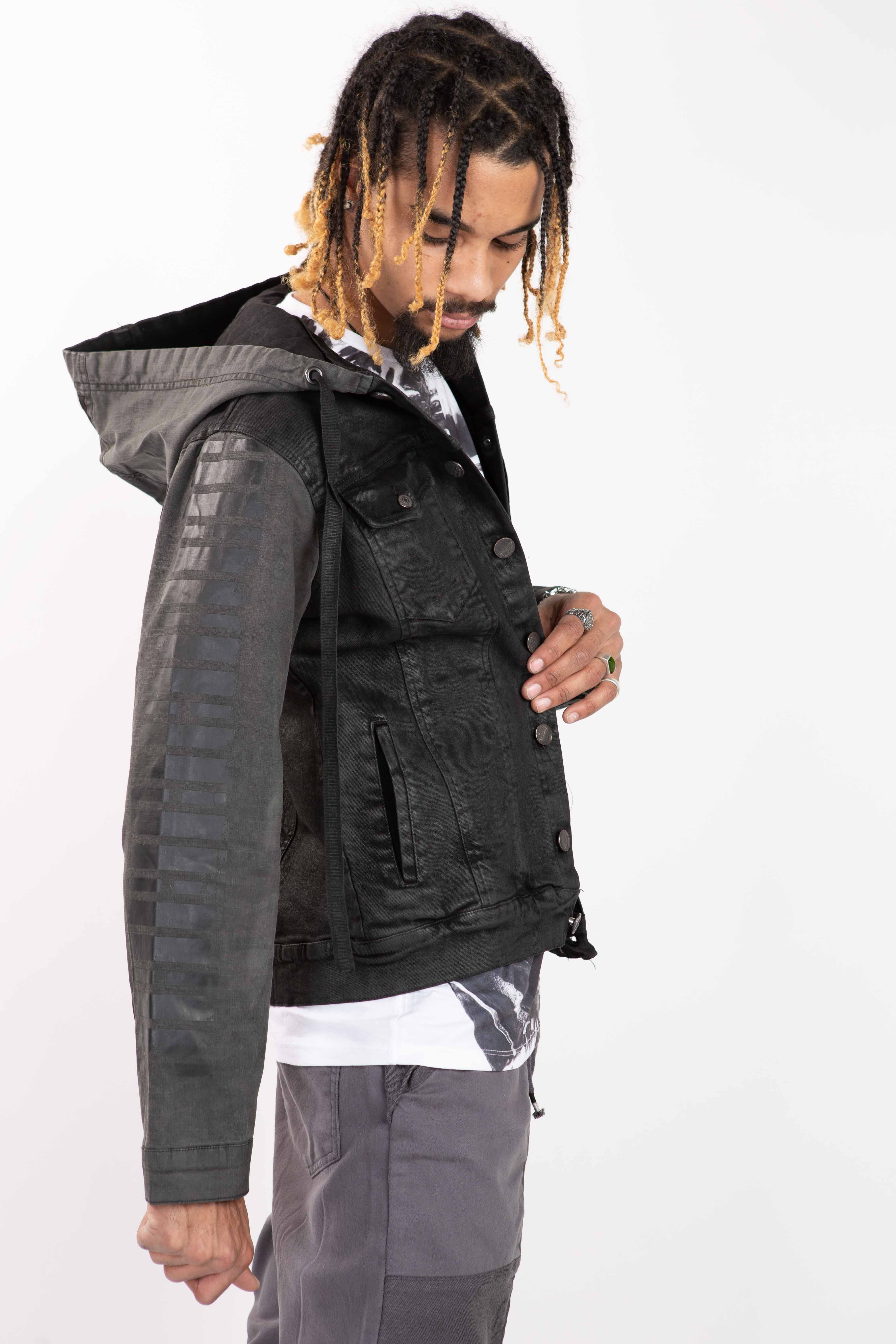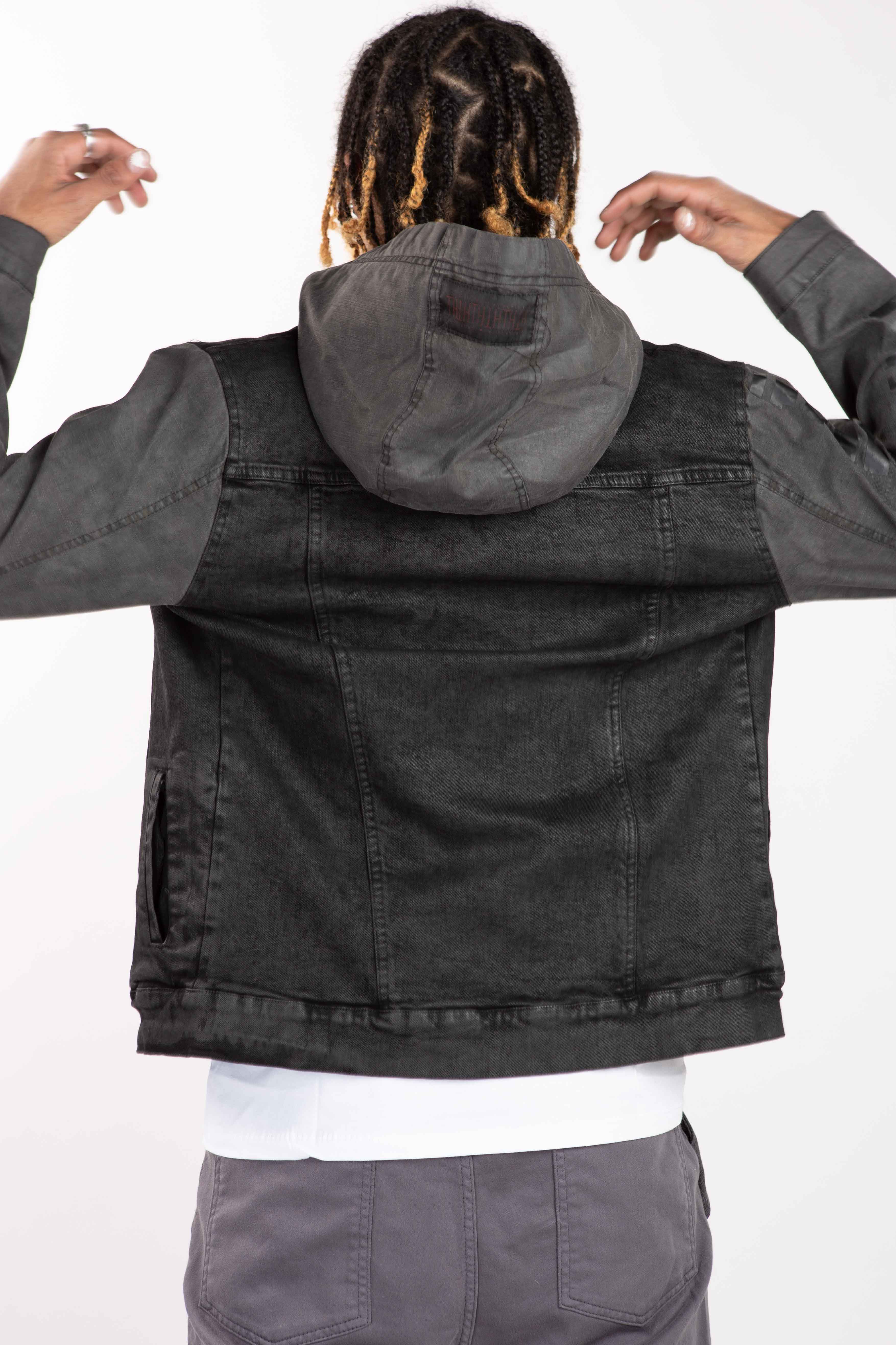A hooded denim jacket featuring a waxed wash, long sleeves in charcoal wash, chest flap pockets, front slant pockets, and front button closures.