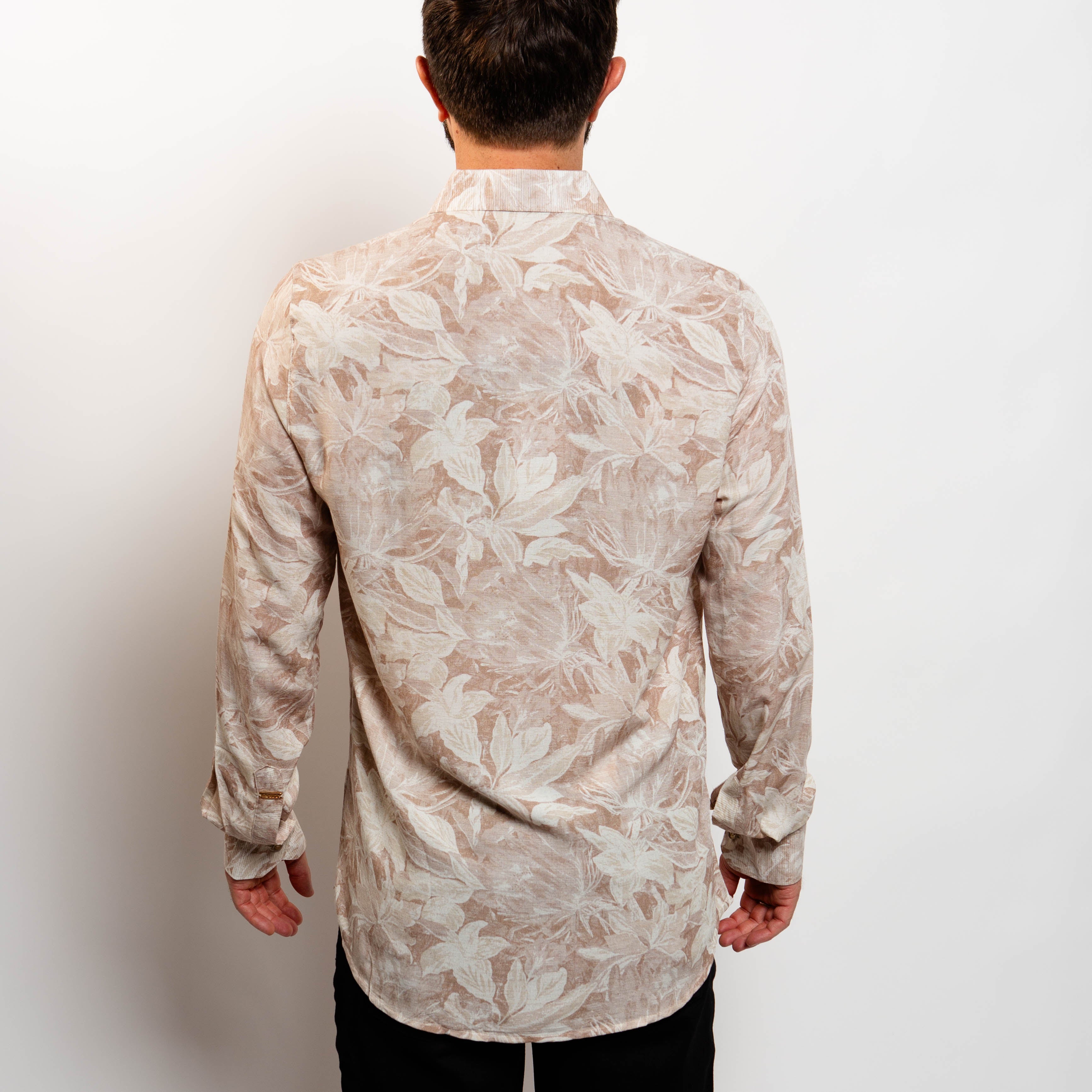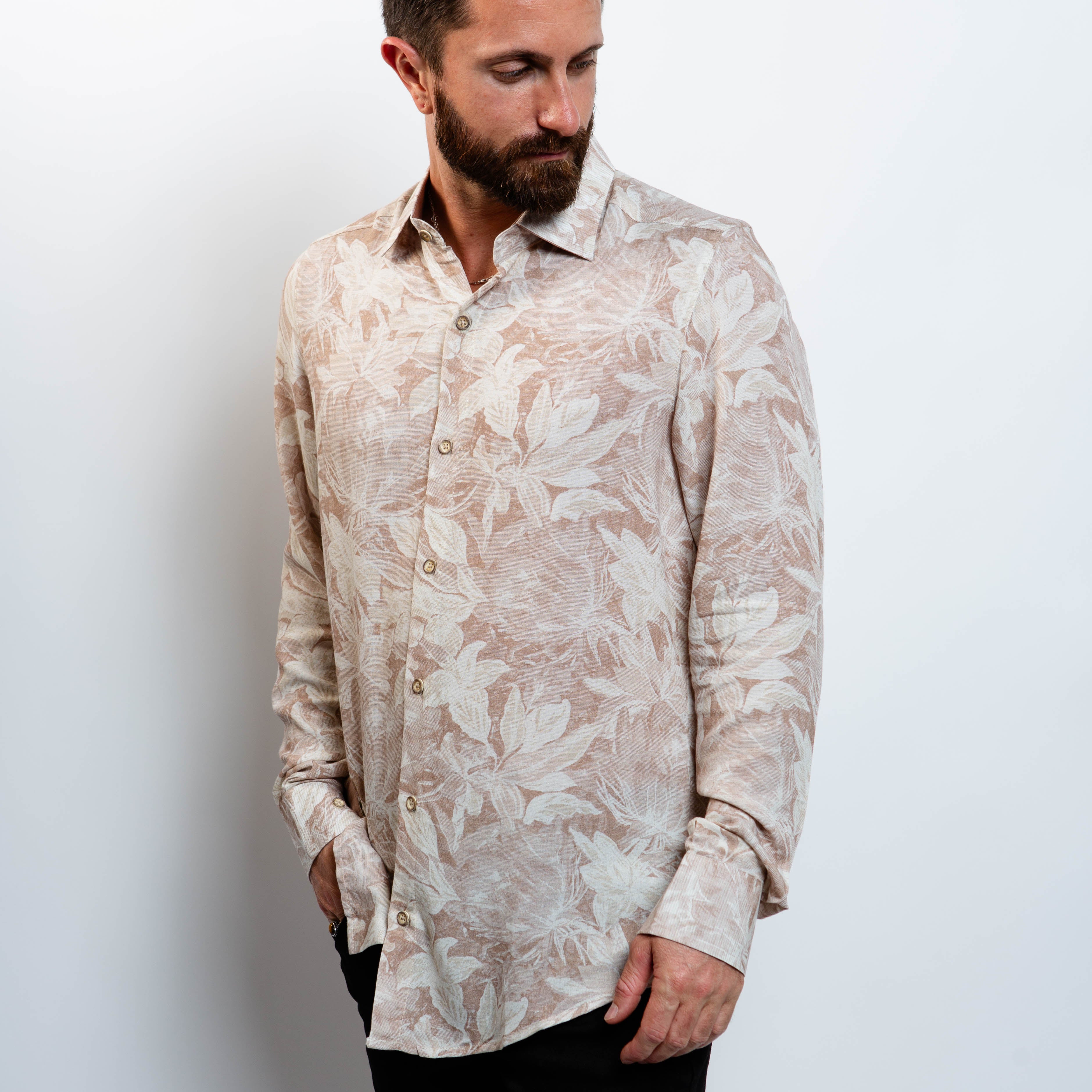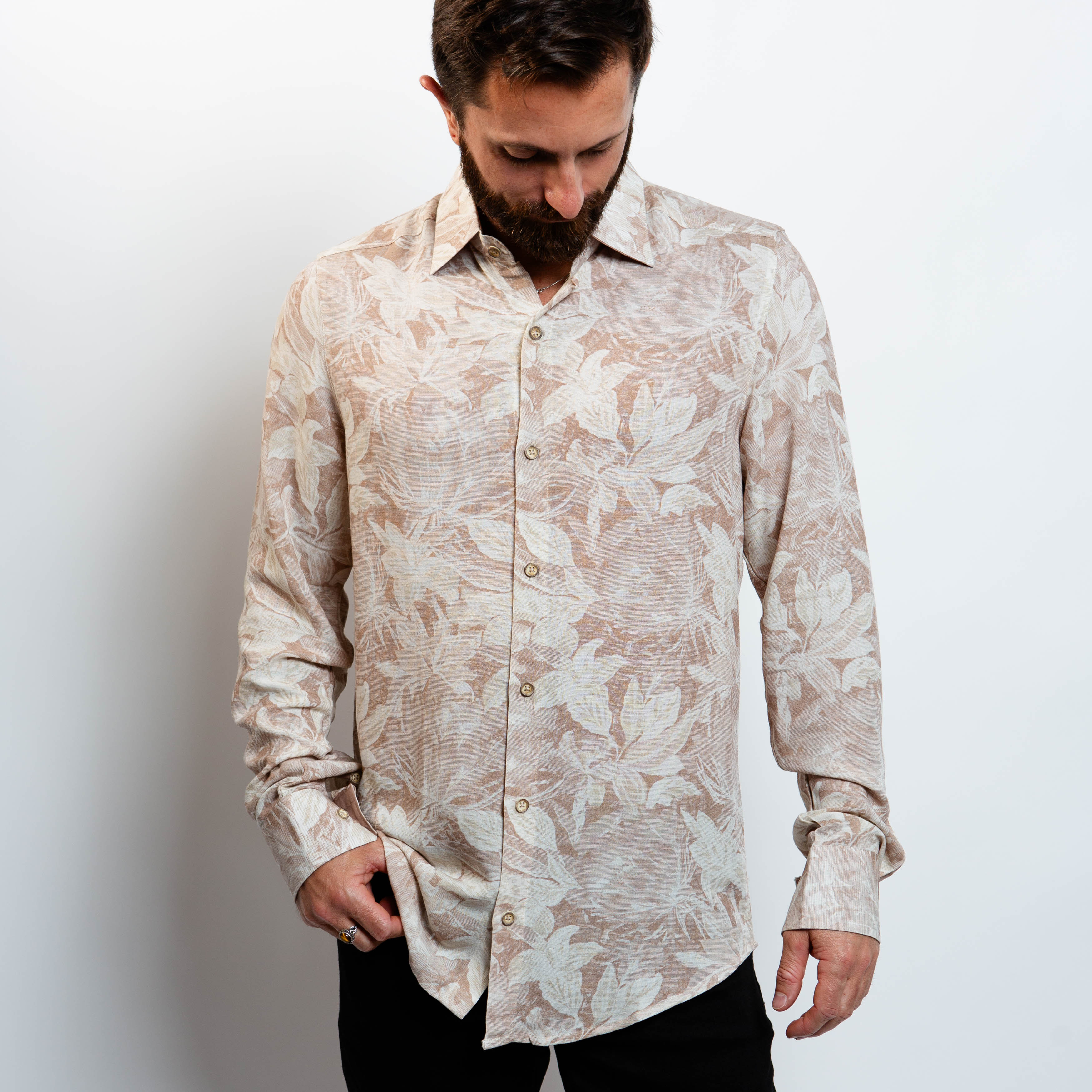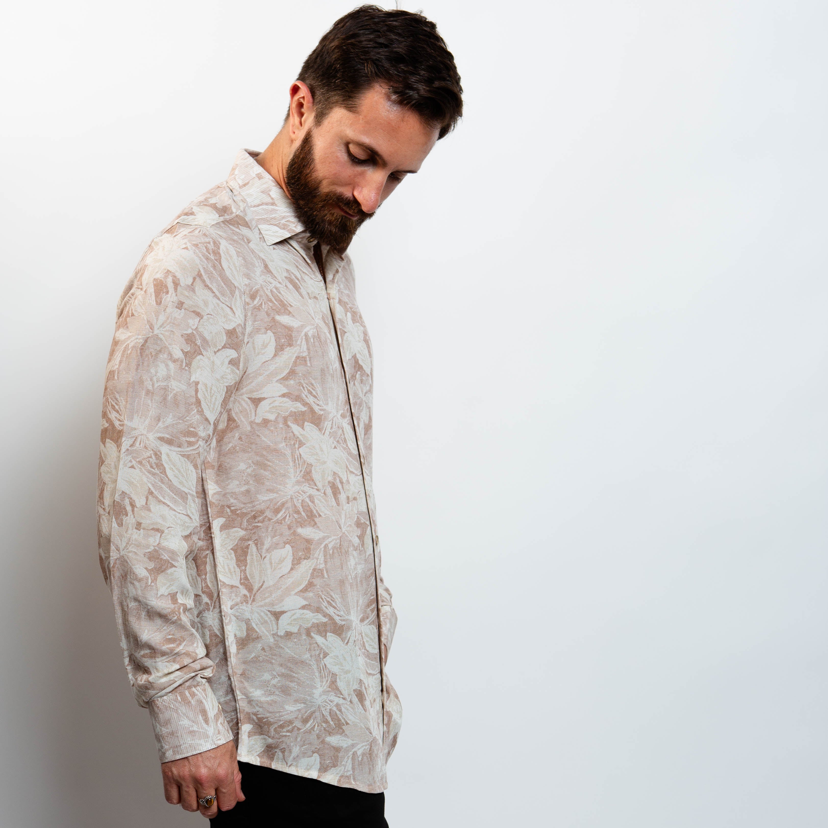 An effortless blend of elegance and ease. The Desert Bloom Shirt is crafted from an ultra-lightweight semi-sheer fabric that breathes like linen but drapes with polish. Featuring a subtle sandstone palette with an all-over textured floral motif, this long sleeve button-up captures a soft masculinity that works from golden hour to after dark.