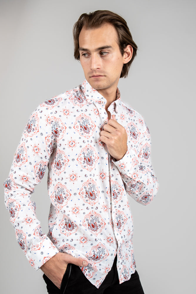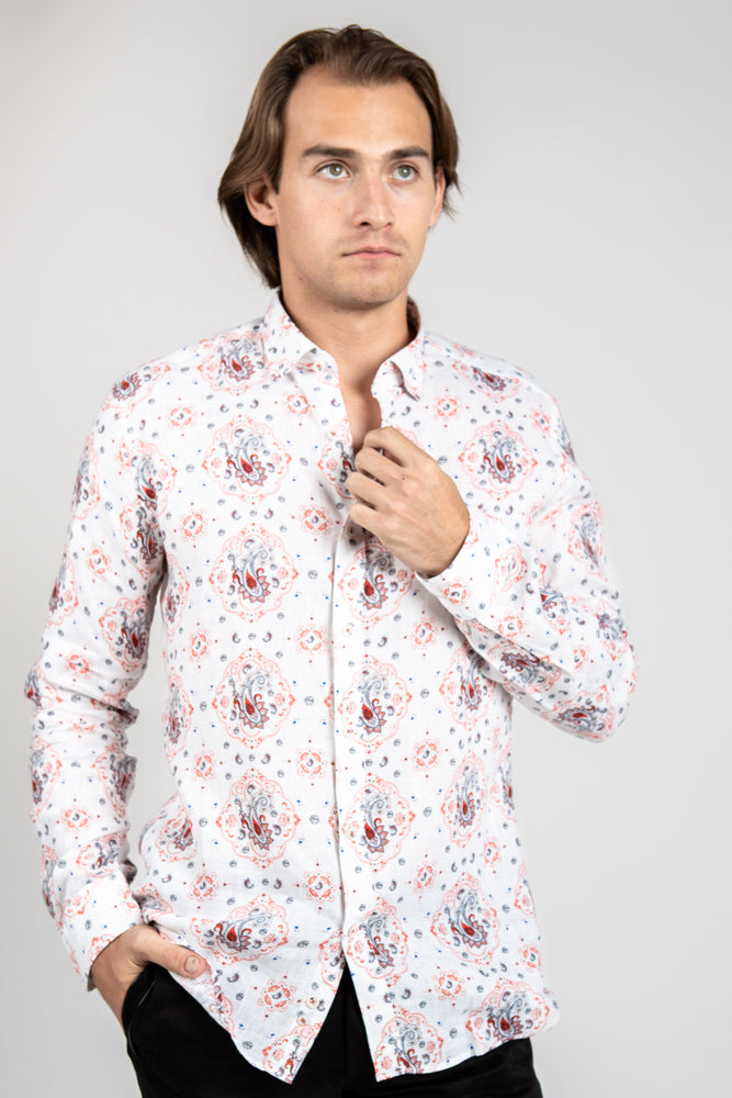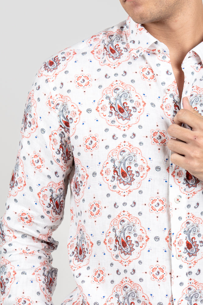 Slim fit printed linen shirt in white paisley