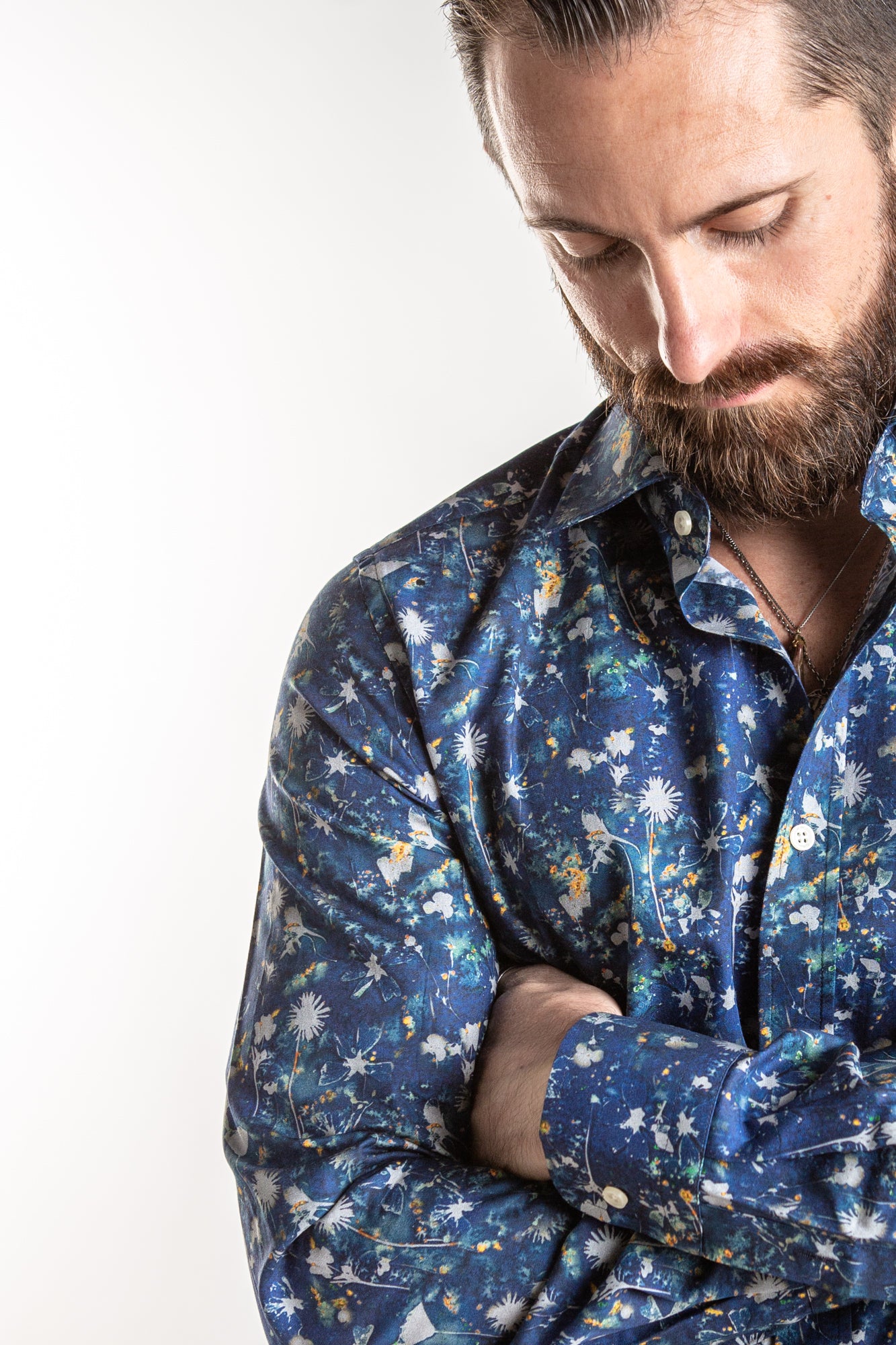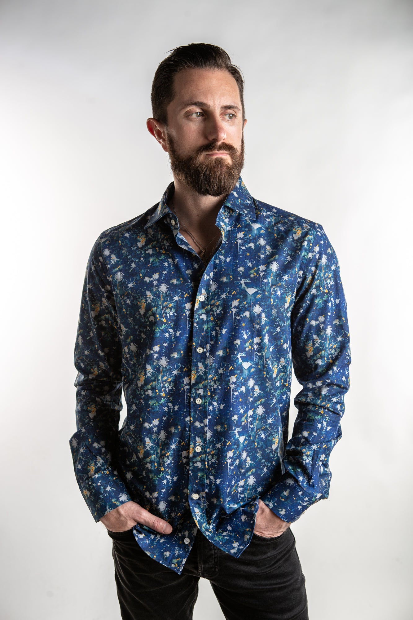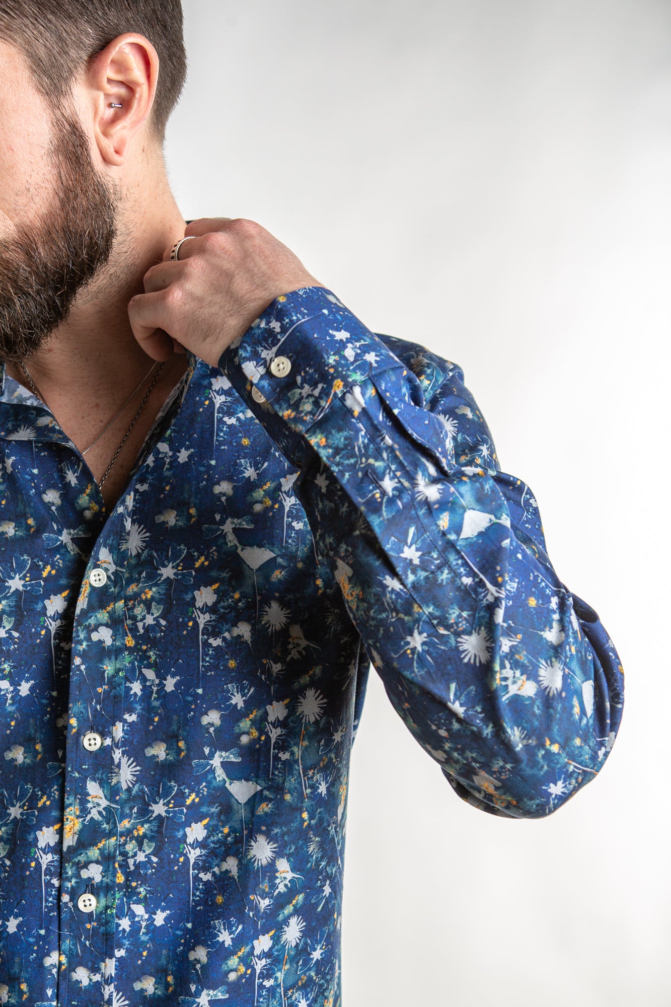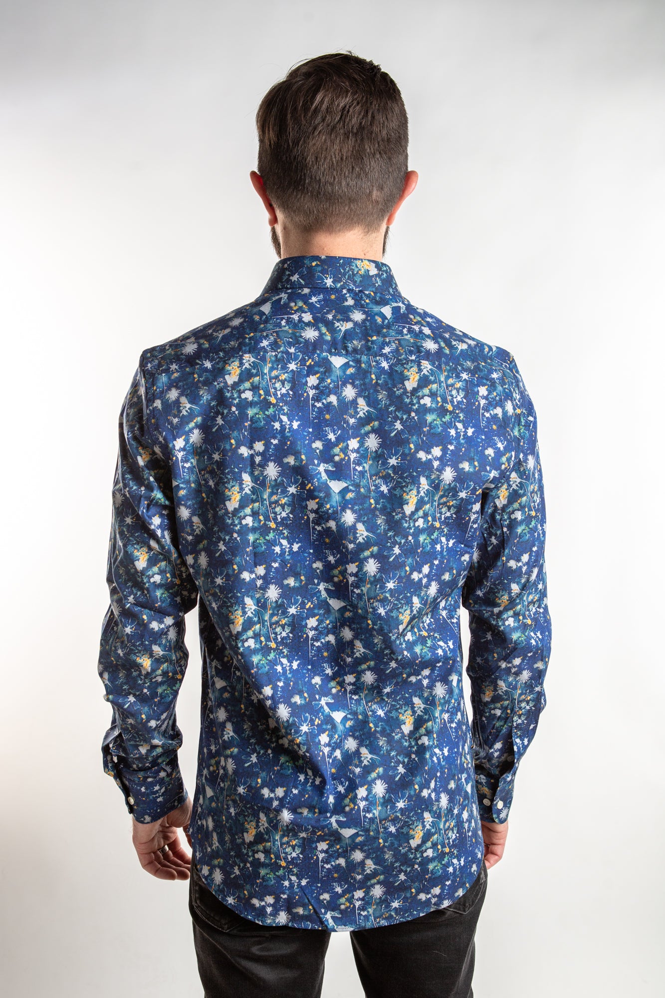 Slim Fit printed navy floral long sleeve collared, dress shirt for men. Enjoy the elegant look of a slim fit dress shirt. This fashionable garment features stylish printed blue florals on a long sleeve, perfect for any formal occasion.
