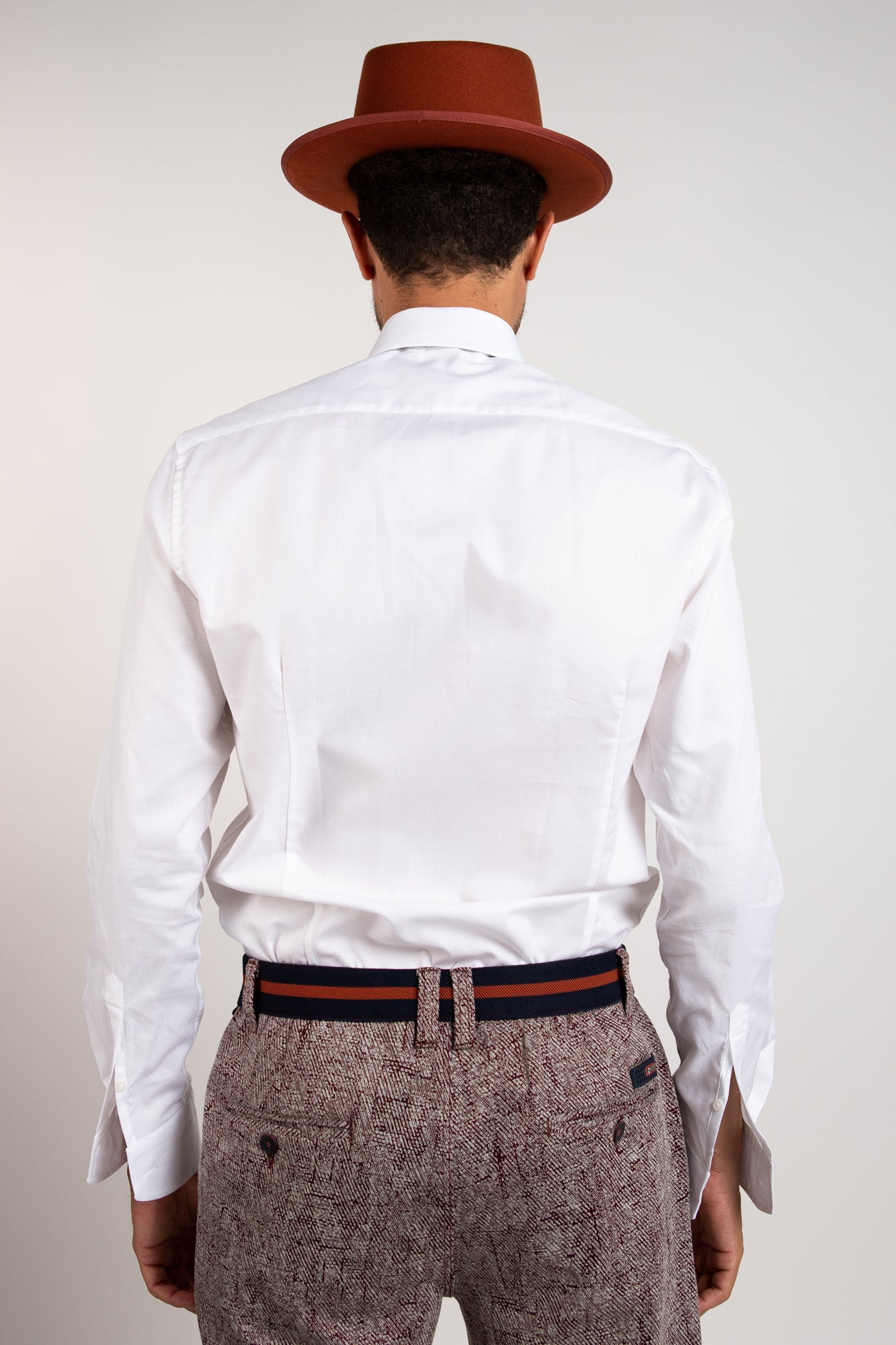 A cotton woven tapered shirt in textured white; This cotton dress shirt is an easy-care cotton that was specially treated to be less likely to wrinkle, this tapered fit dress shirt is Ideal for all special occasions.