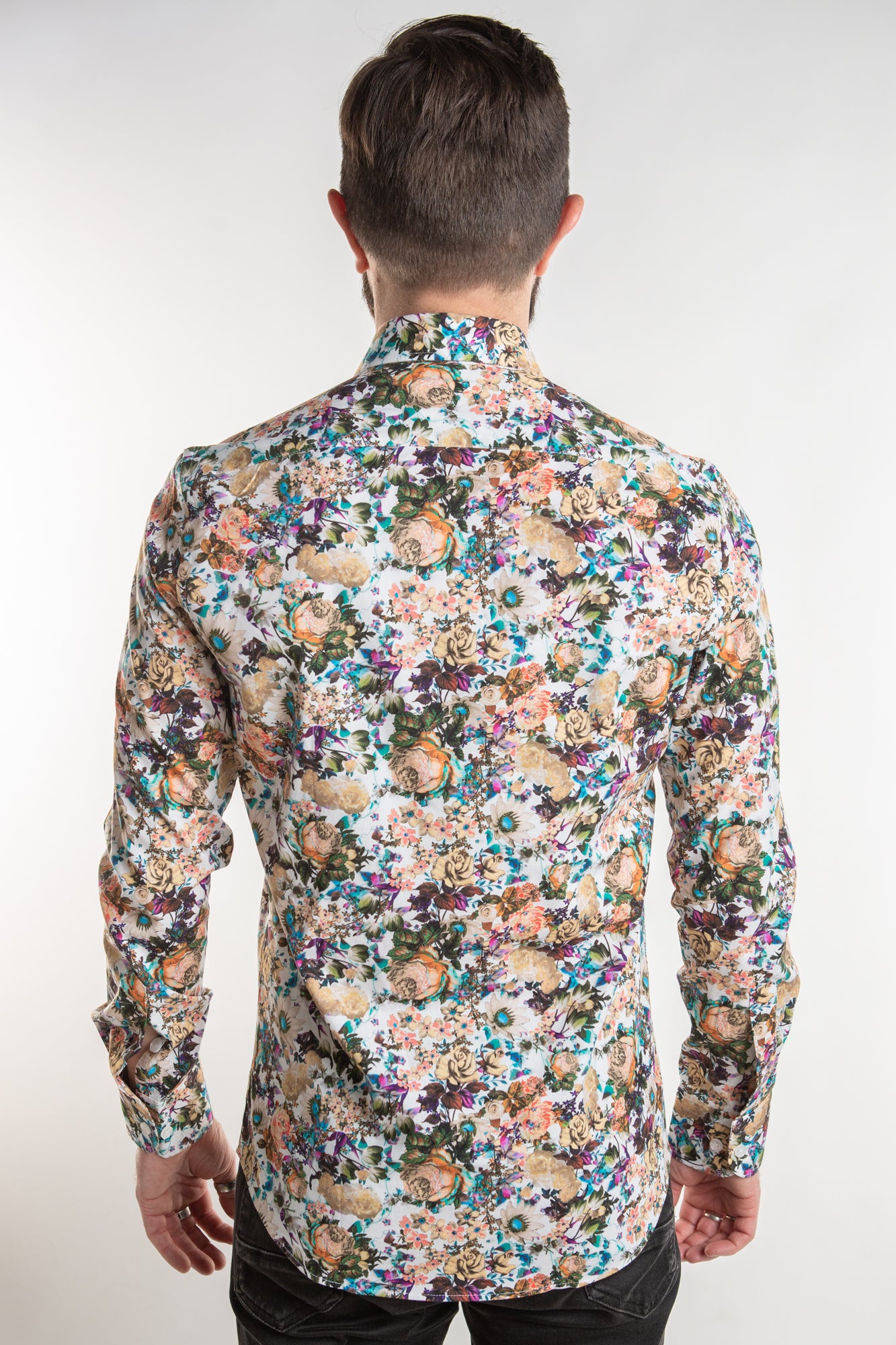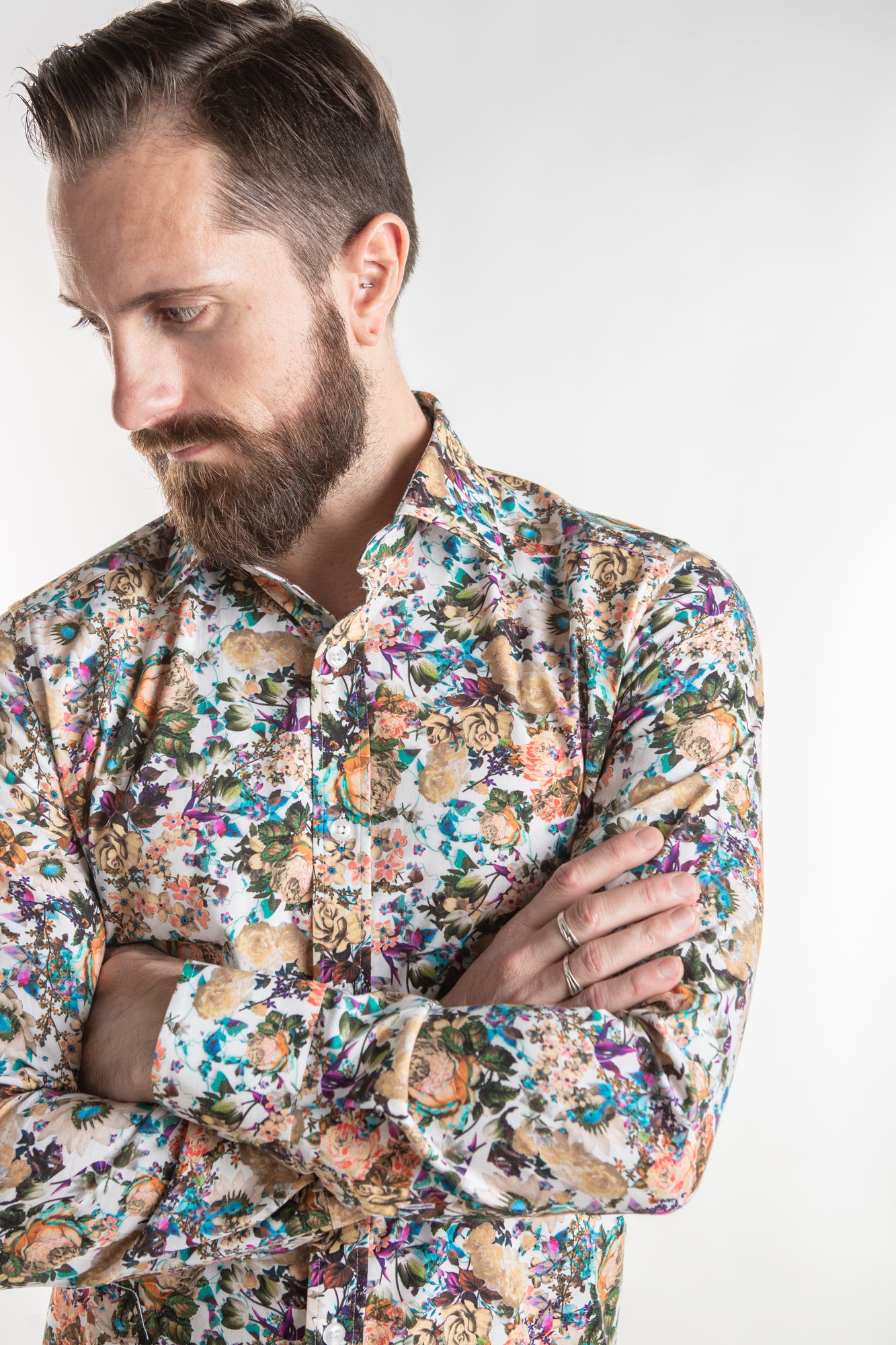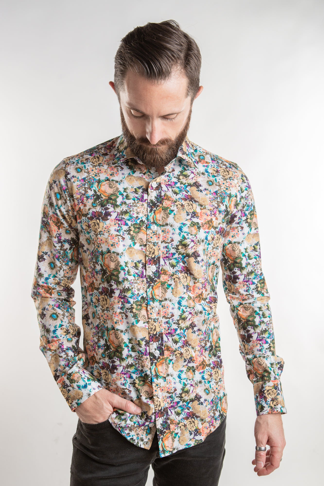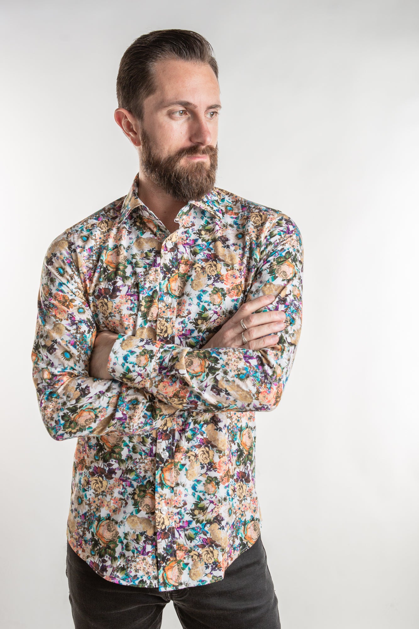 Slim Fit patterned black and orange long sleeve collared, dress shirt for men. Enjoy the elegant look of a slim fit dress shirt. This fashionable garment features stylish printed blue florals on a long sleeve, perfect for any formal occasion.