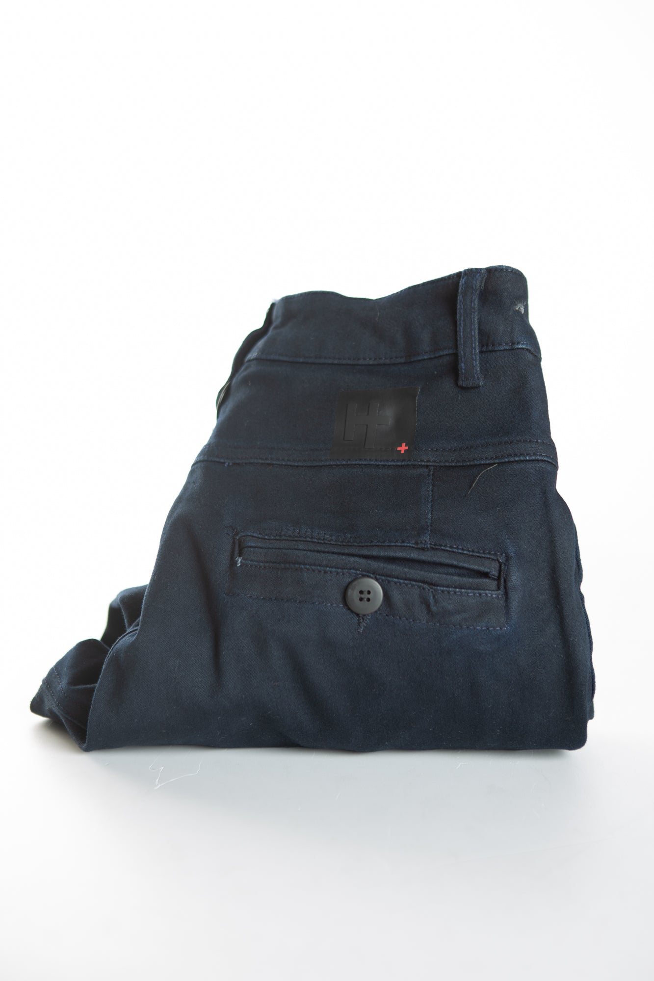 Funky navy dress pants with a asymmetrical closure. Six Accent buttons along both front pockets, giving it an avant garde look. Great stretch, fits true to size.