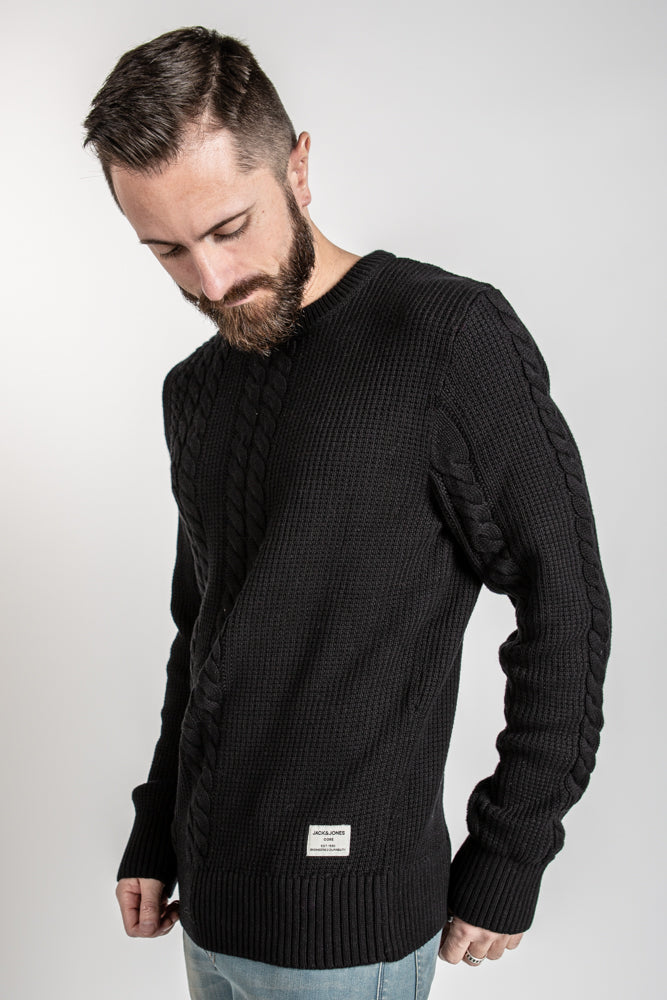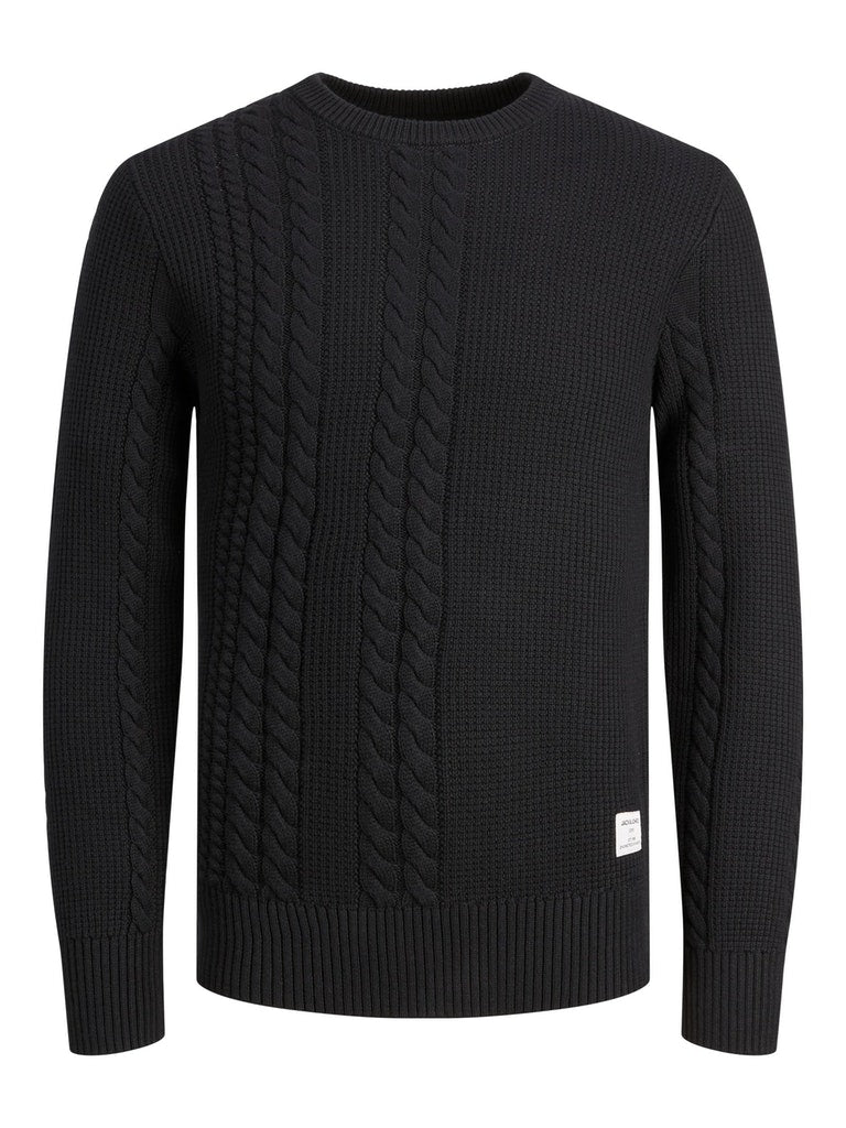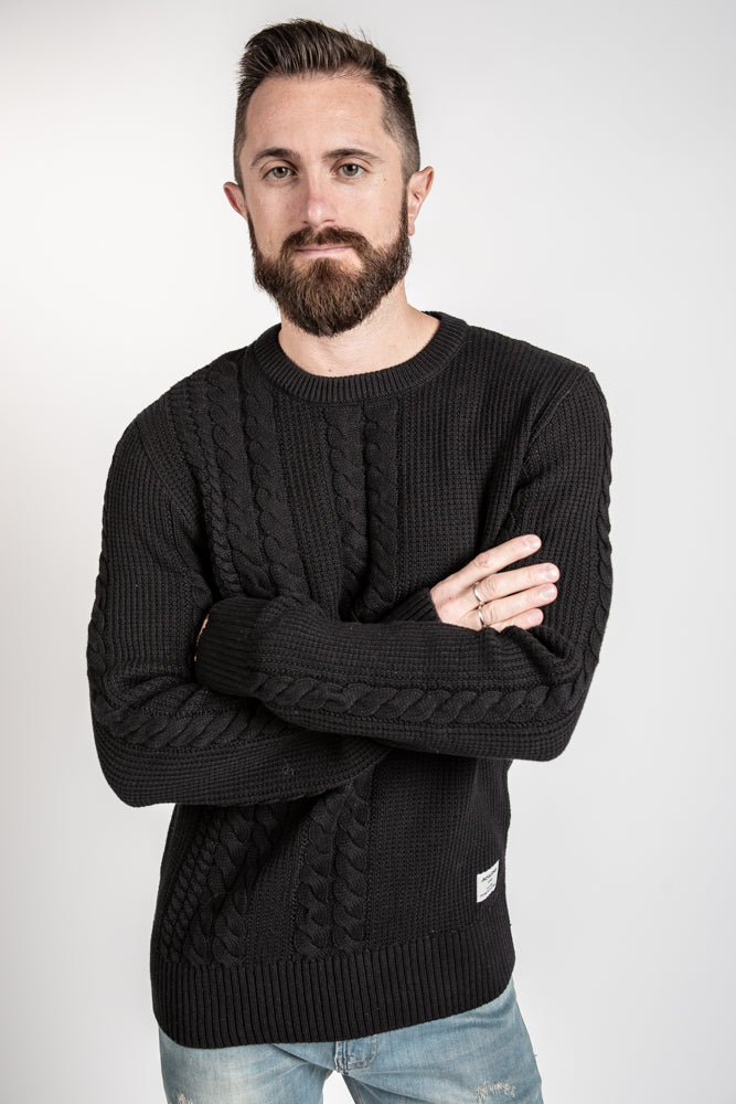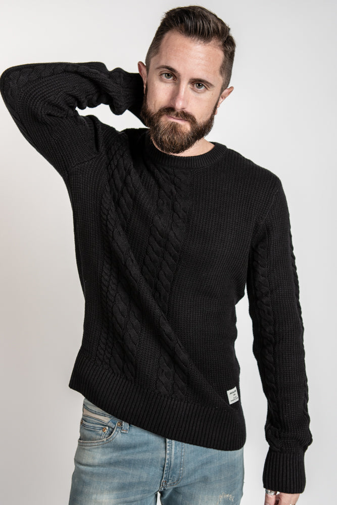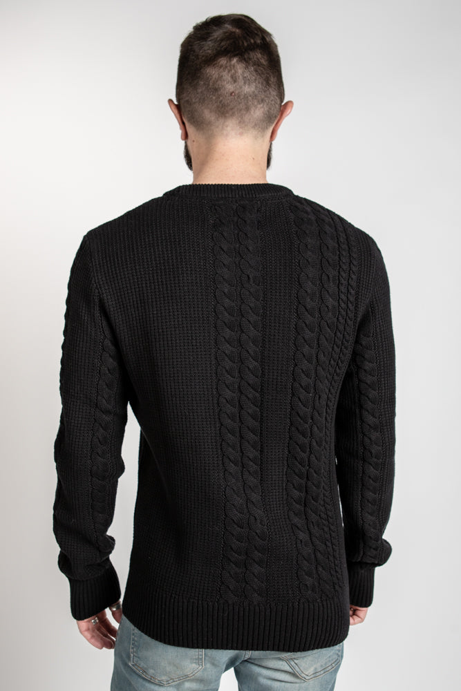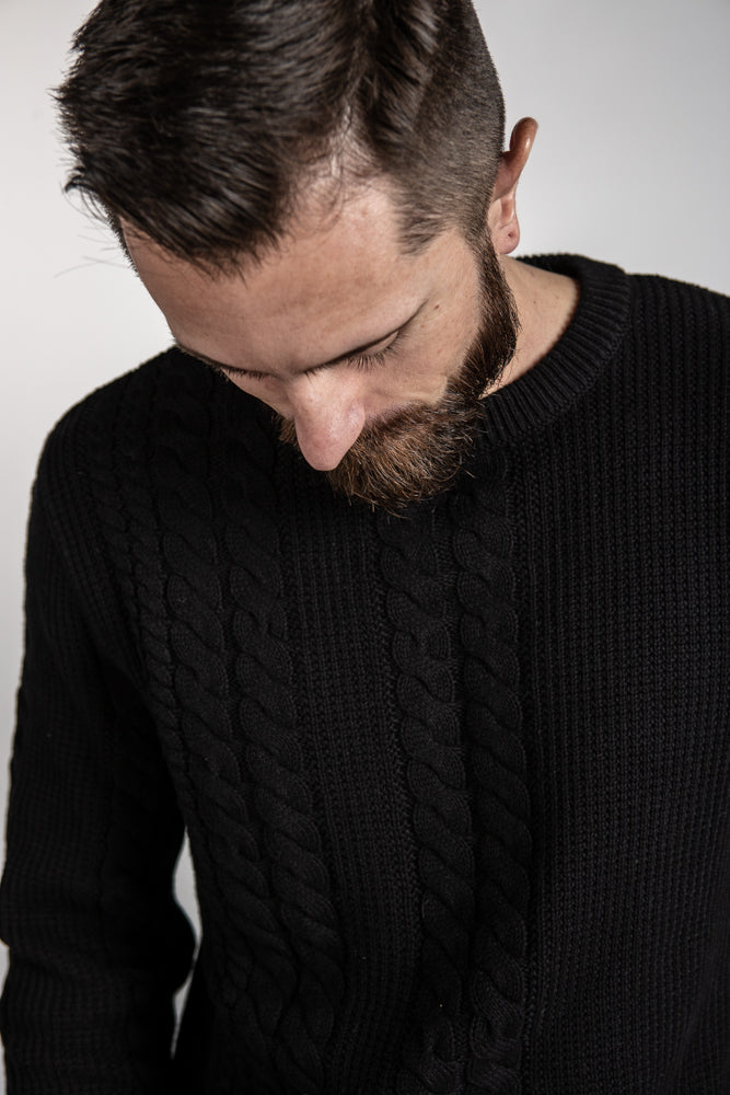 Men's knit cotton long sleeve pullover in black. Accent cable knit.