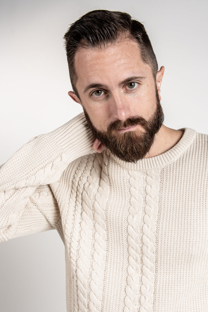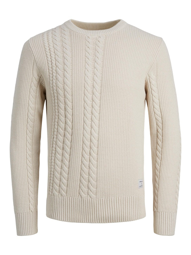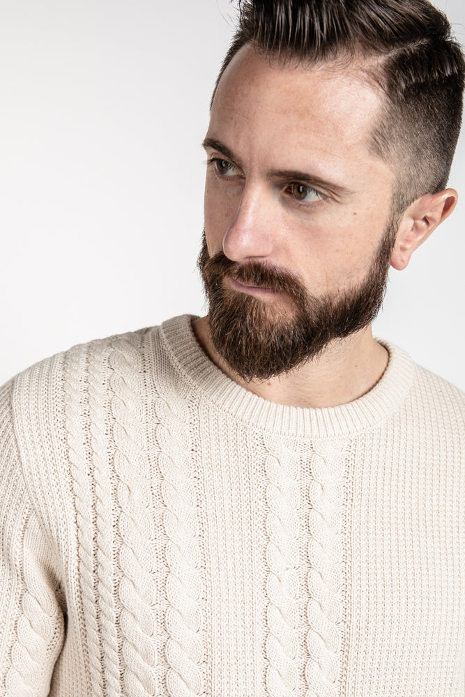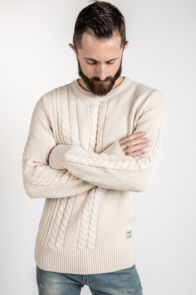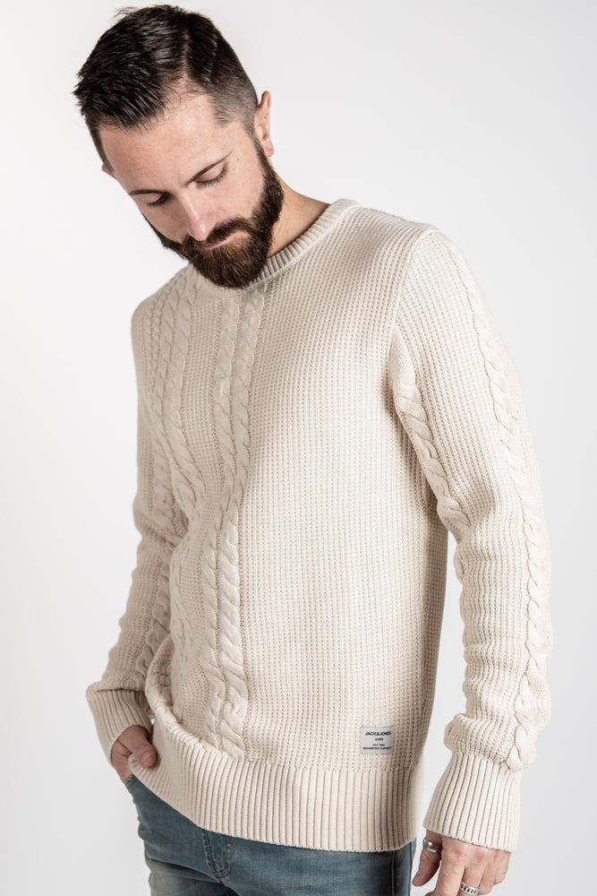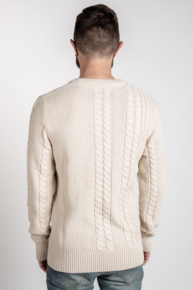 Men's knit cotton long sleeve pullover in black. Accent cable knit.