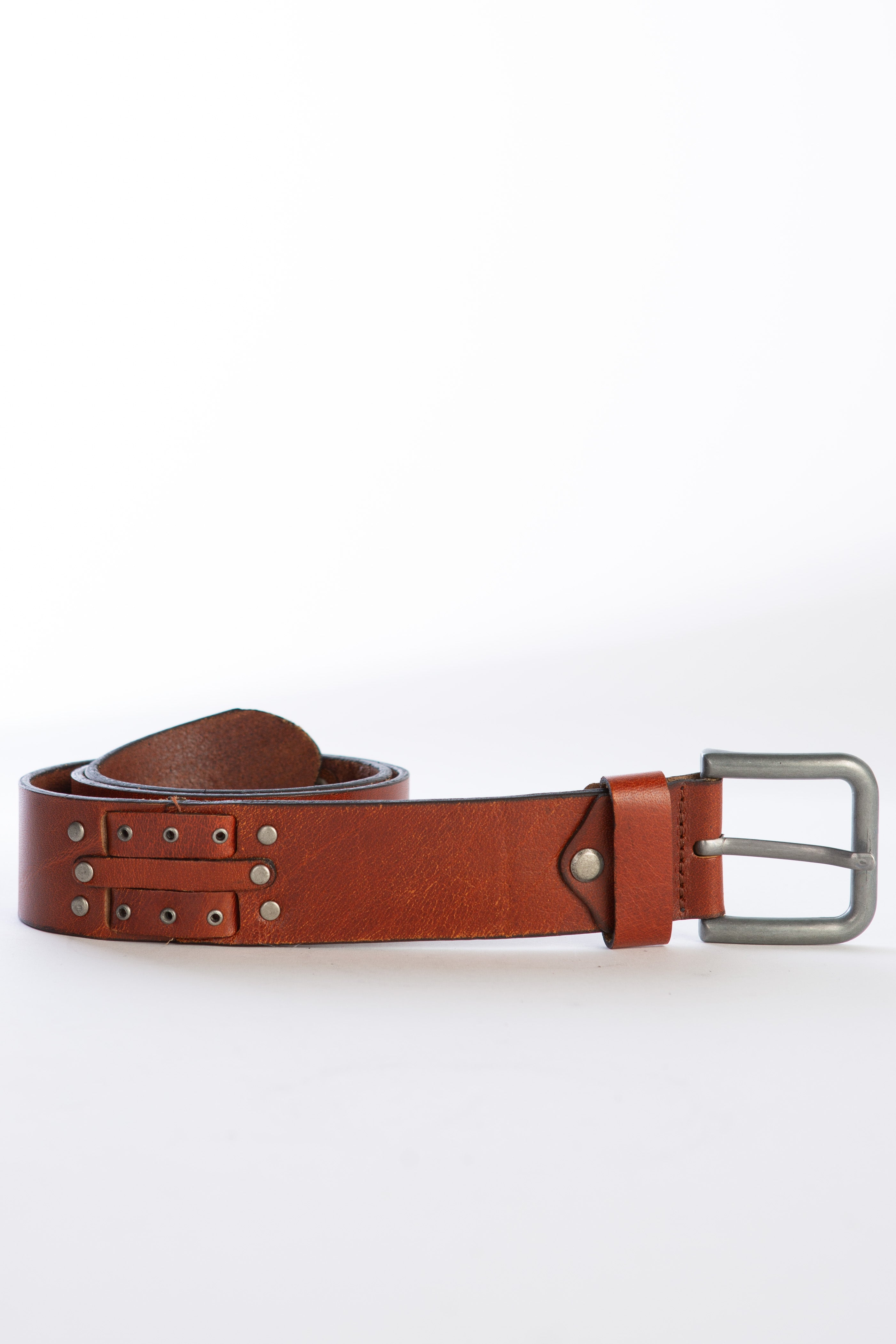 A cognac coloured leather belt enriched with a square buckle in brass and stud hardware.
