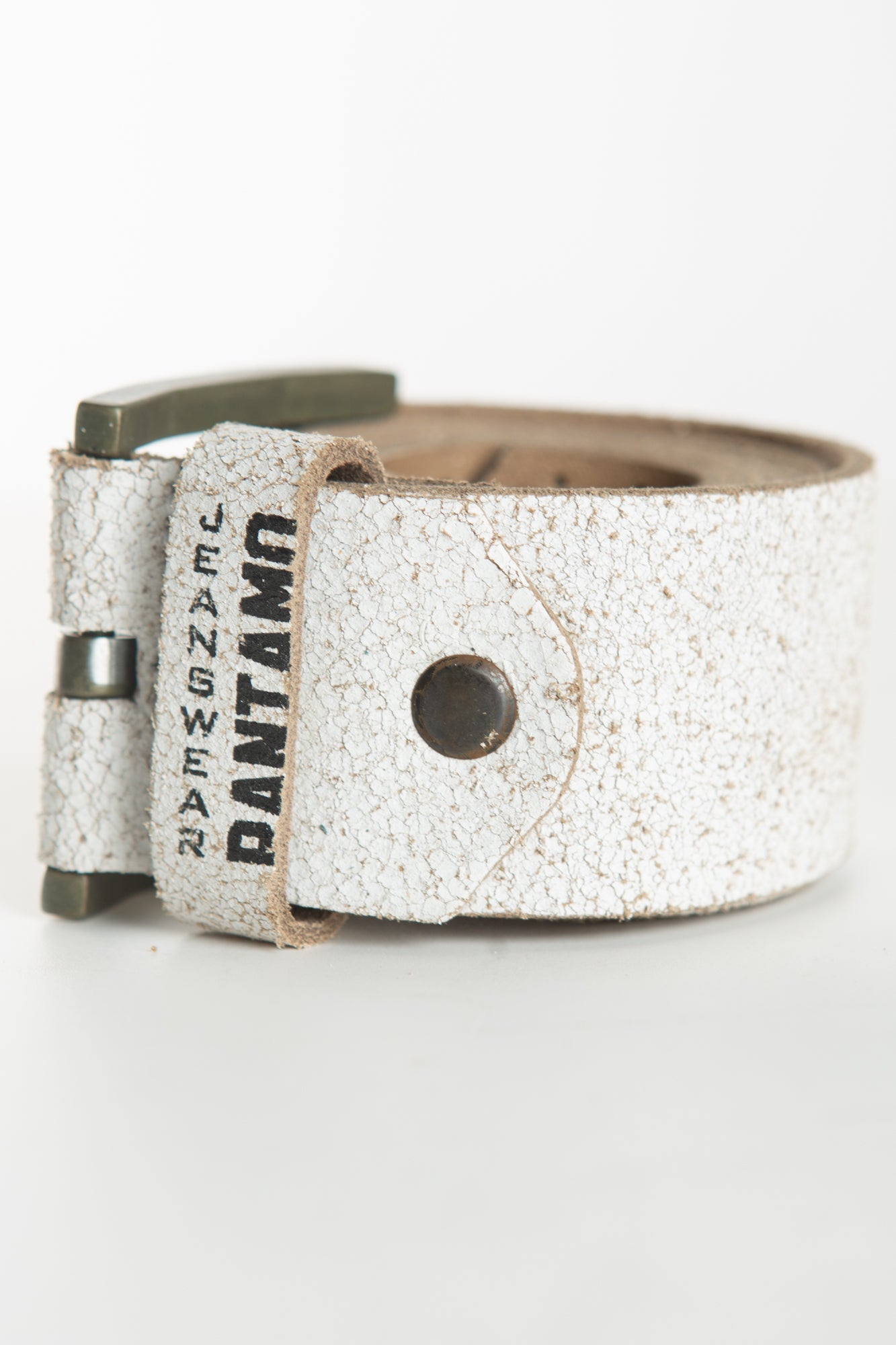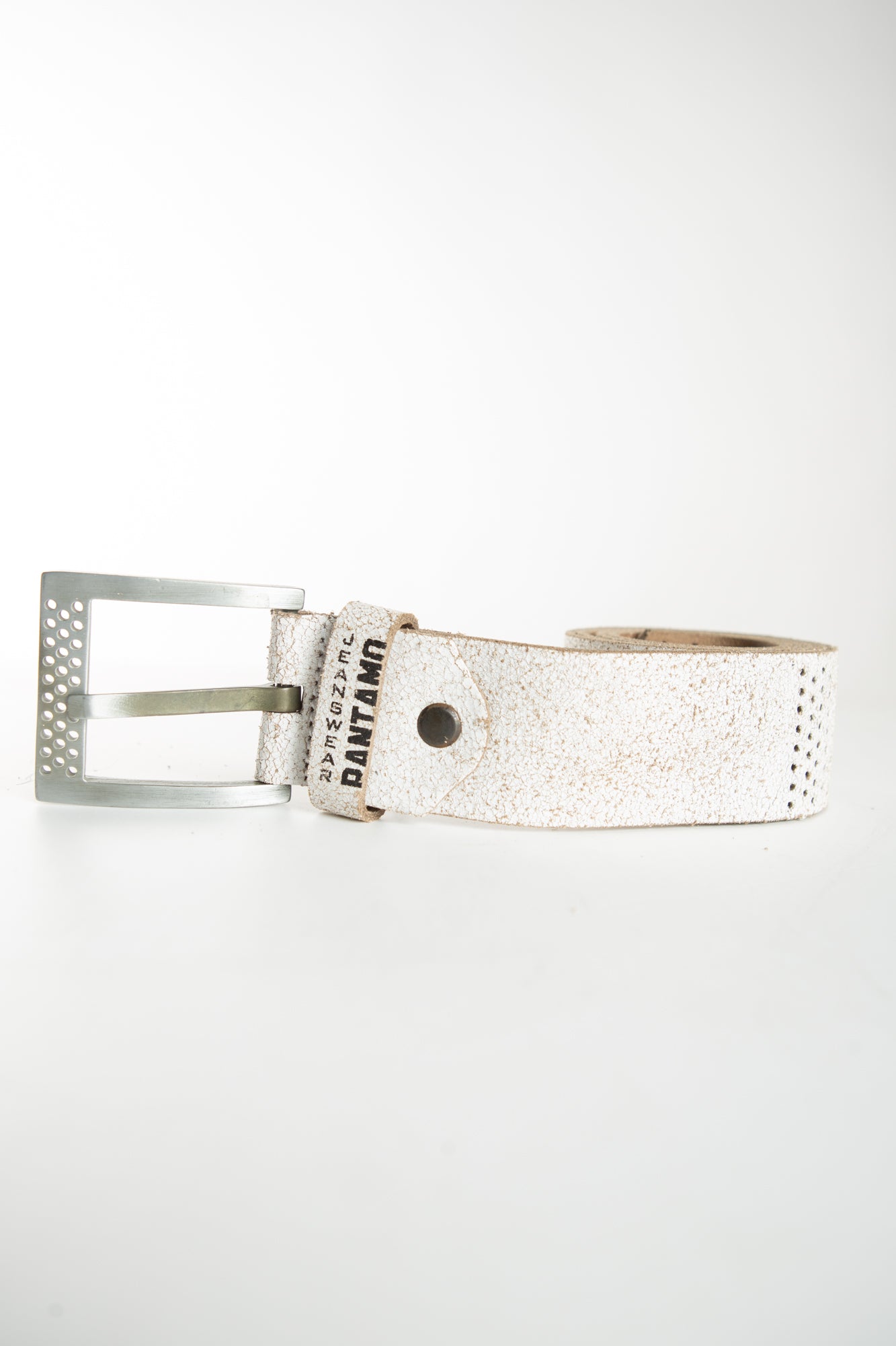 A White leather belt enriched with a square buckle in brass and stud hardware.