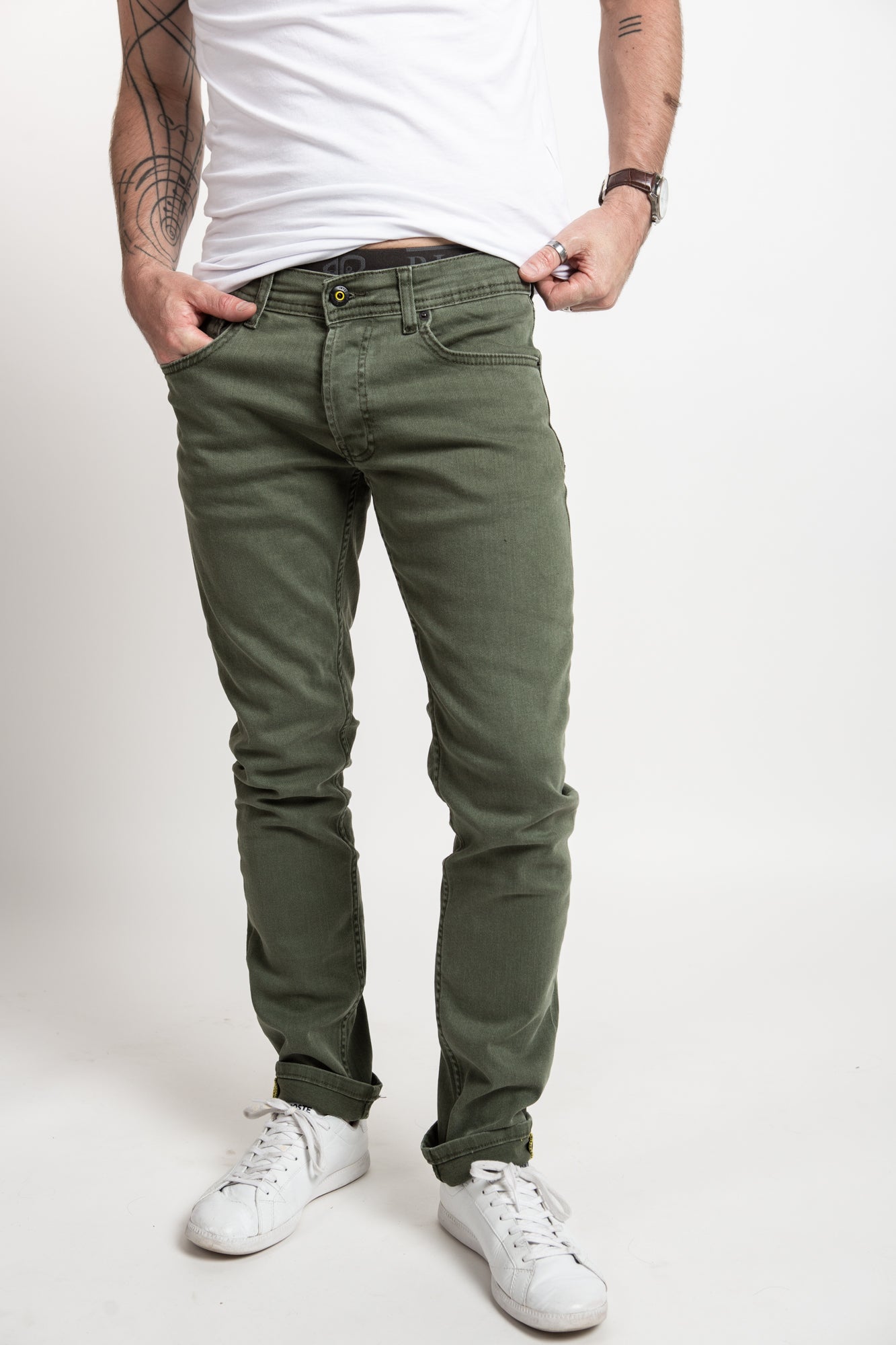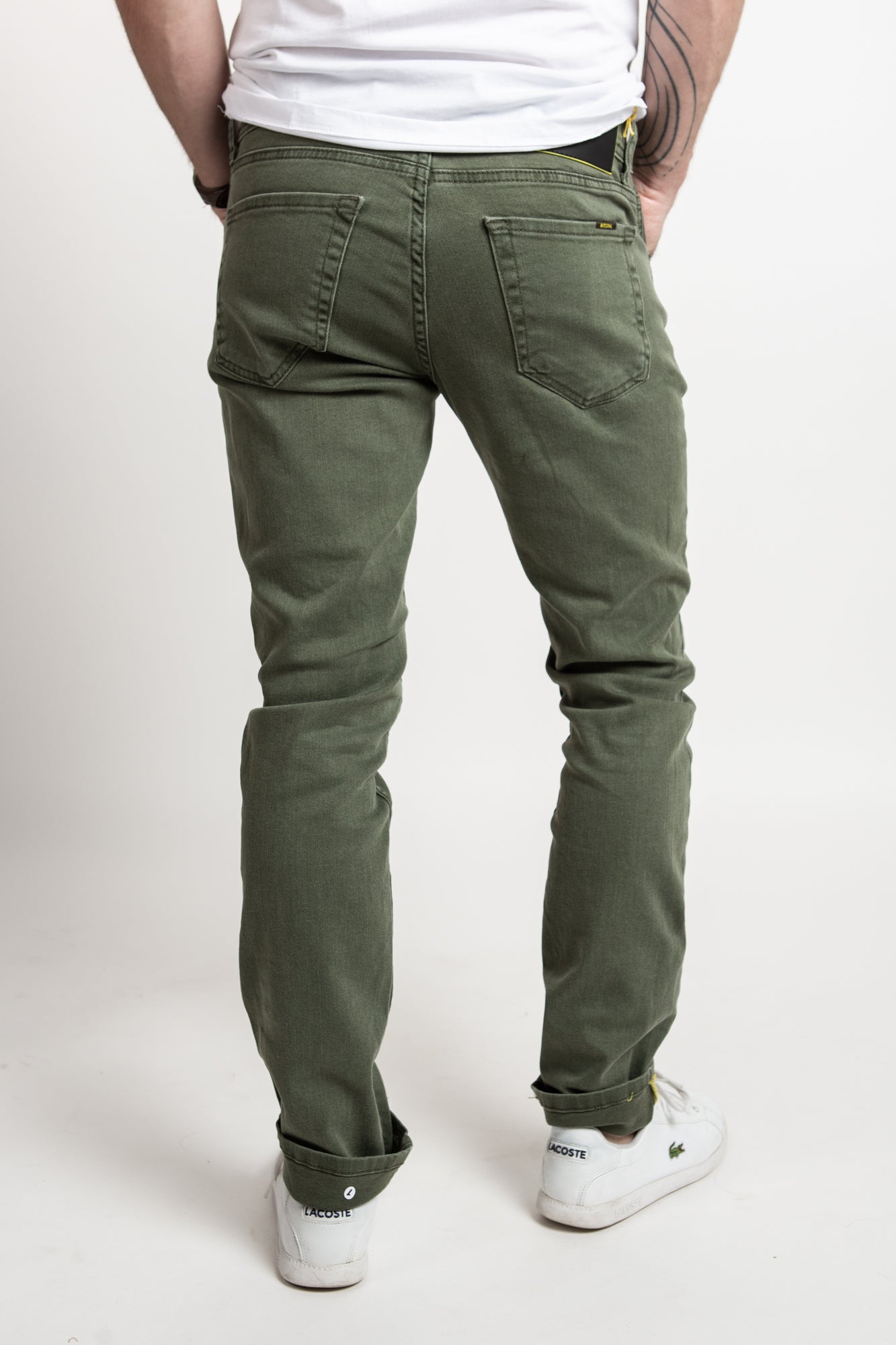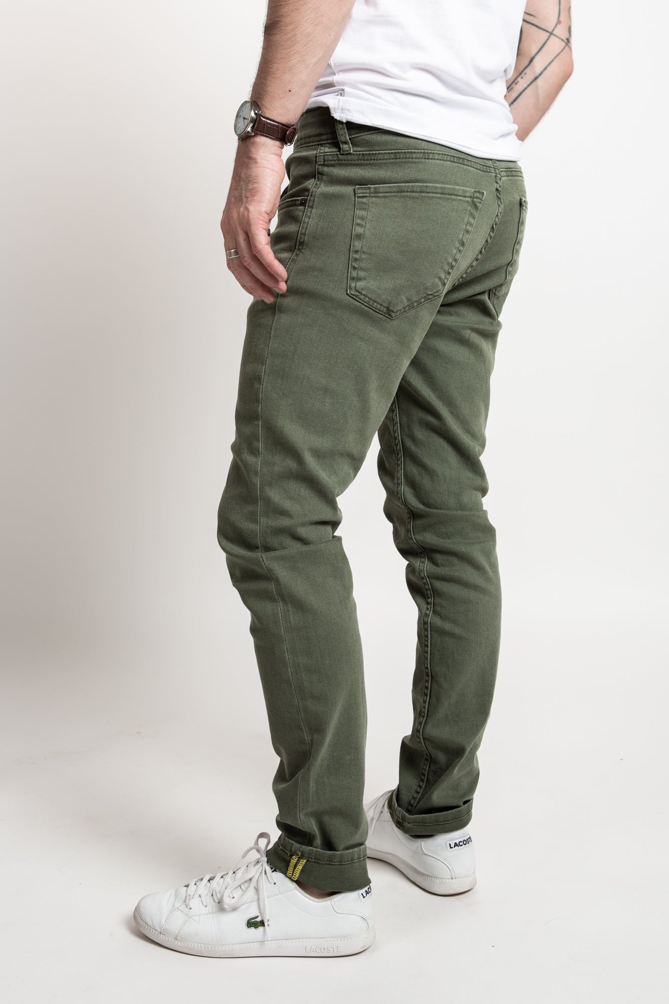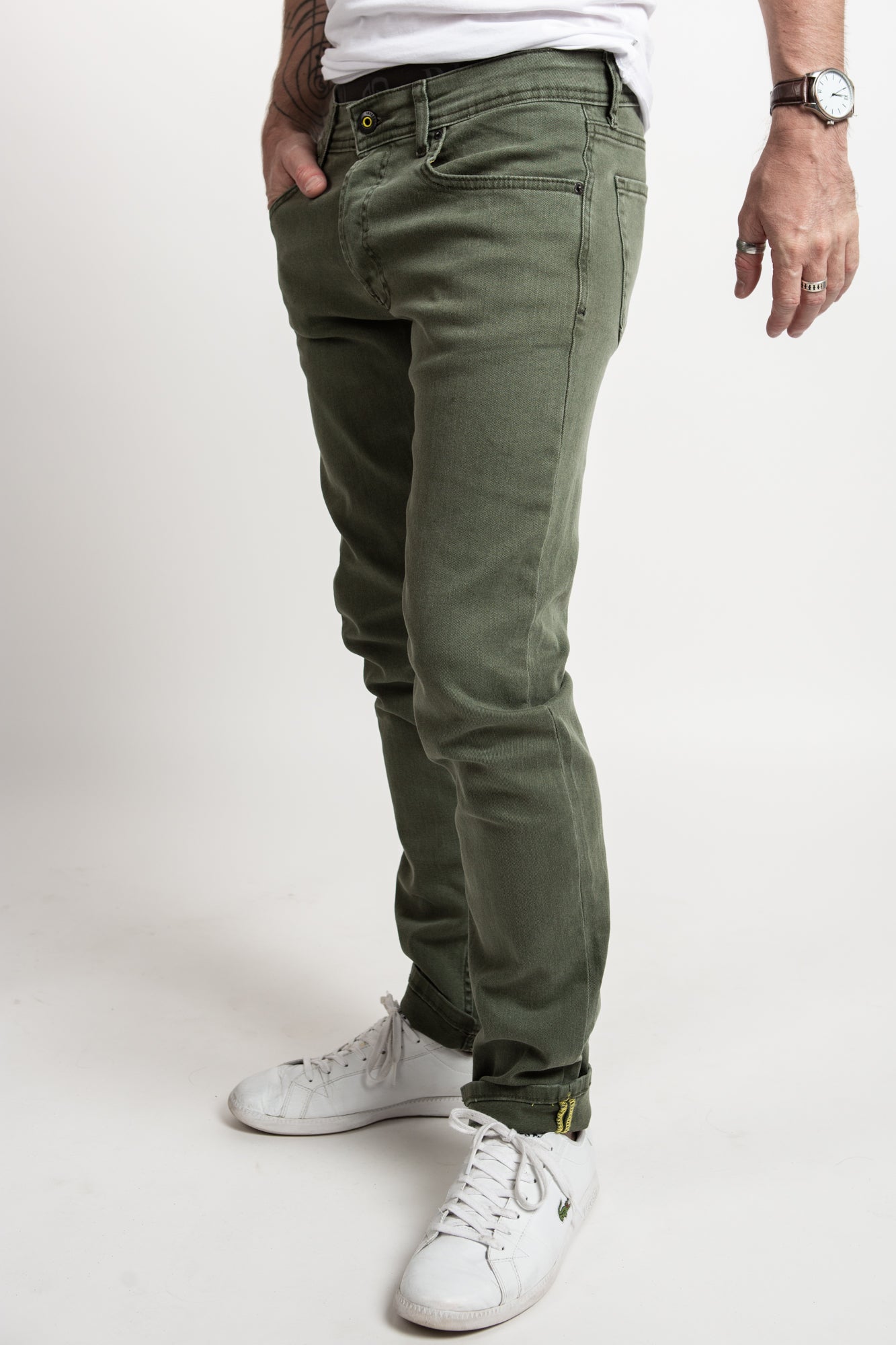 Men's slim fit light denim in olive. Super stretchy and comfortable.