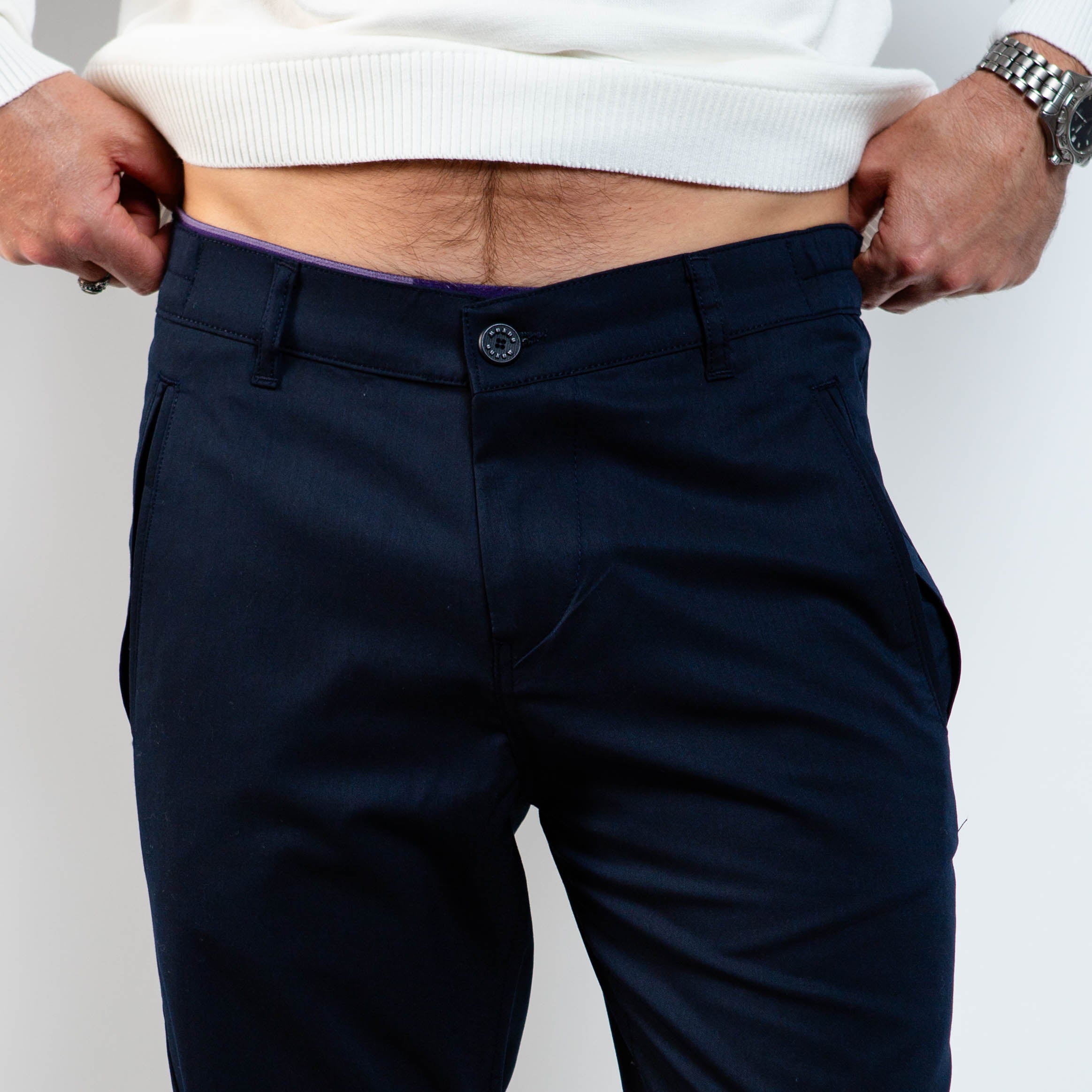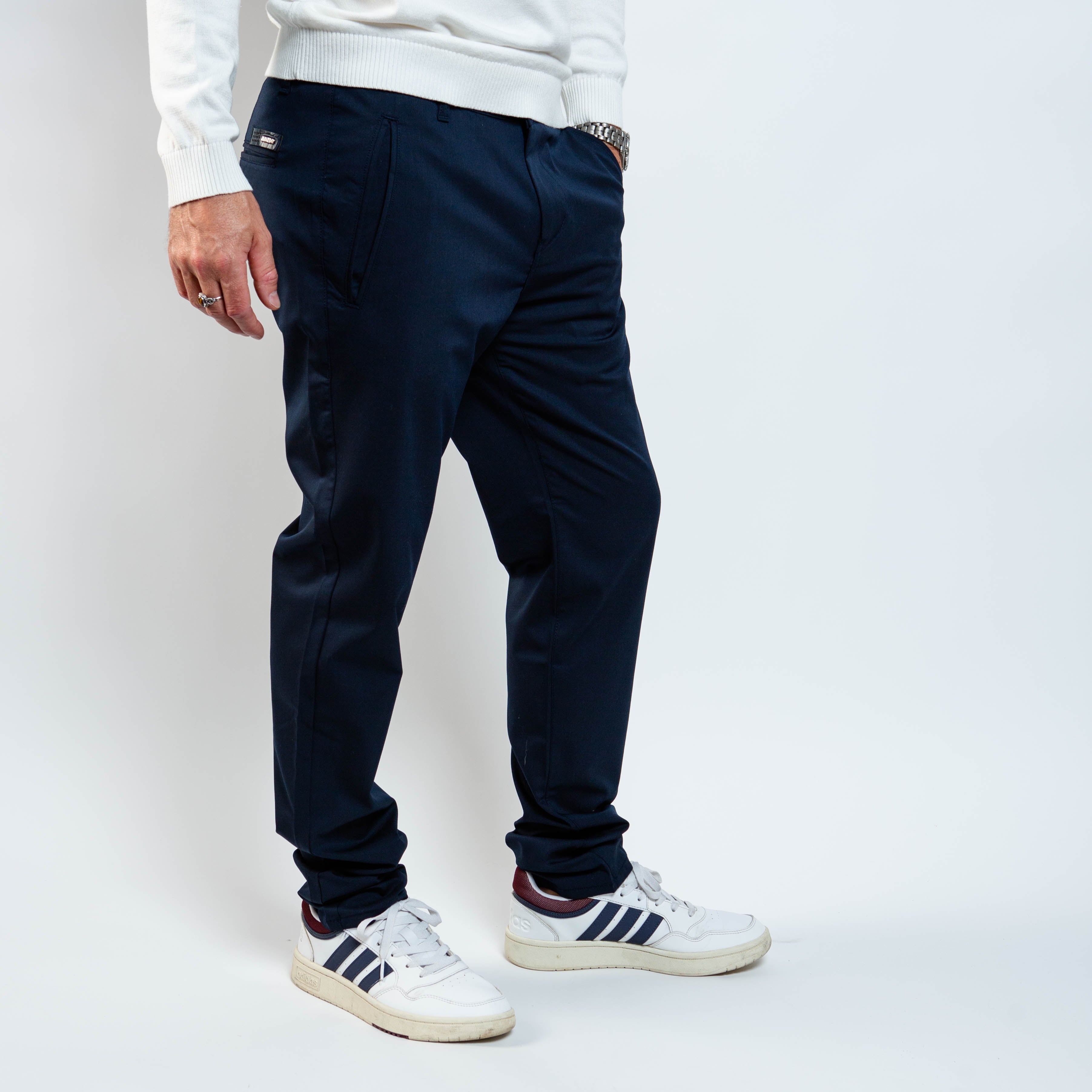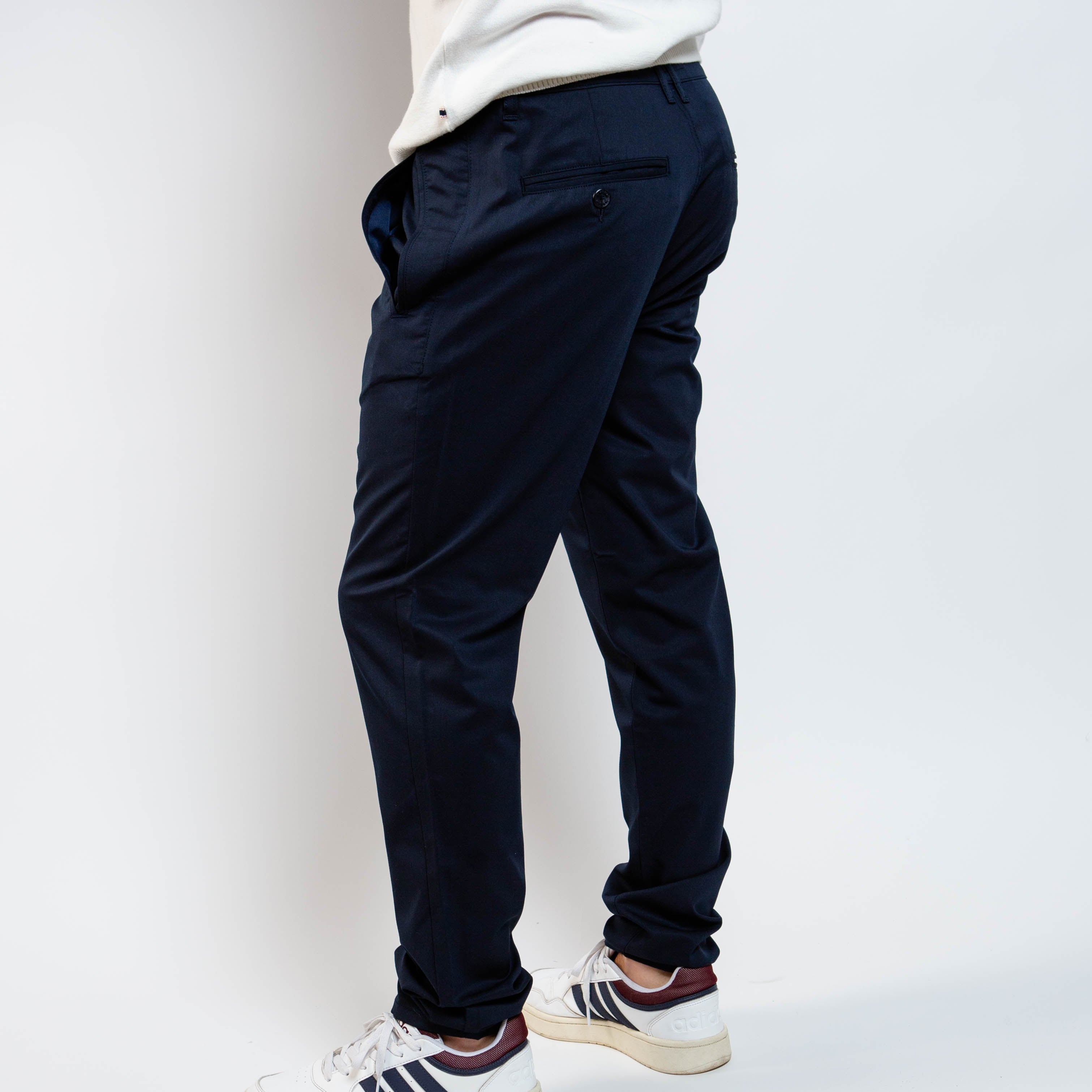 Designed with a tailored fit that’s clean yet relaxed (not super slim), they feature an elasticized waistband detail at the back for subtle comfort. The rich navy tone and minimal styling make them versatile for dressing up or down.