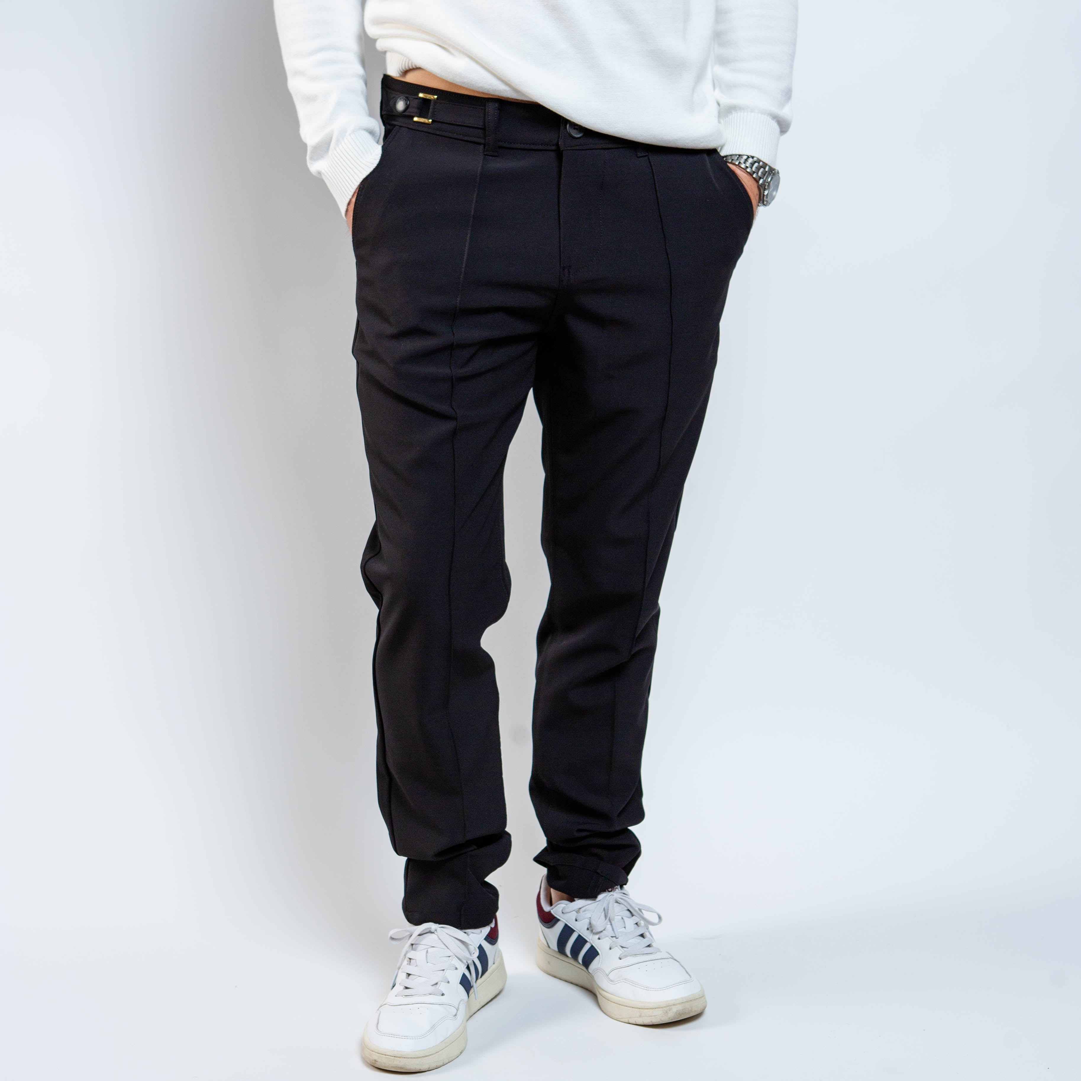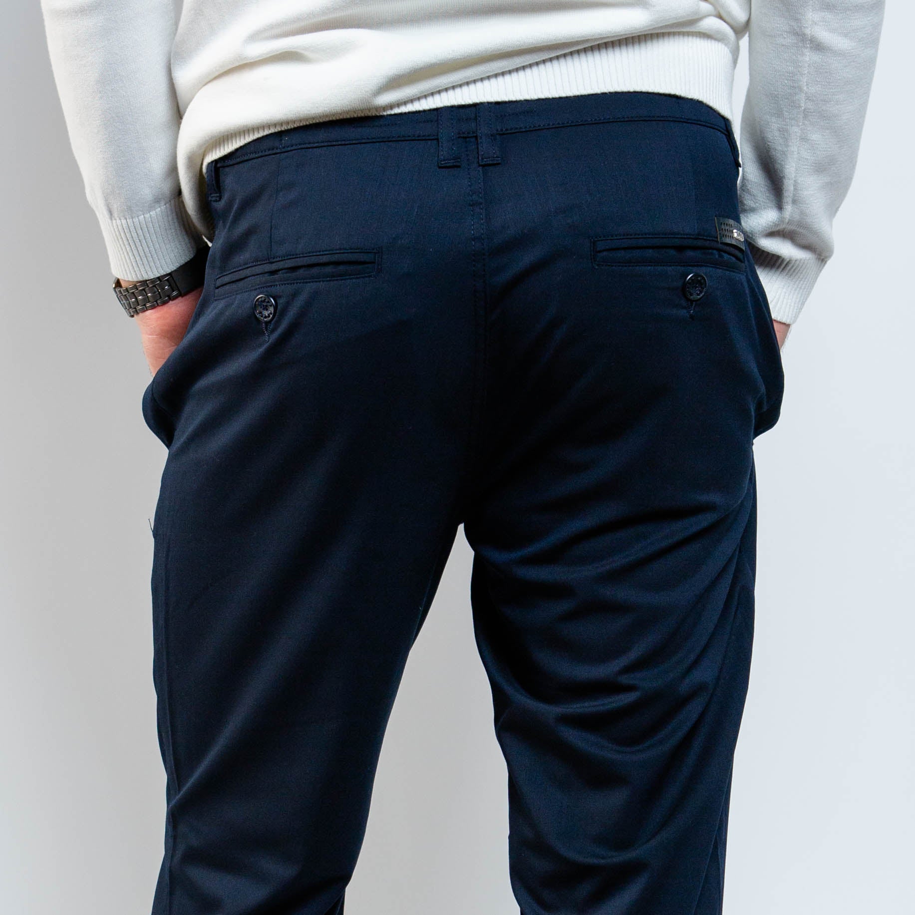 Side slit pockets and rear welt pockets with buttons