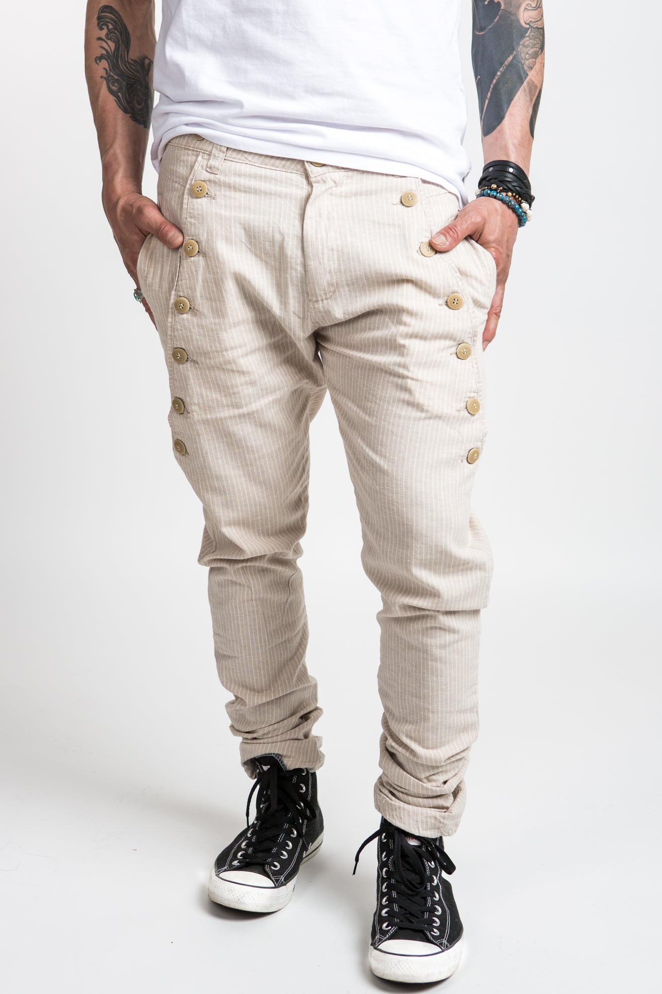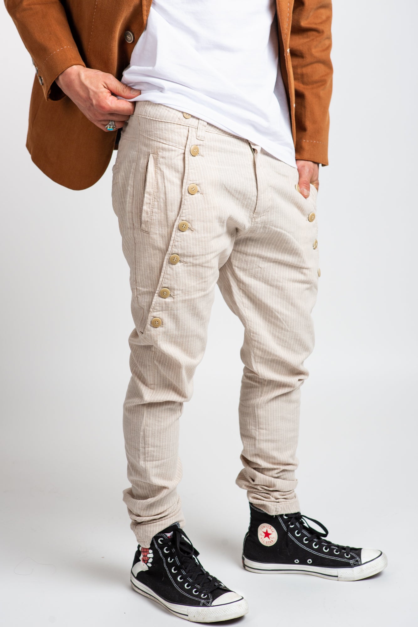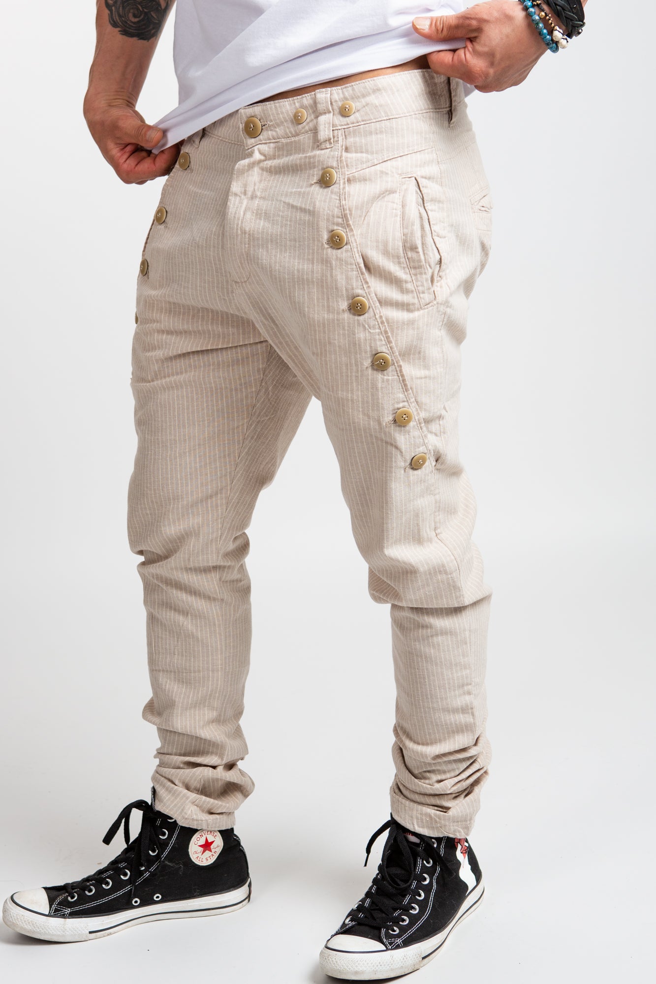 Men's refined pinstripe trousers, tailored from a lightweight linen blend, feature accent side buttons for a sharp look. Whether you dress them up for a wedding or keep it casual, these trousers are an essential part of your summer wardrobe!