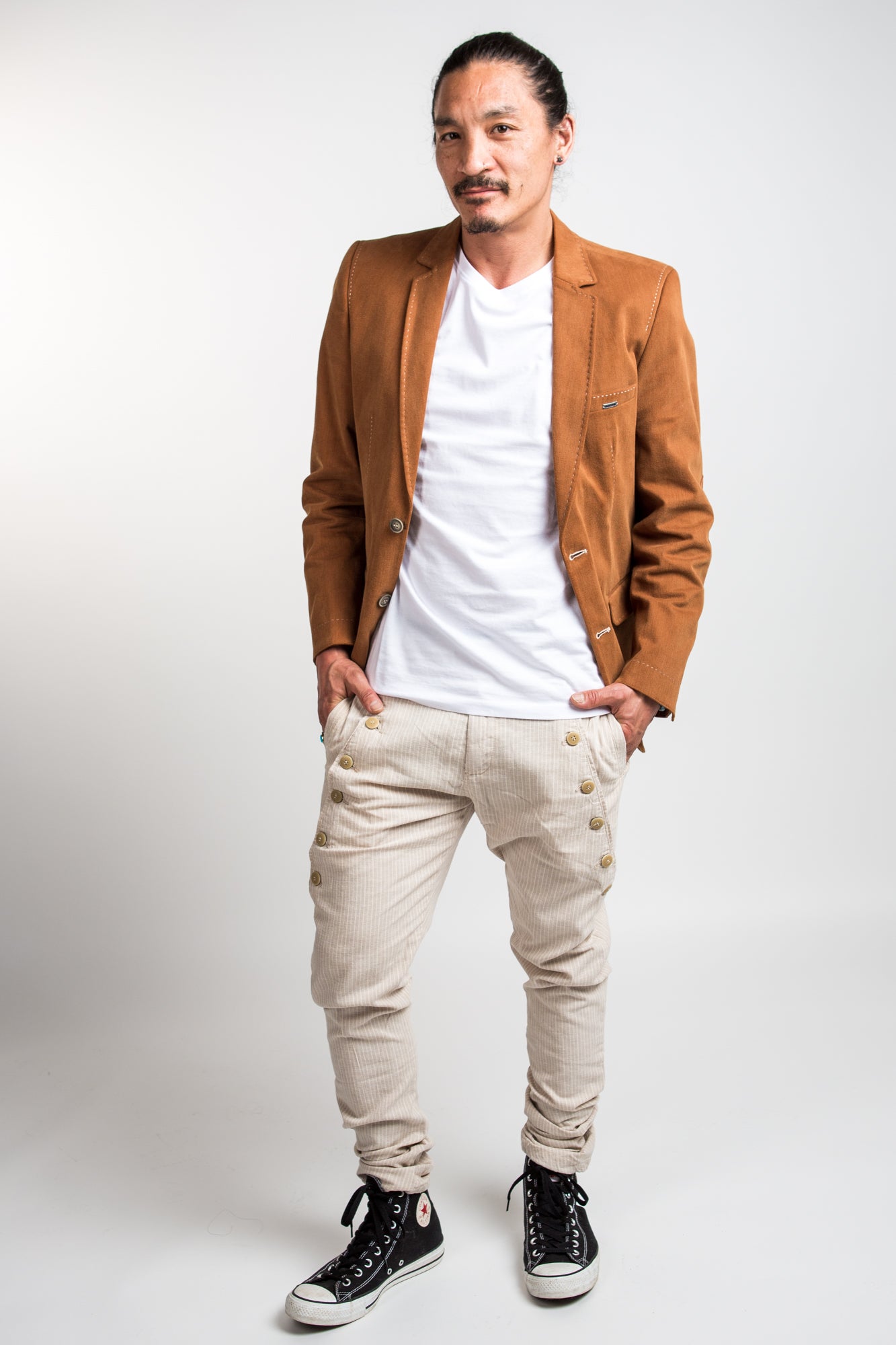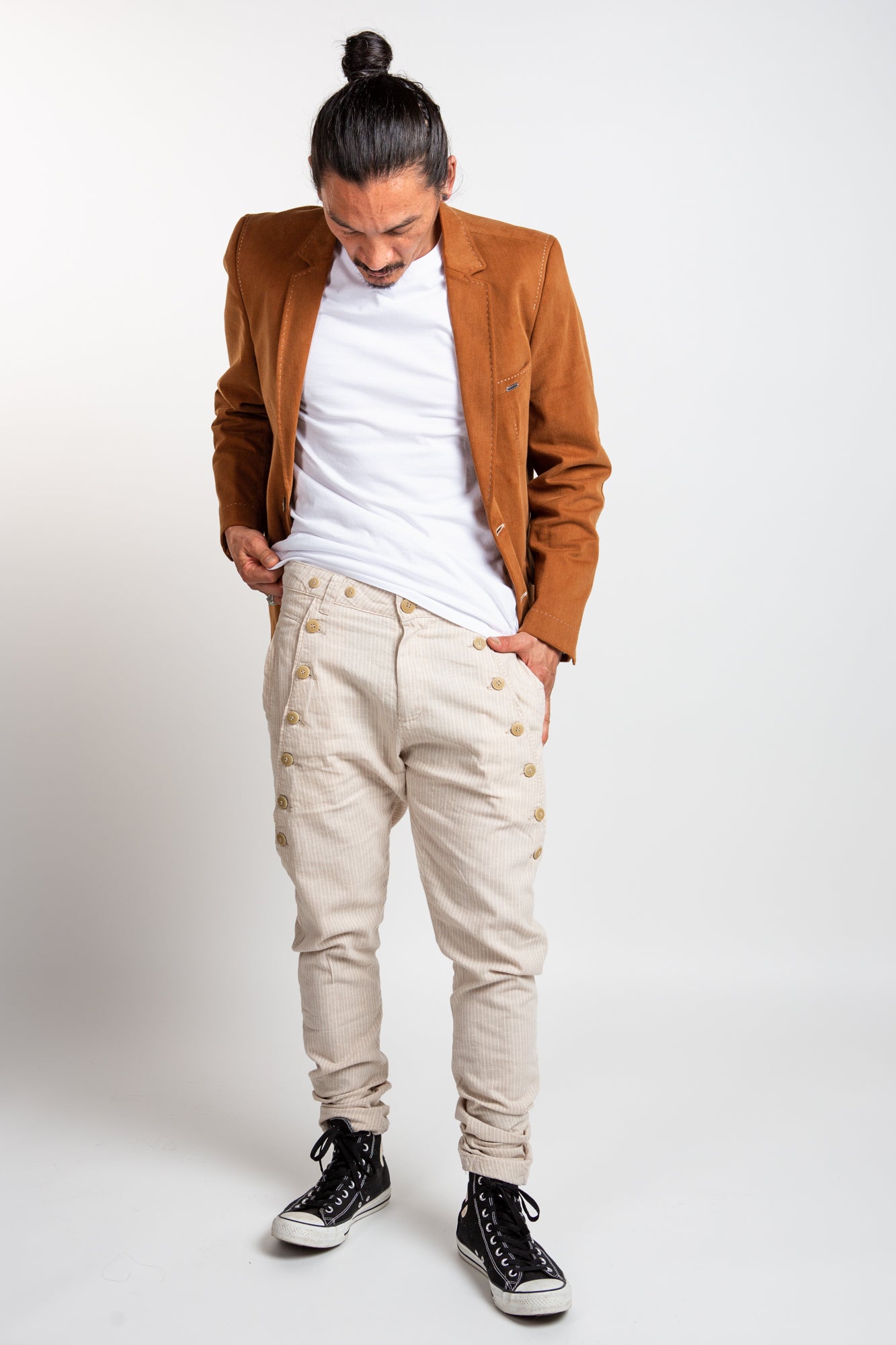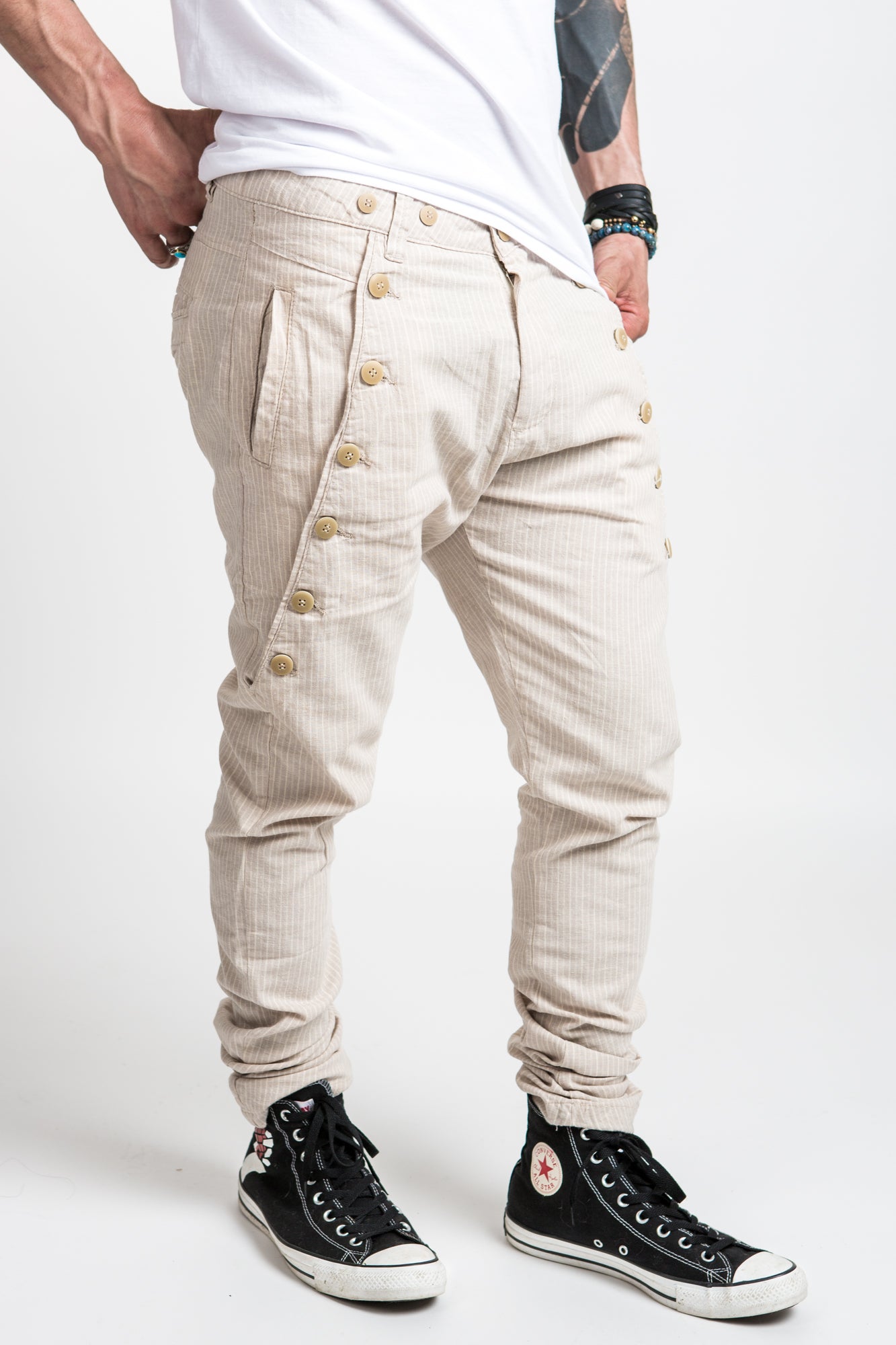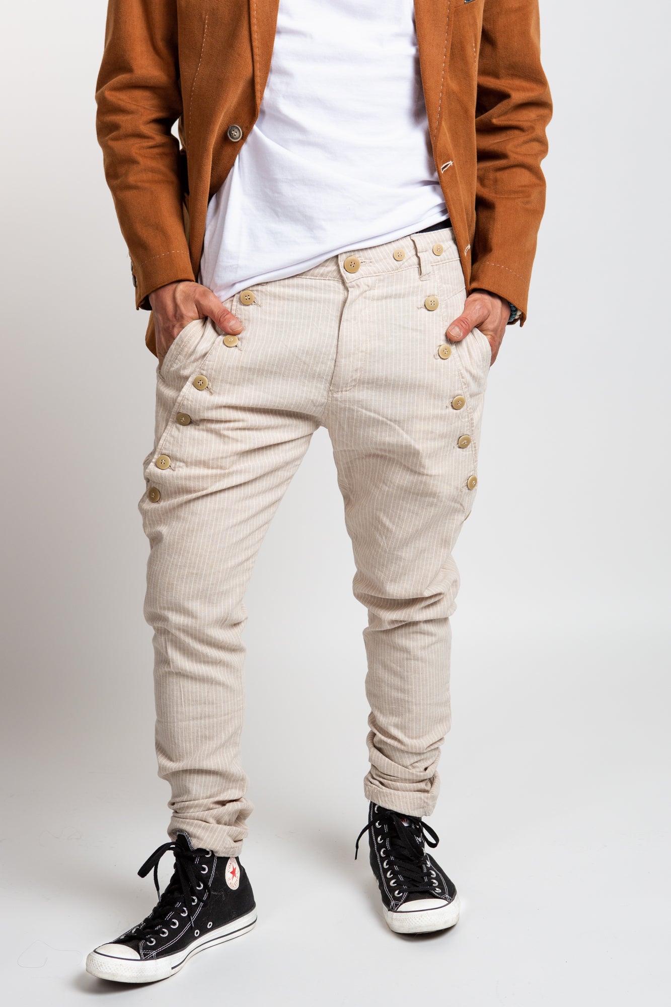 Men's refined pinstripe trousers, tailored from a lightweight linen blend, feature accent side buttons for a sharp look. Whether you dress them up for a wedding or keep it casual, these trousers are an essential part of your summer wardrobe!