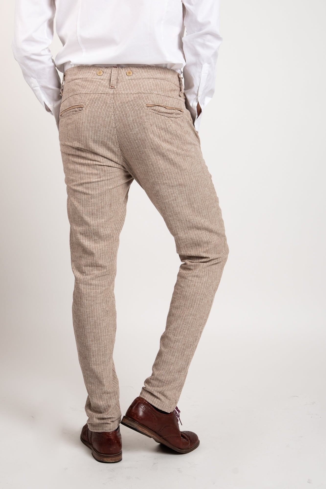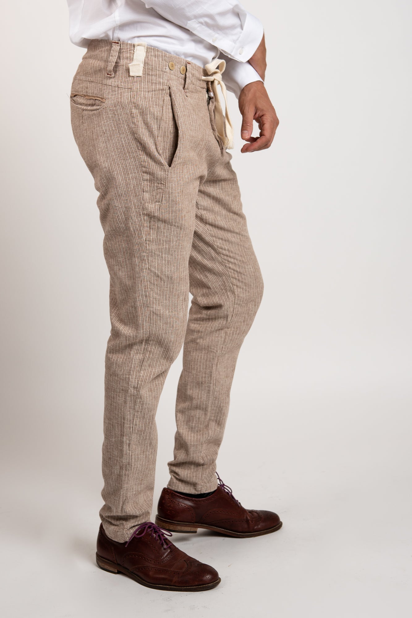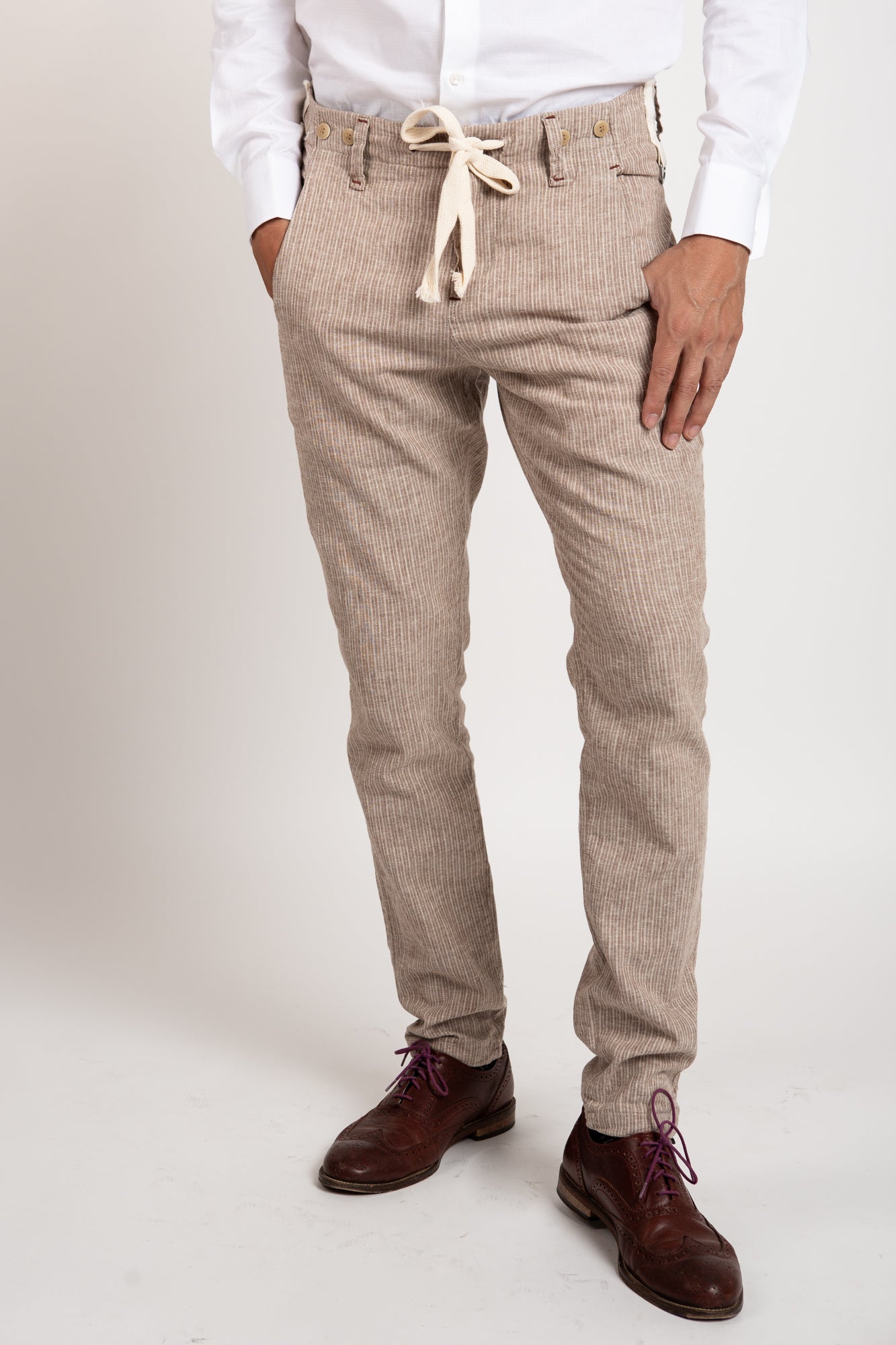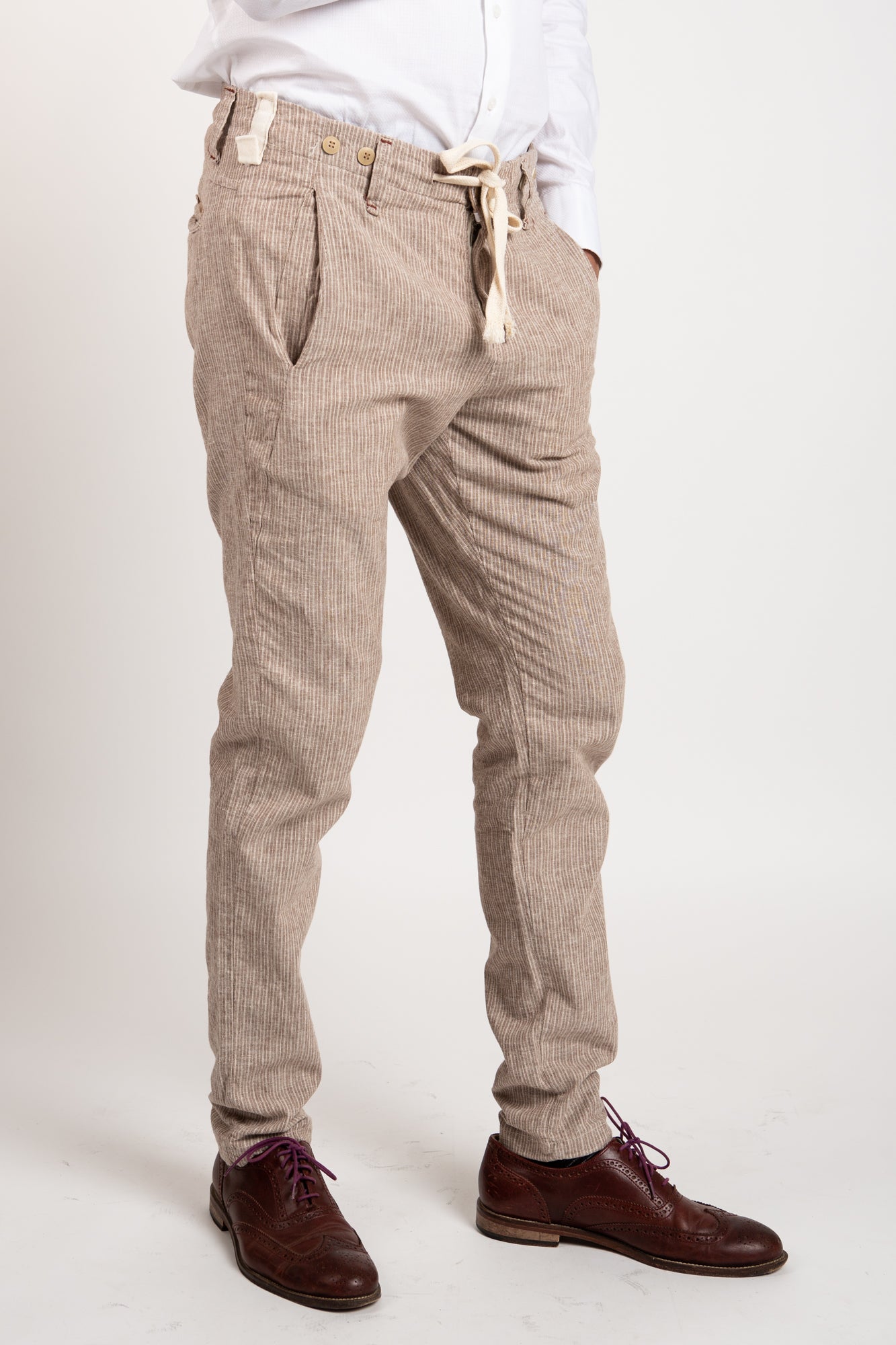 Men's tapered linen blend trousers with a pinstriped design, featuring an optional draw string. Perfect for dressing up or for a relaxed, casual look. The lightweight fabric makes these stylish trousers ideal for summer.