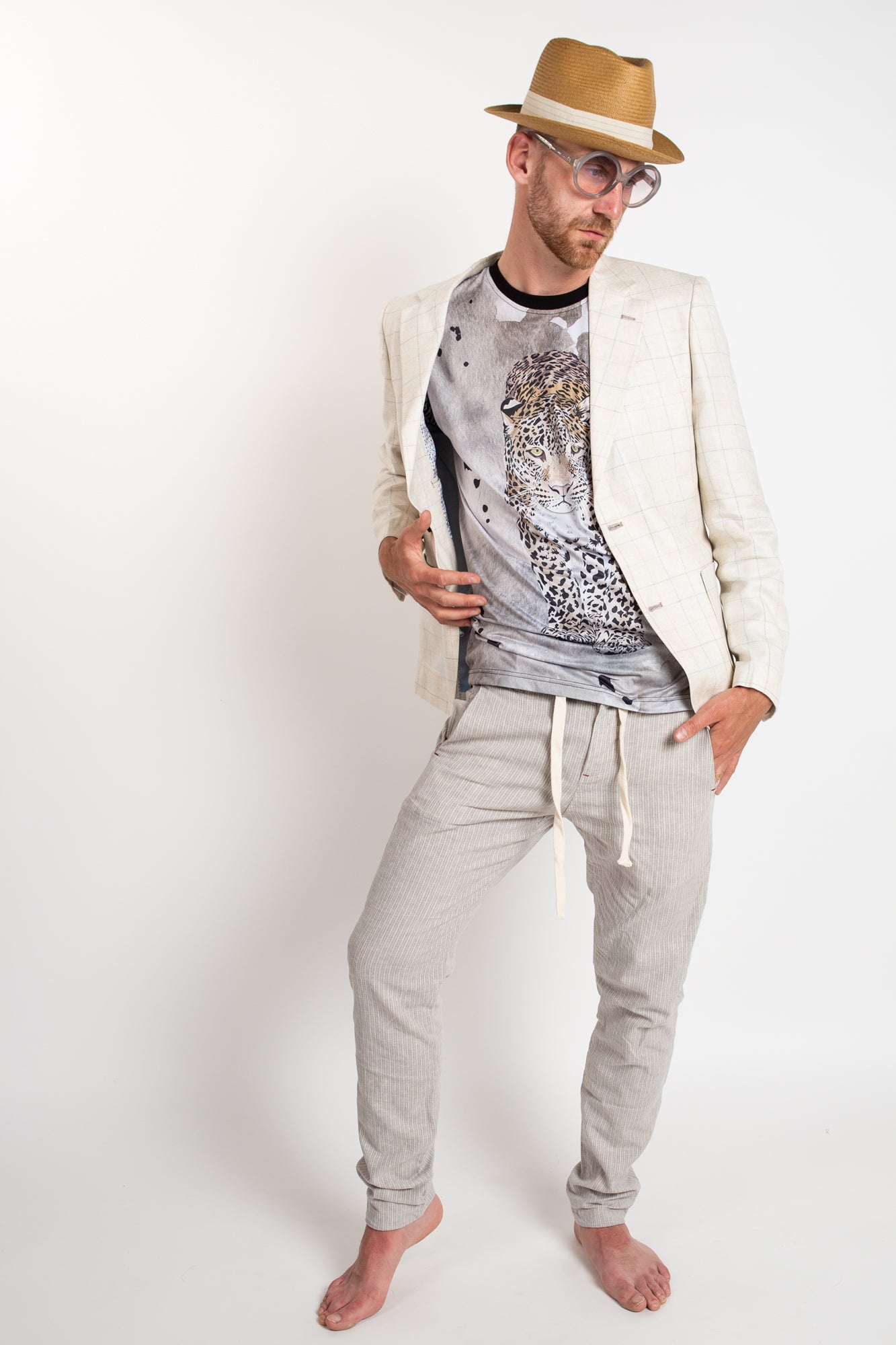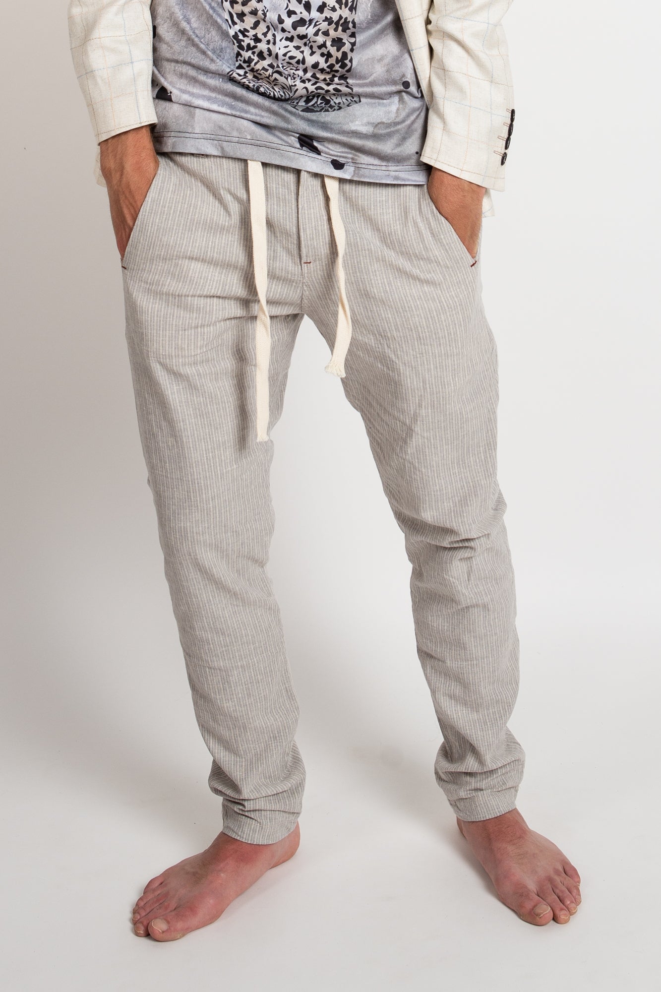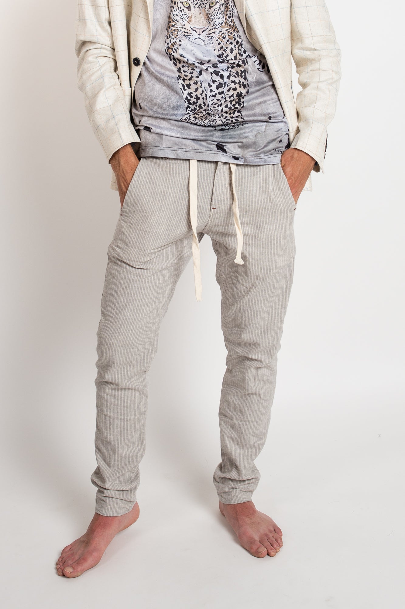 Crafted from a soft linen blend, the men's Pinstripe tapered trousers feature an optional drawstring waist for added comfort and versatility. Ideal for everyday wear or more formal occasions, these trousers are an essential summer piece.