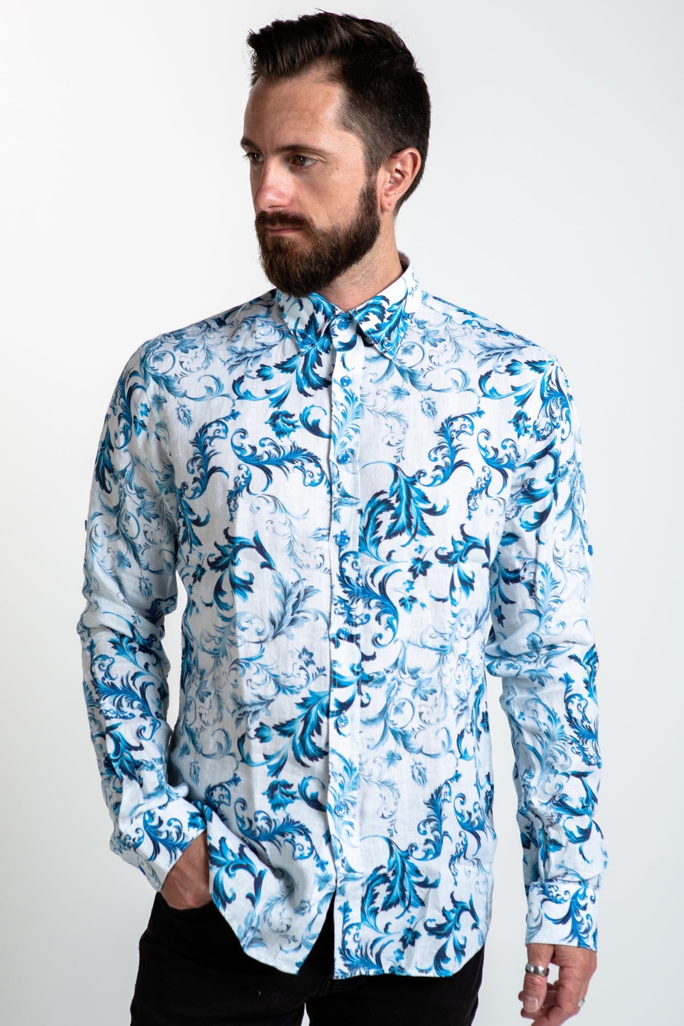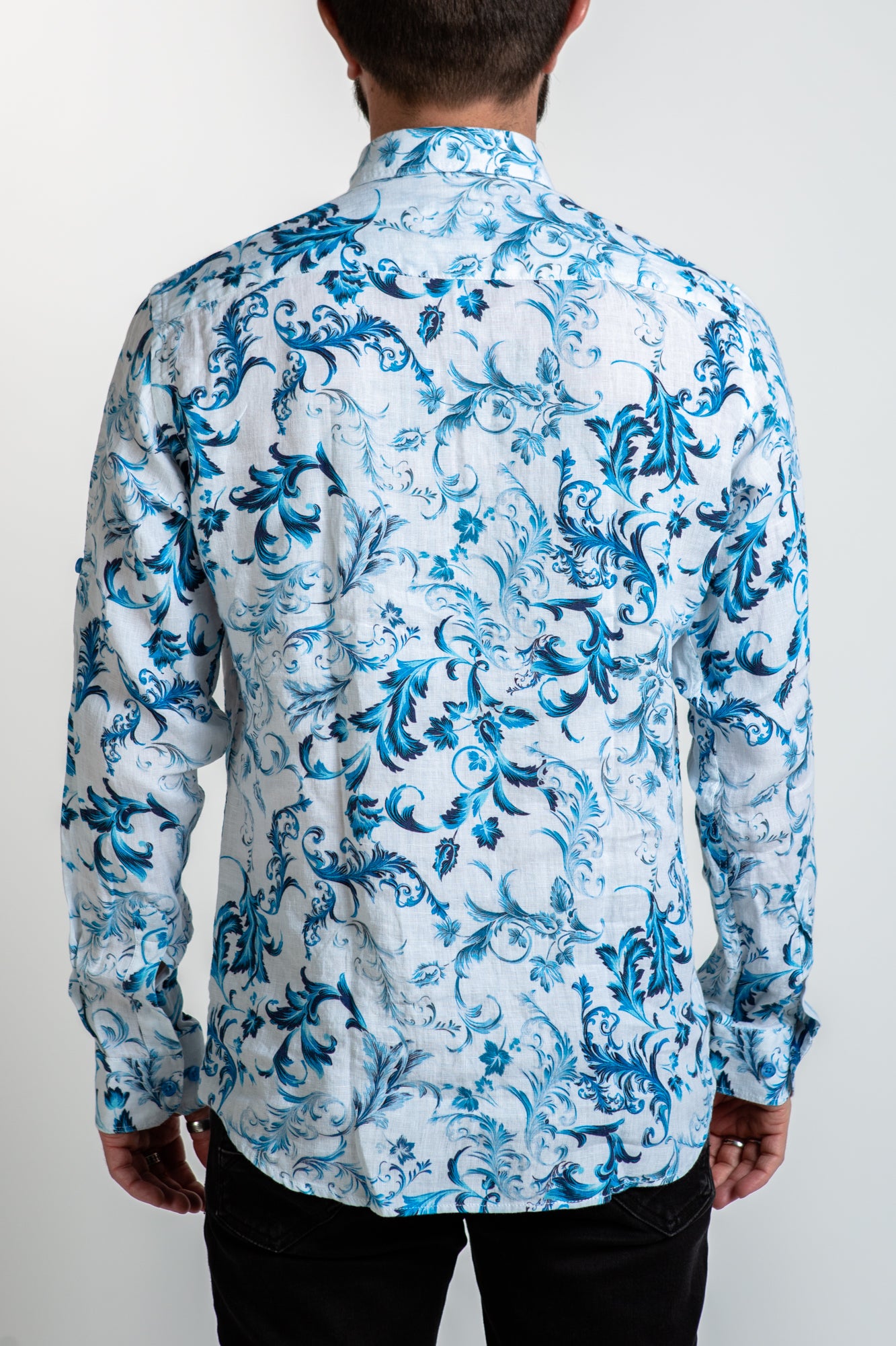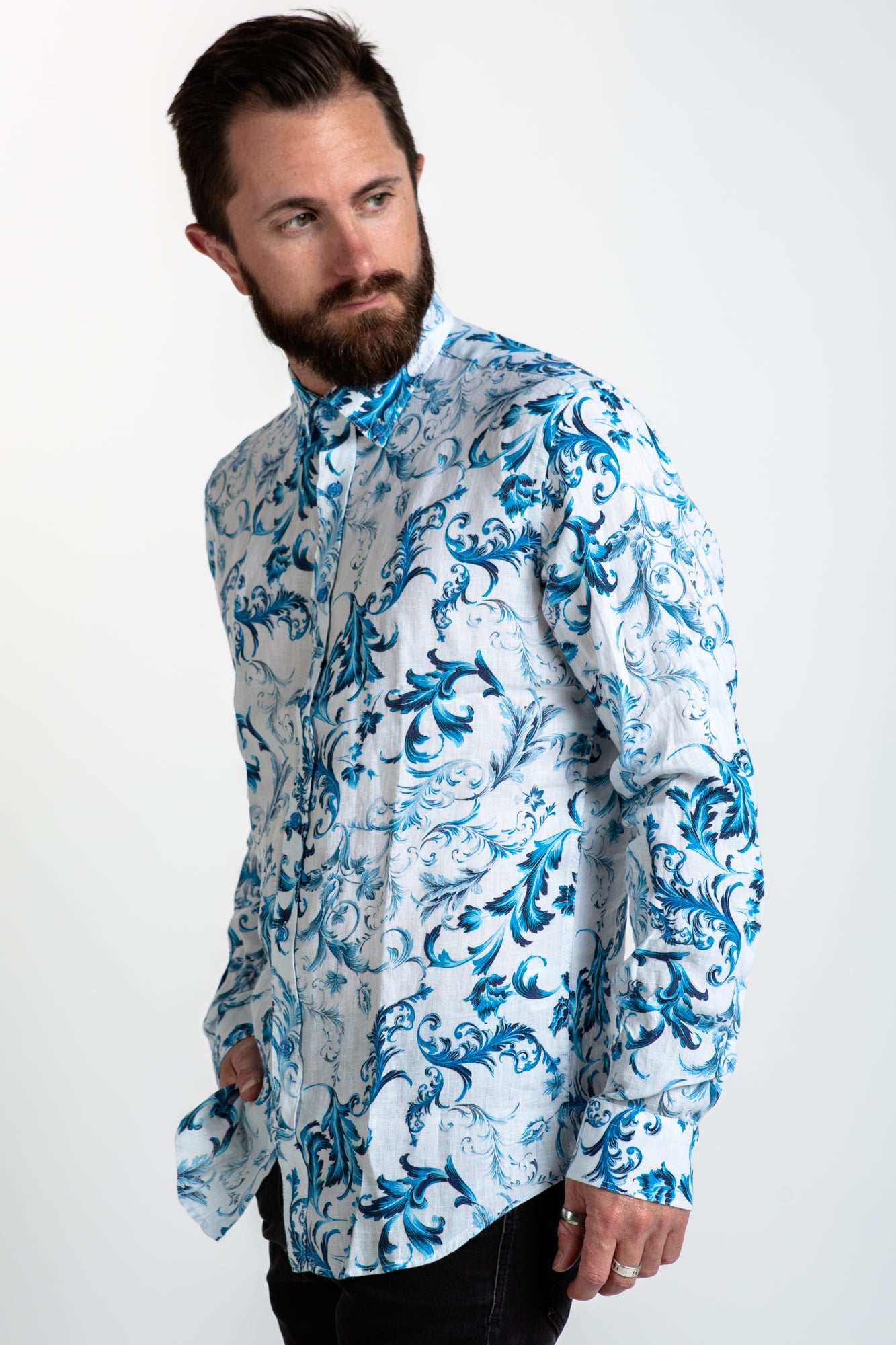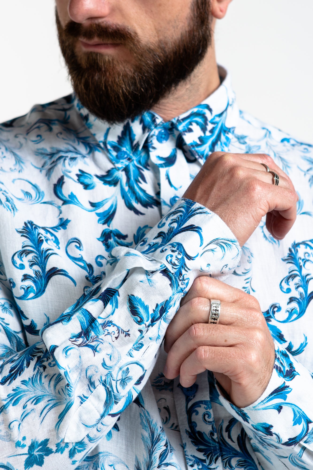 The LINEN SHIRT - ARAMIS brings classic style and a modern aesthetic. Crafted in 100% organic linen, it features a striking print, a collar, cuffs, and a button up closure. For a timeless look, it's the perfect choice.