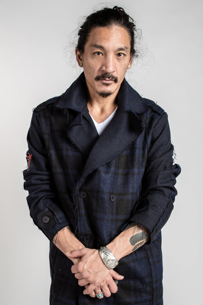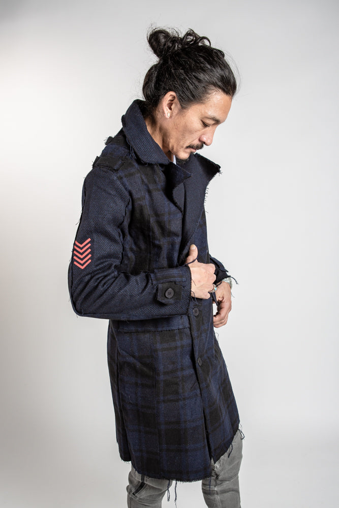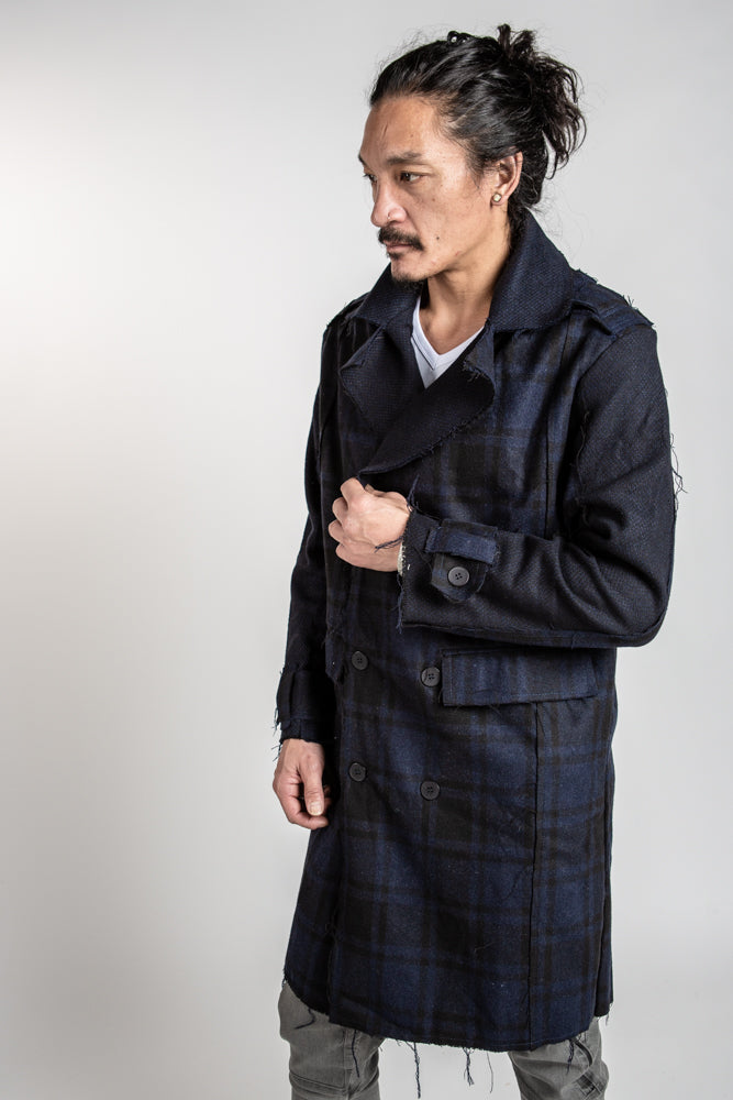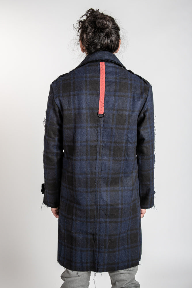 Experience the timeless elegance and fashion of a classic military-style trench coat. Crafted from premium cotton in a timeless navy colour, the coat features an exclusive plaid pattern, a double-breasted front, and an unfinished hem for a luxurious, sophisticated look.