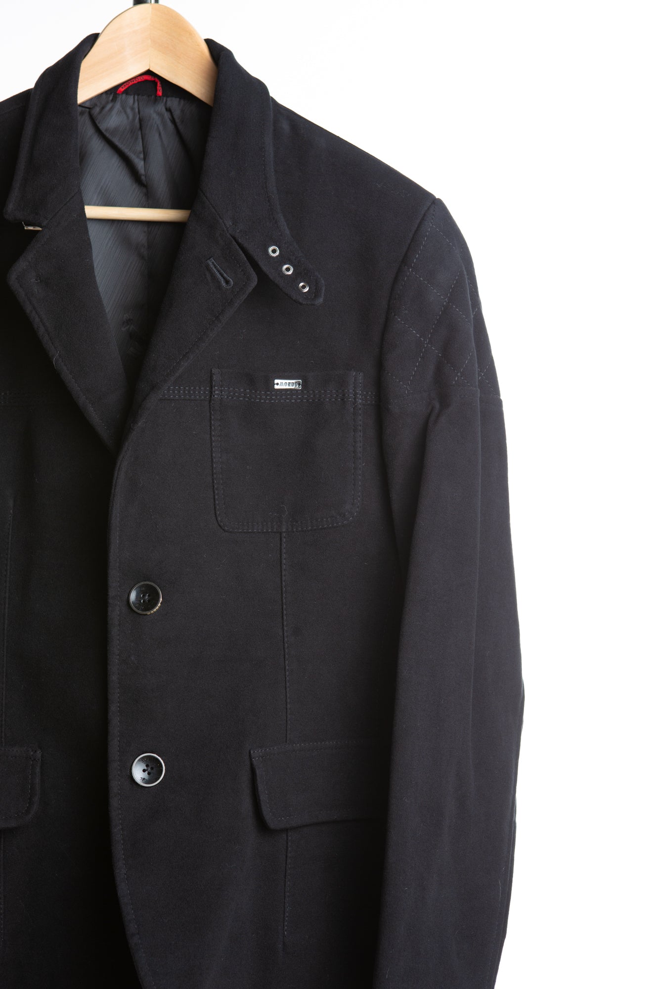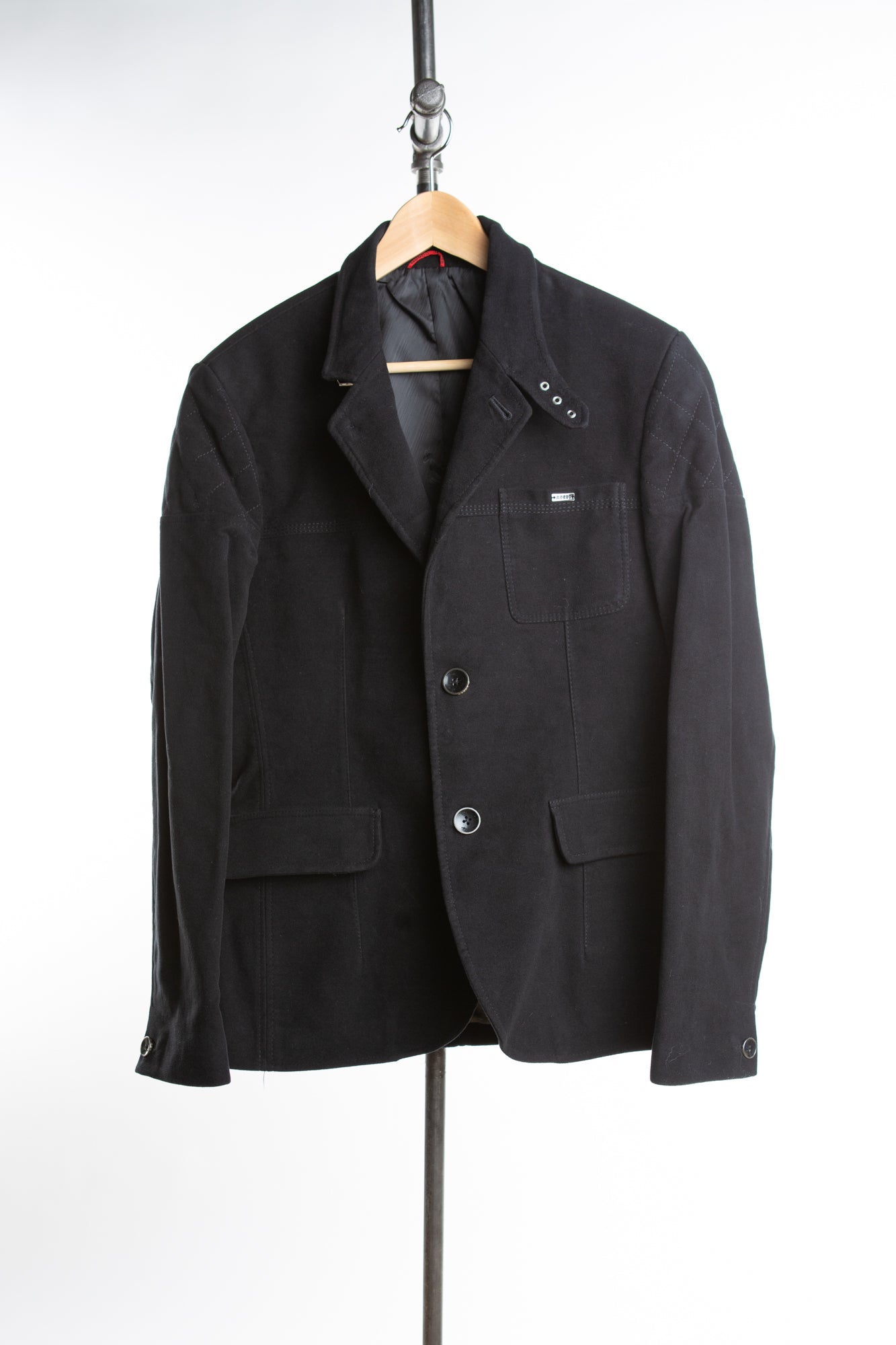 This black blazer is the perfect combination of style and comfort. Crafted from felted cotton and featuring two button closure, quilted shoulders, and a tailored fit, it will add a touch of sophistication to any look.
