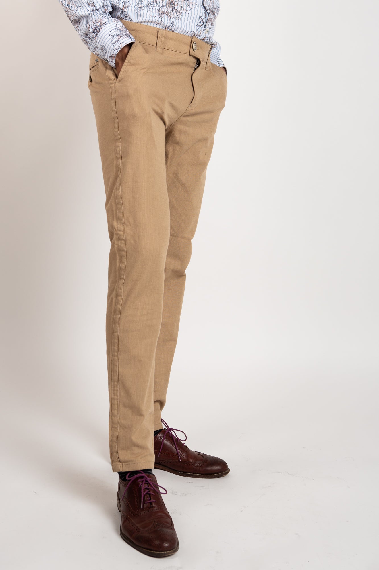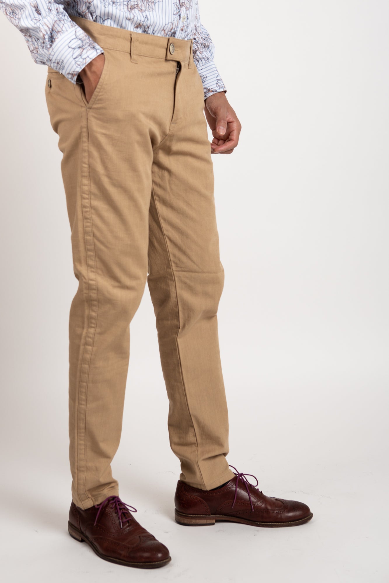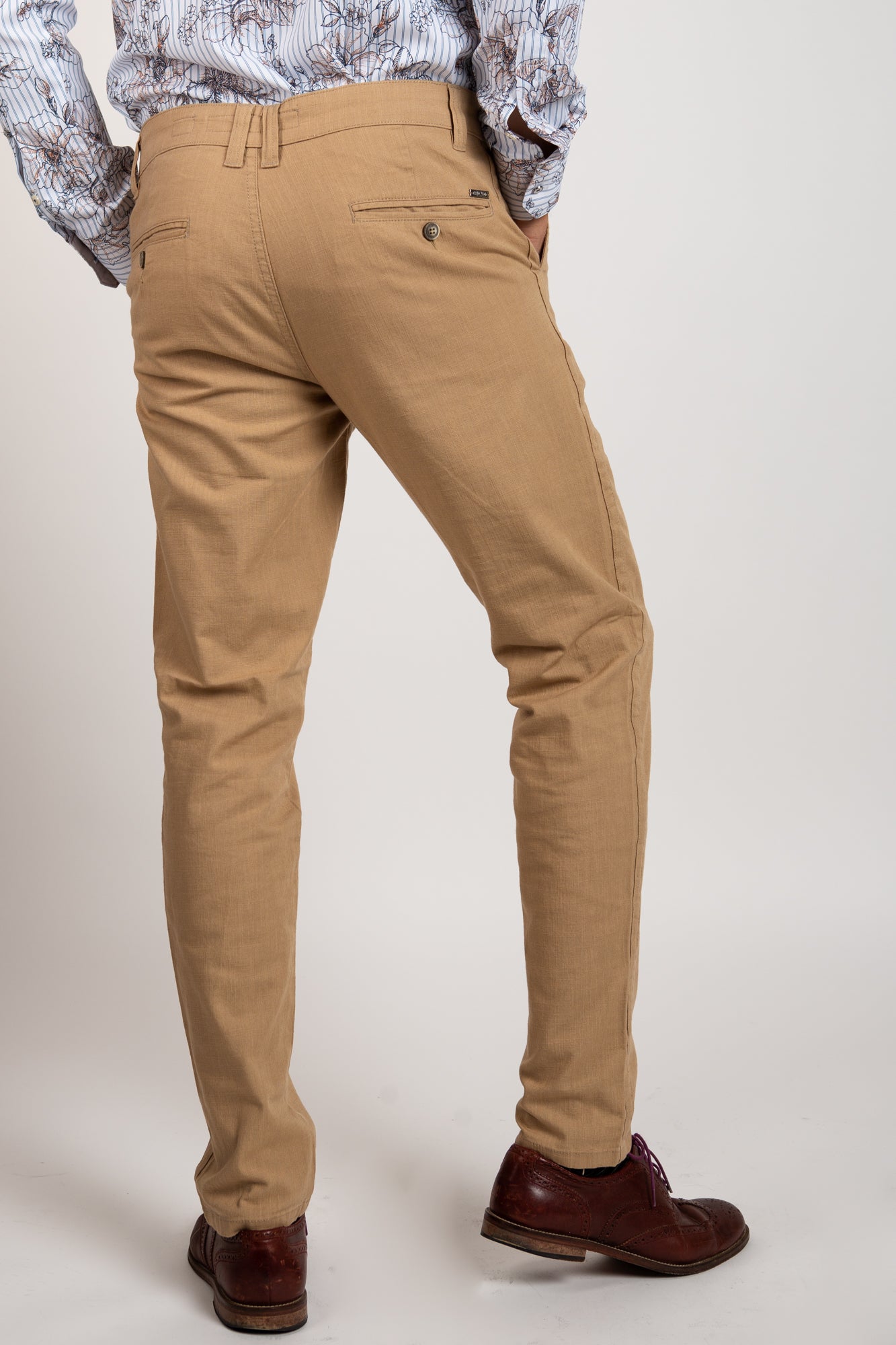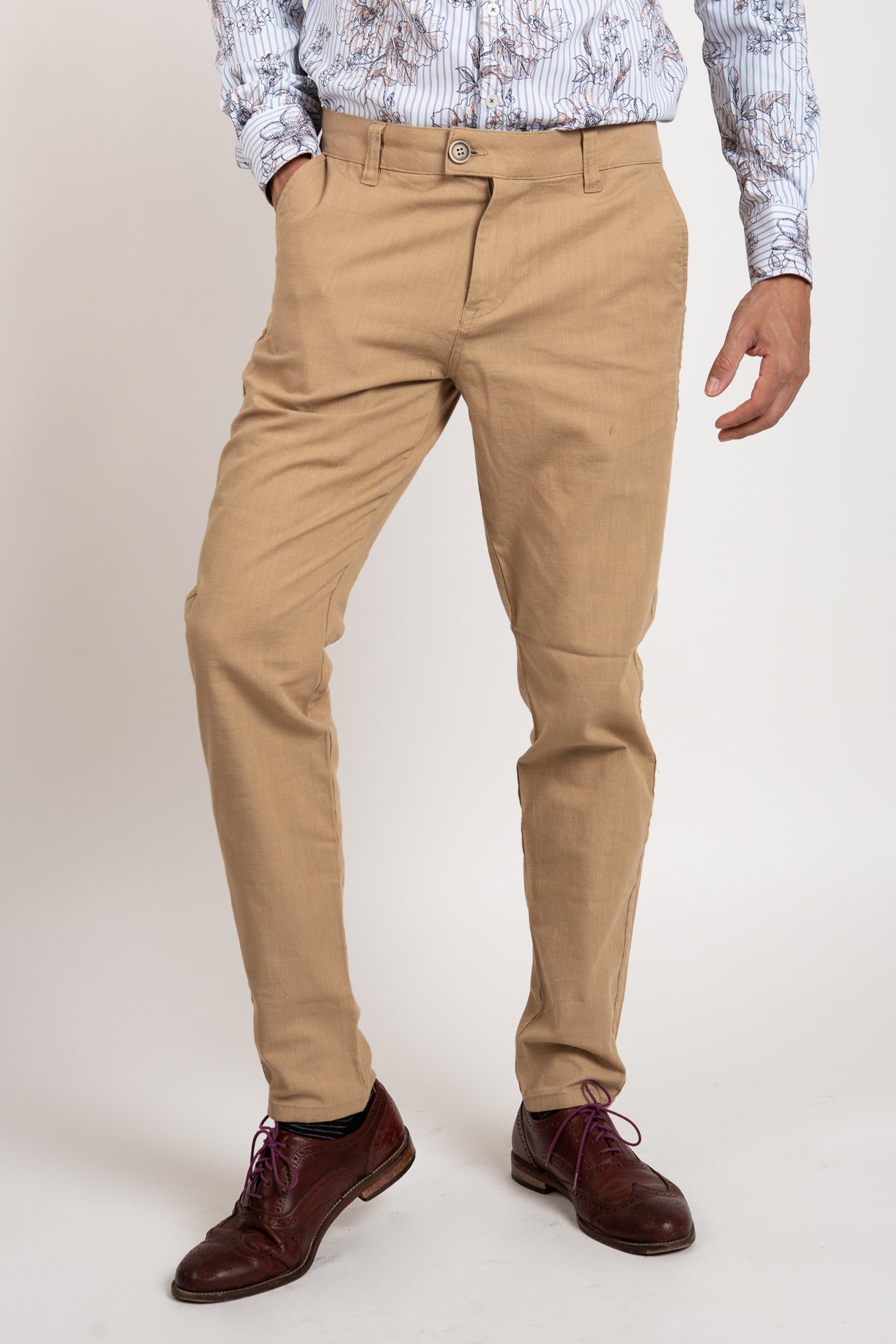 Men's linen chinos in tan. Dress them up for all kinds of events.