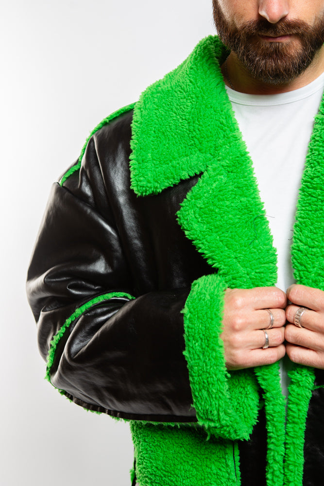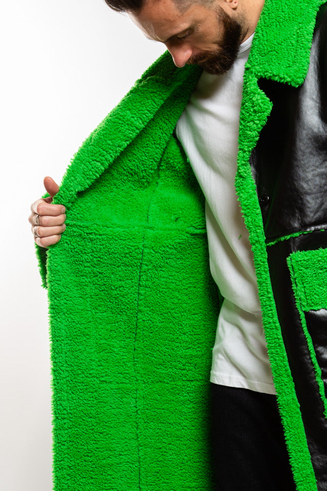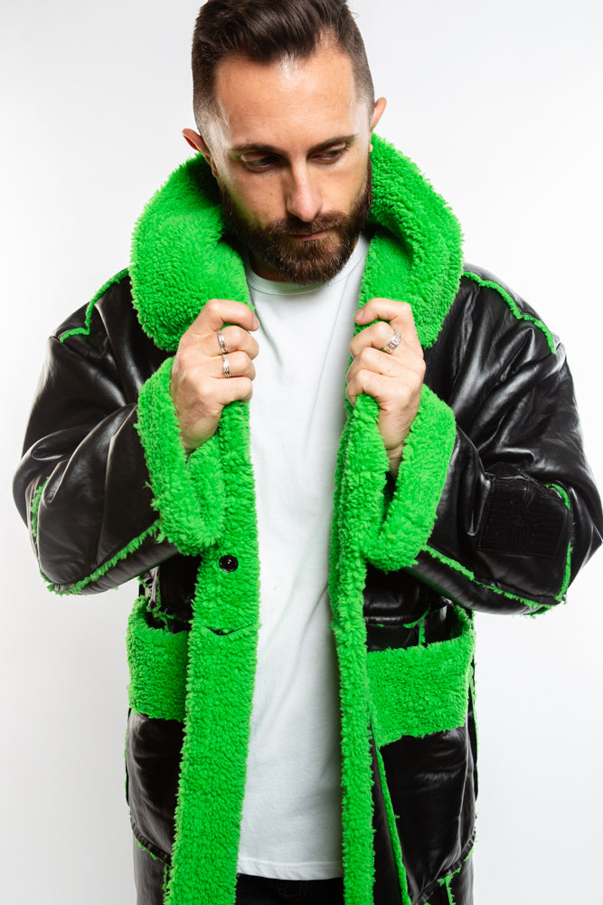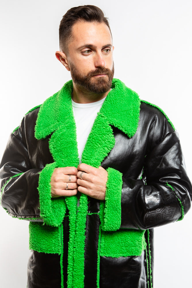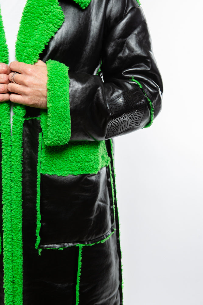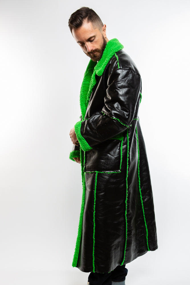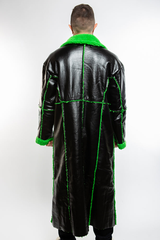 Upgrade your life with the Neo Coat in black. Crafted from high-quality, vegan leather, this coat is full-length and features a lime green fur trim. Futuristic, adds a chic and edgy touch to any ensemble. Killer style