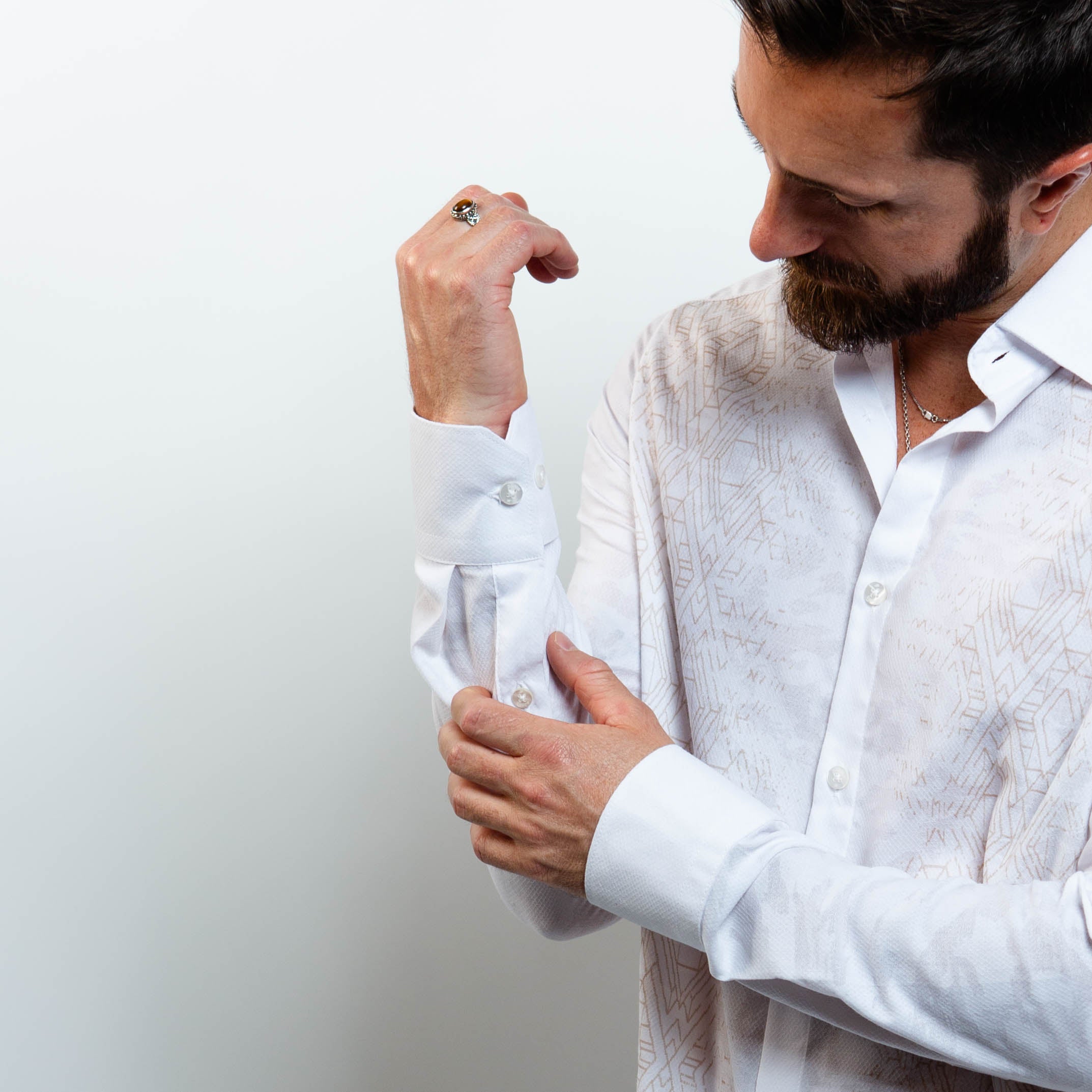 This shirt blends clean tailoring with textured storytelling, perfect for warm evenings, art openings, or coastal dinners. Finished with mother-of-pearl buttons and a smooth spread collar, it’s a piece that elevates without shouting.