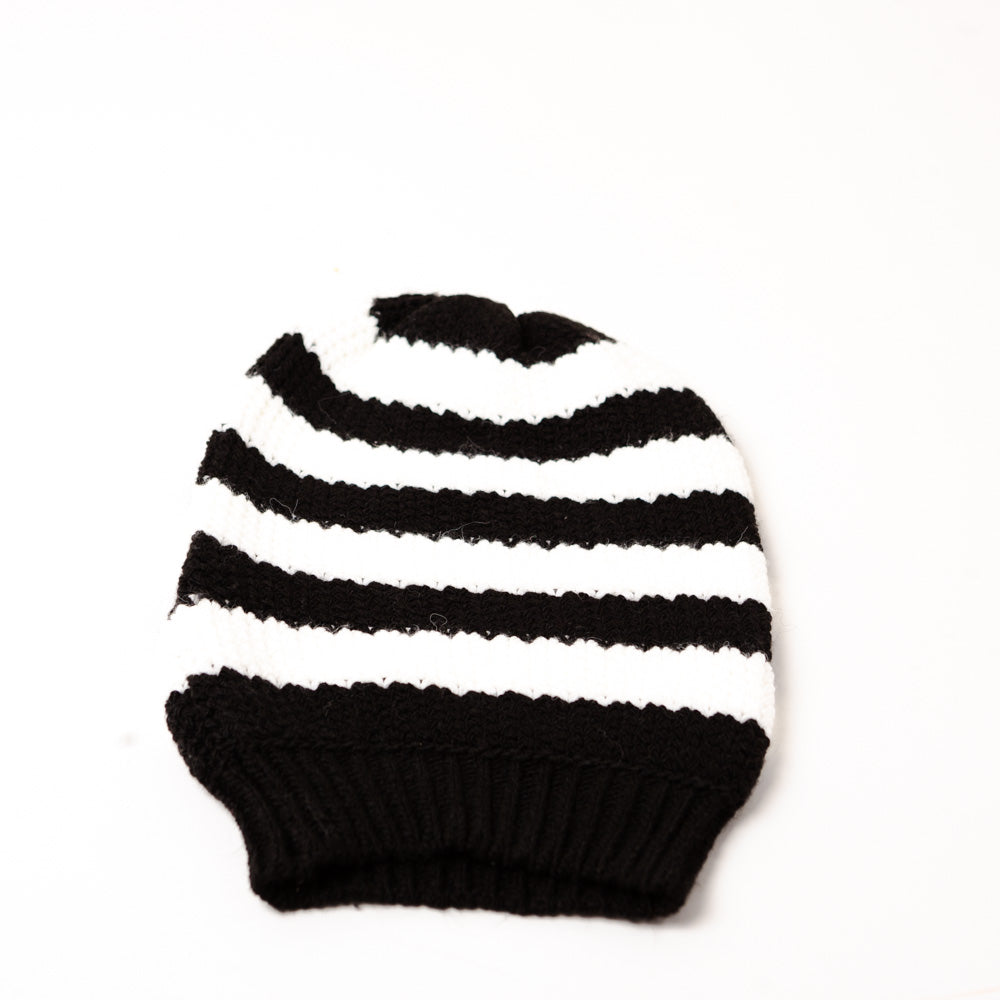 Oversized slouchy winter toque for men knit in black and white stripes.