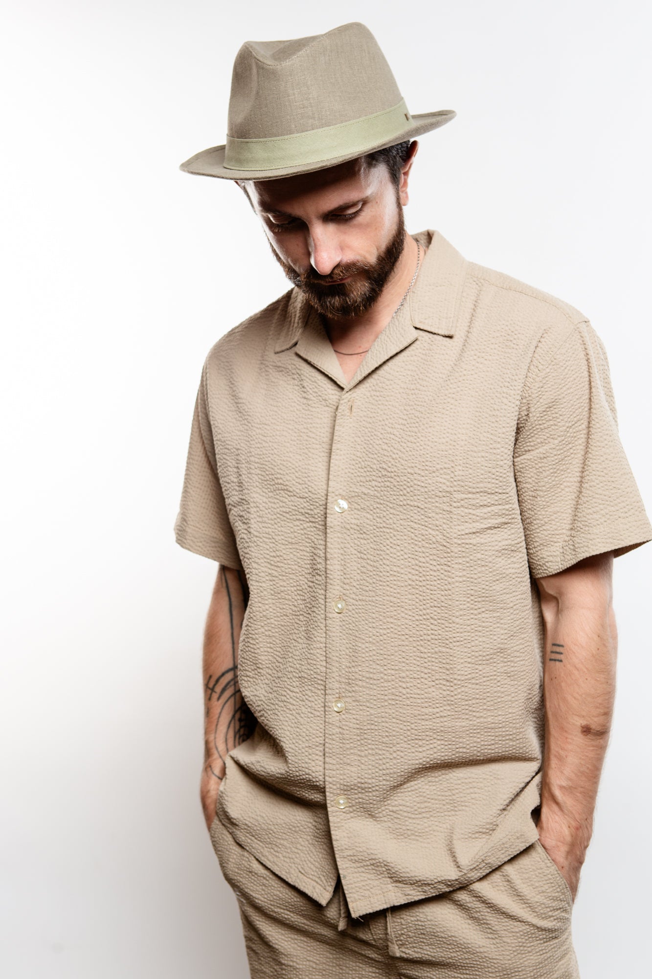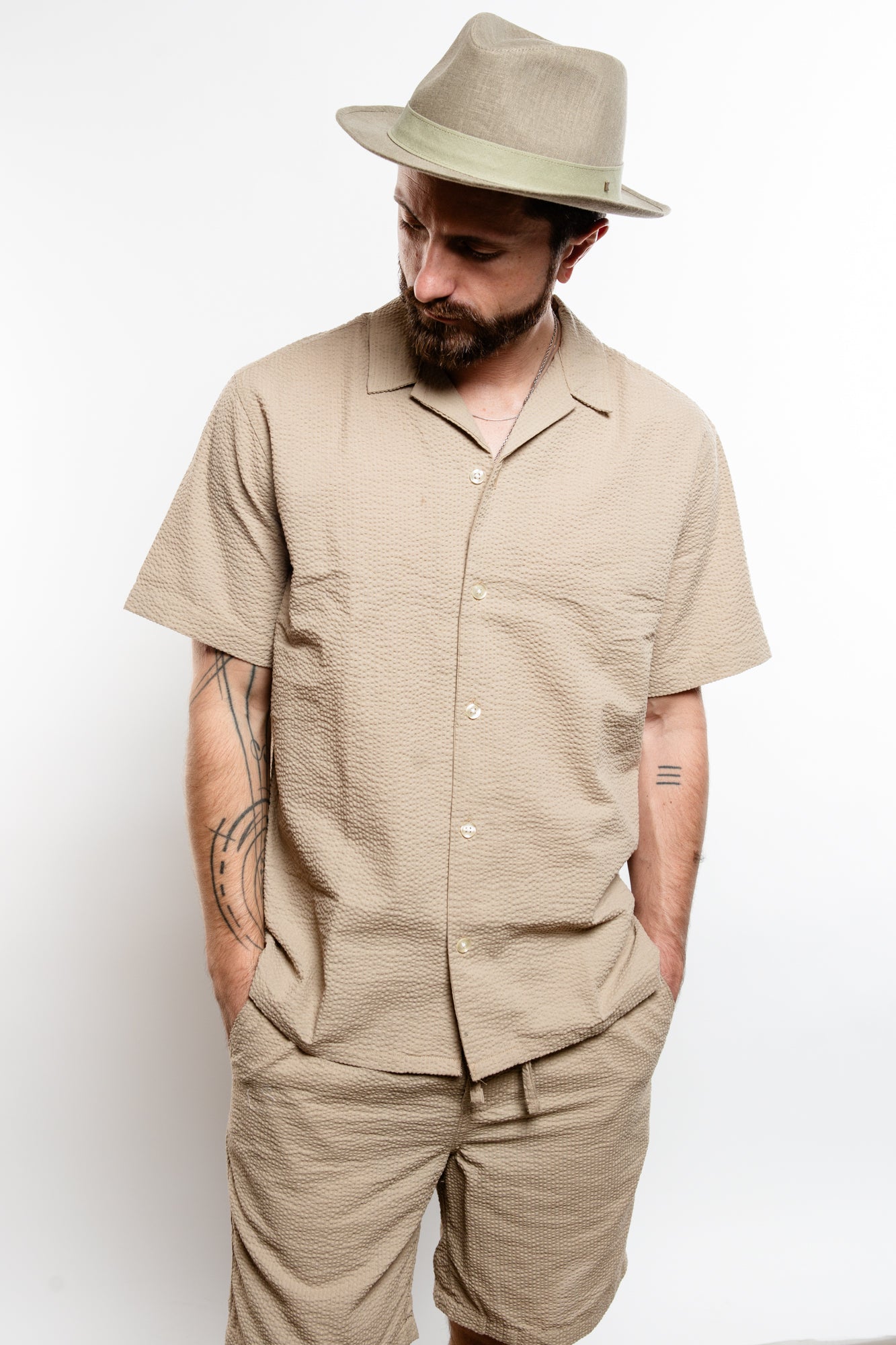 Embrace adventure with our Palma Short Sleeve Shirt in a tan pattern. Made from lightweight seersucker fabric, this relaxed fit shirt features a resort collar and button fastening for a timeless, breathable style. Upgrade your wardrobe and stay cool on any adventure!