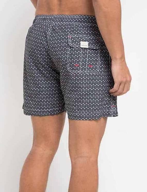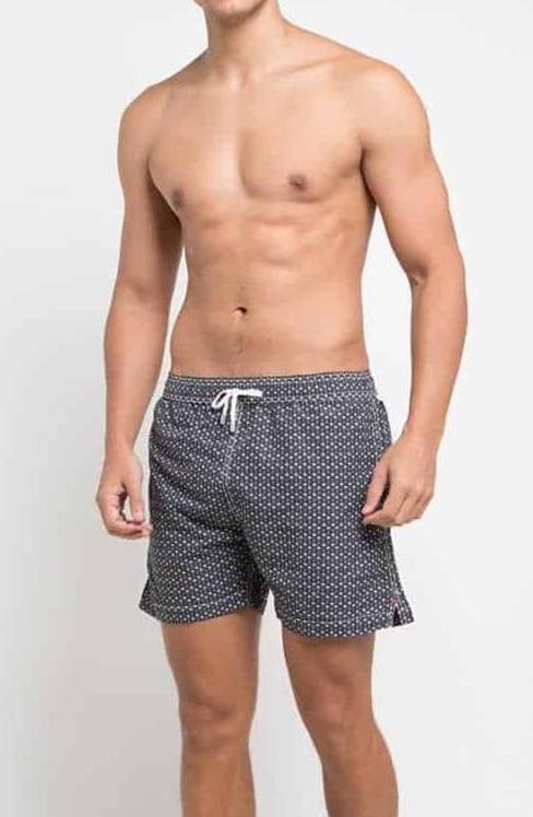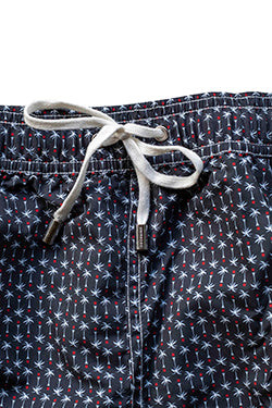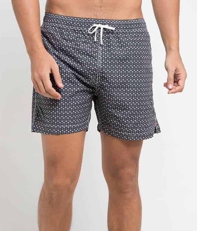 Men's mid-length swim shorts featuring palm trees print on a balck background.
